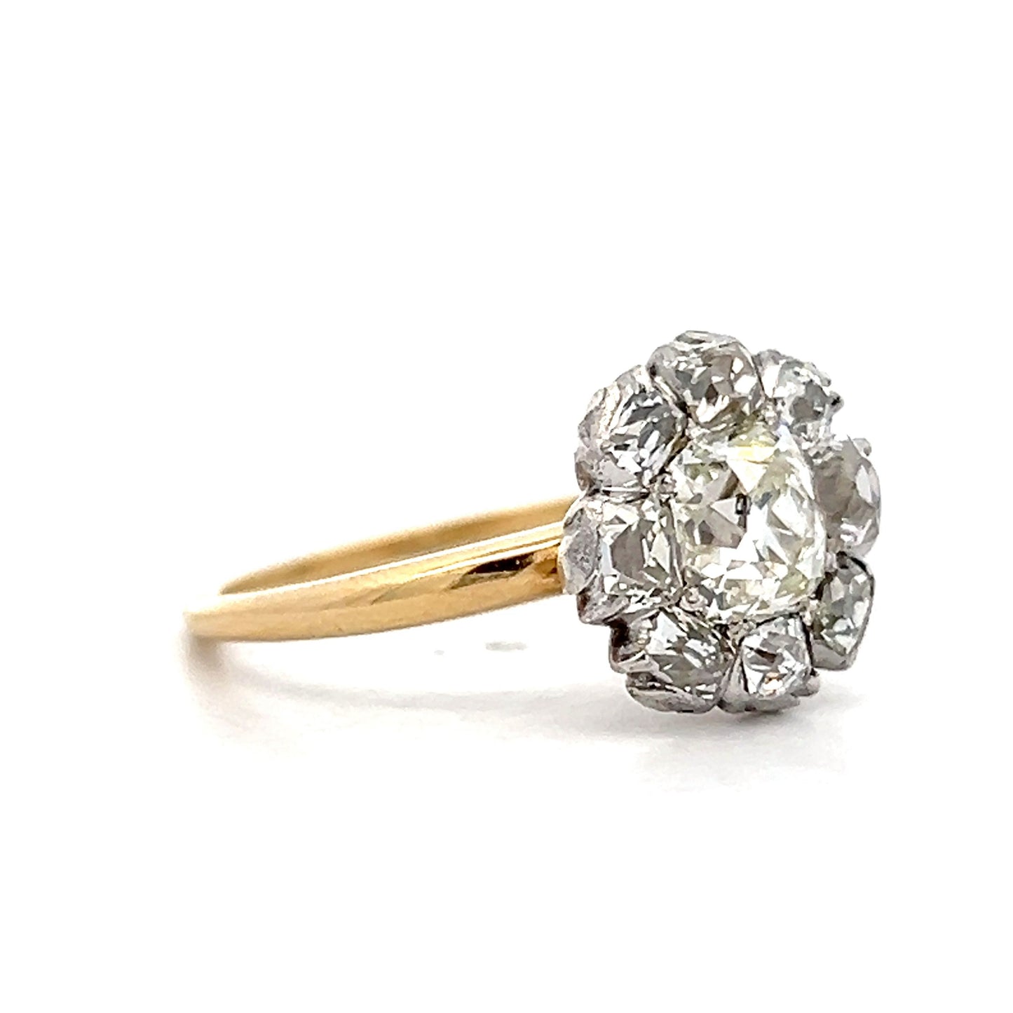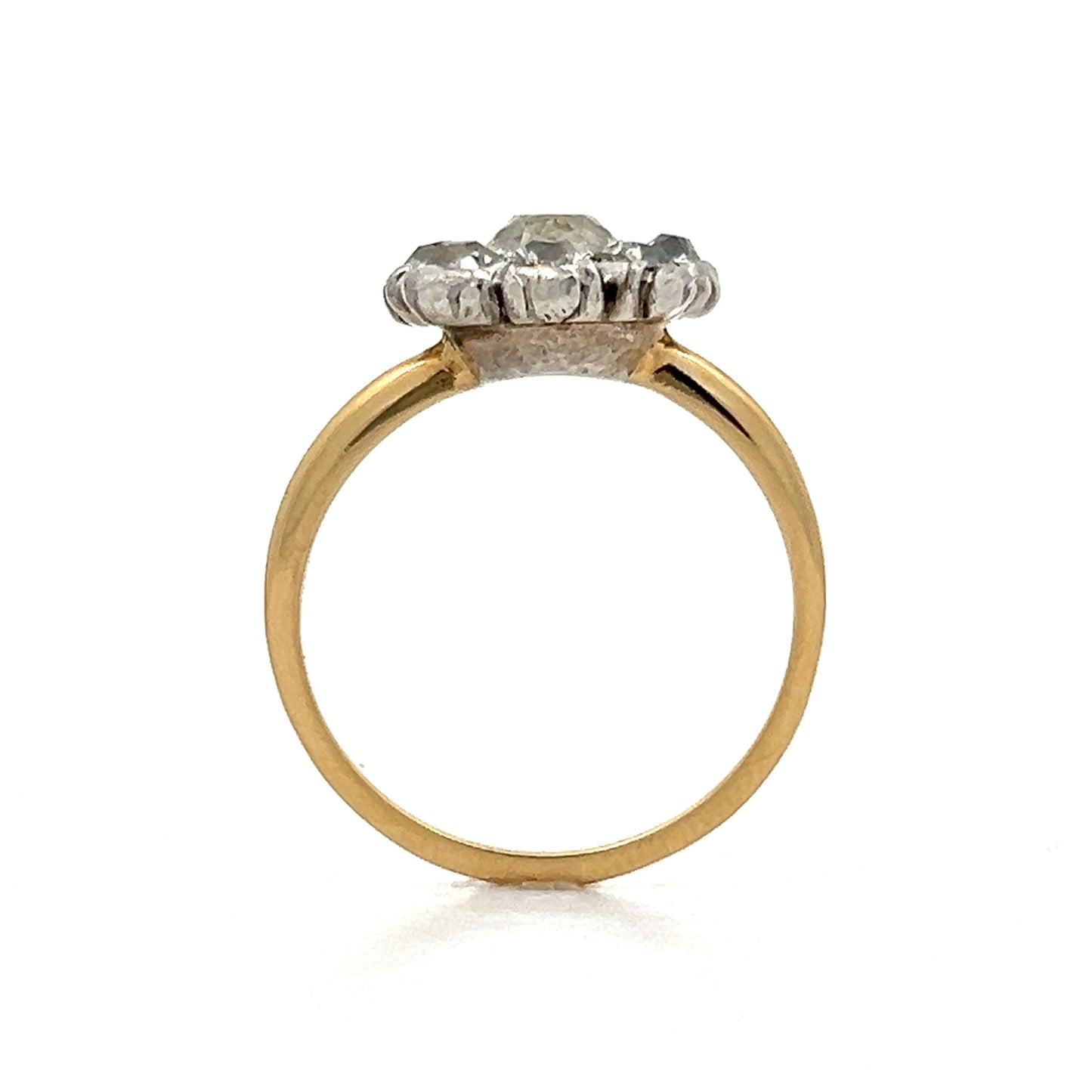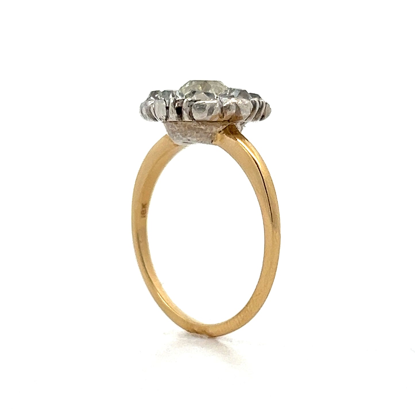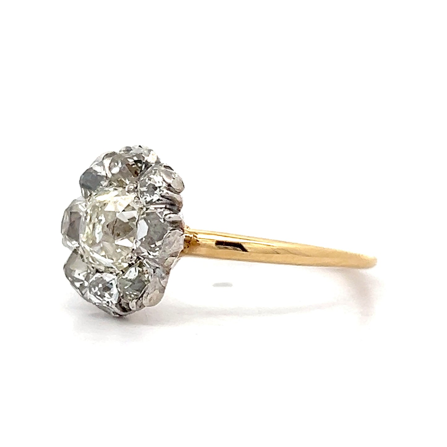 This antique Victorian engagement ring features a 1.05-carat old mine cut diamond with SI2 clarity and K color. The centerpiece is surrounded by a halo of eight accent diamonds, each weighing .14 carats and measuring 3.25 mm, totaling 1.12 carats. These diamonds are set in sterling silver, which enhances their brilliance and contrasts with the polished 18-karat yellow gold band. The combination of metals and the flower-inspired cluster design make this piece a unique and easy to wear low profile ring.