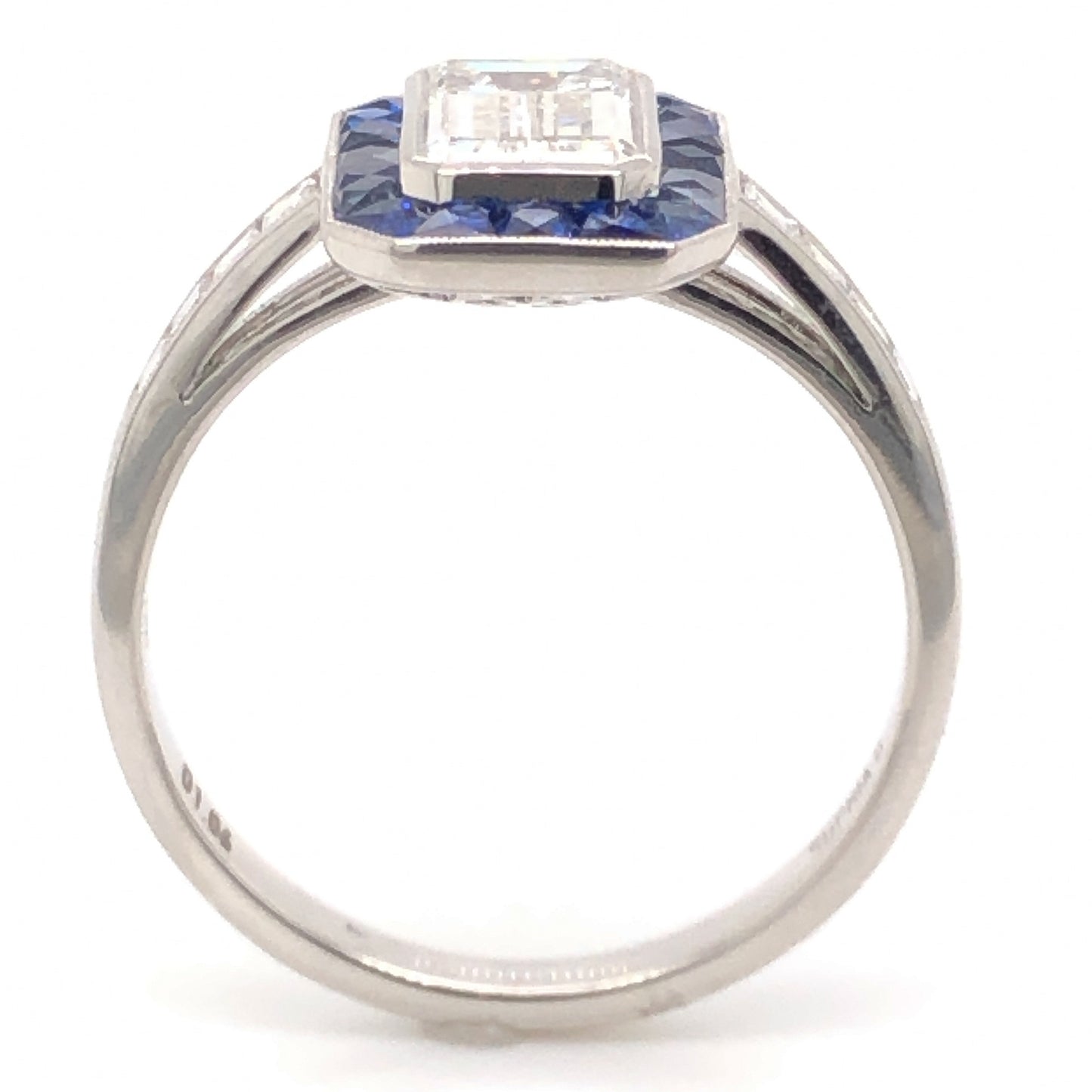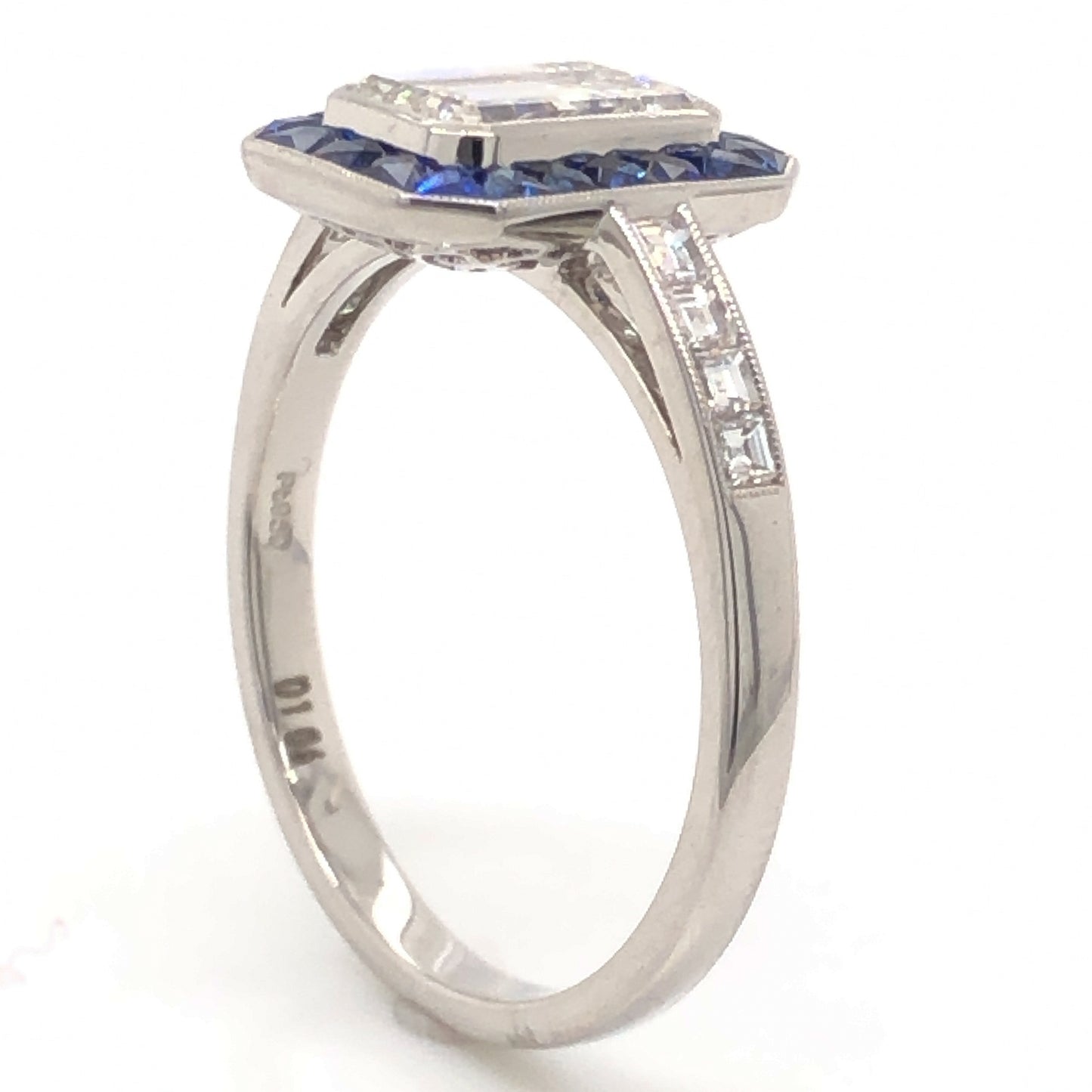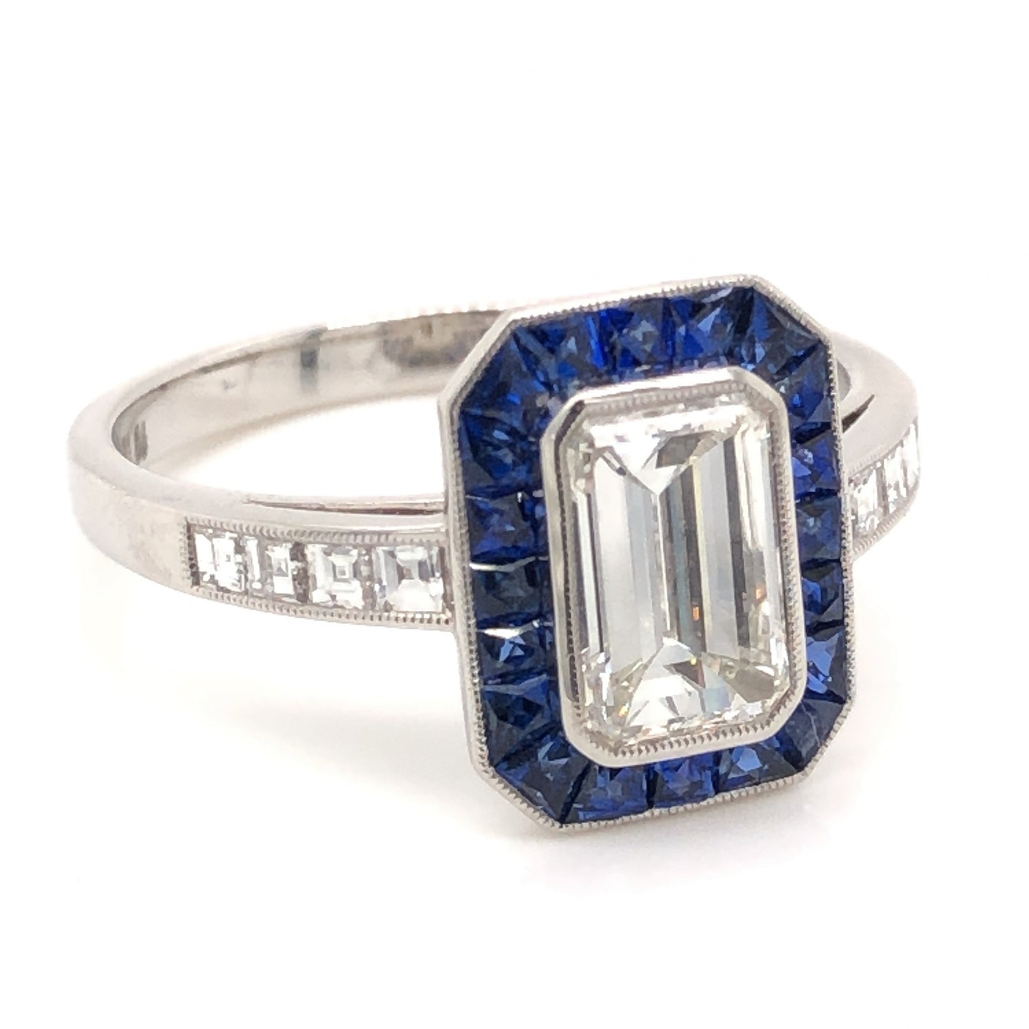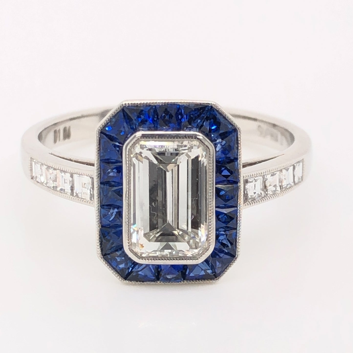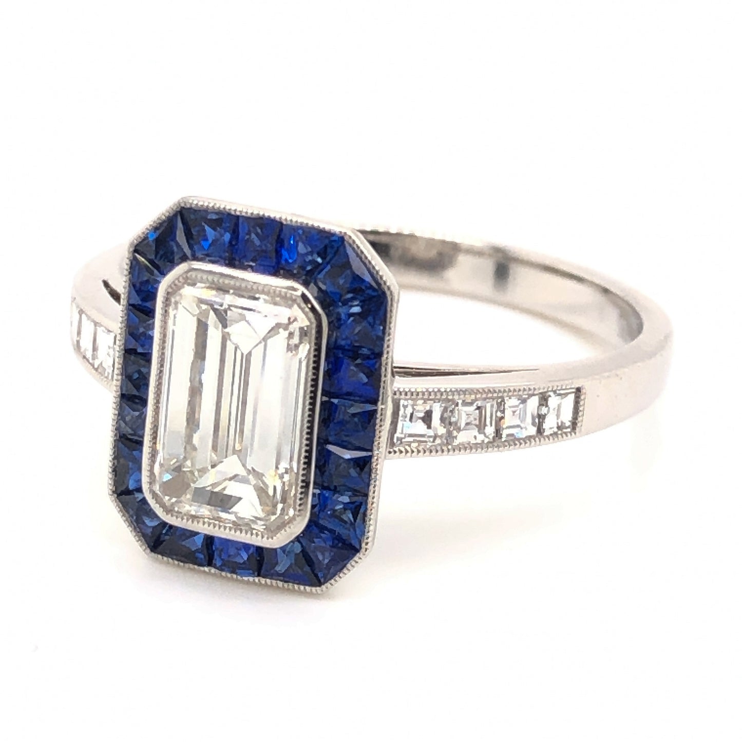 1.06 Emerald Cut Diamond Sapphire Ring in Platinum. This modern engagement ring features a 1.06 carat emerald cut diamond, .65 carats of sapphires and .80 carats of accent diamonds set in platinum. The center diamond is bezel set with fine milgrain detail and surrounded by a lovely halo of twenty (20) .032 carat dark blue sapphires. Along the shoulders, eight (8) .10 carat sparkling diamonds are channel set, finished on a polished platinum band.