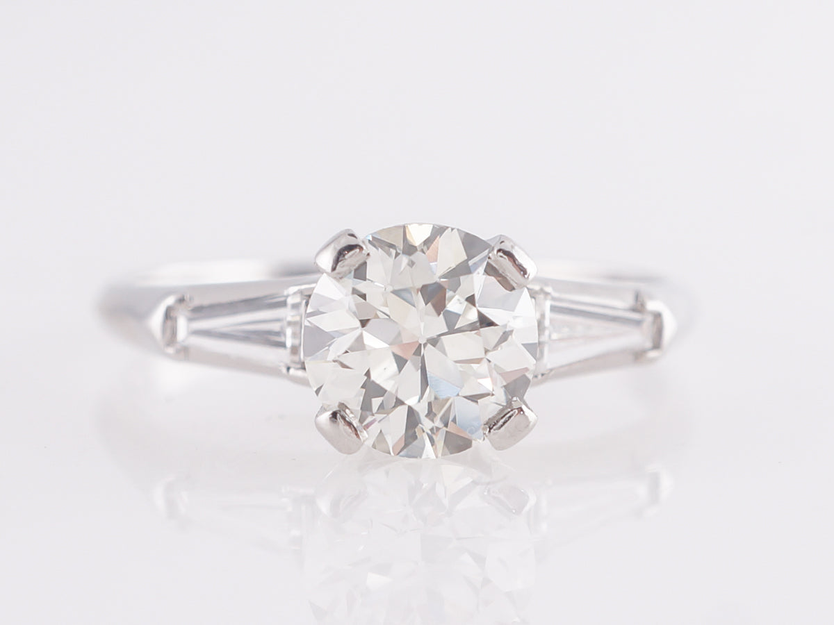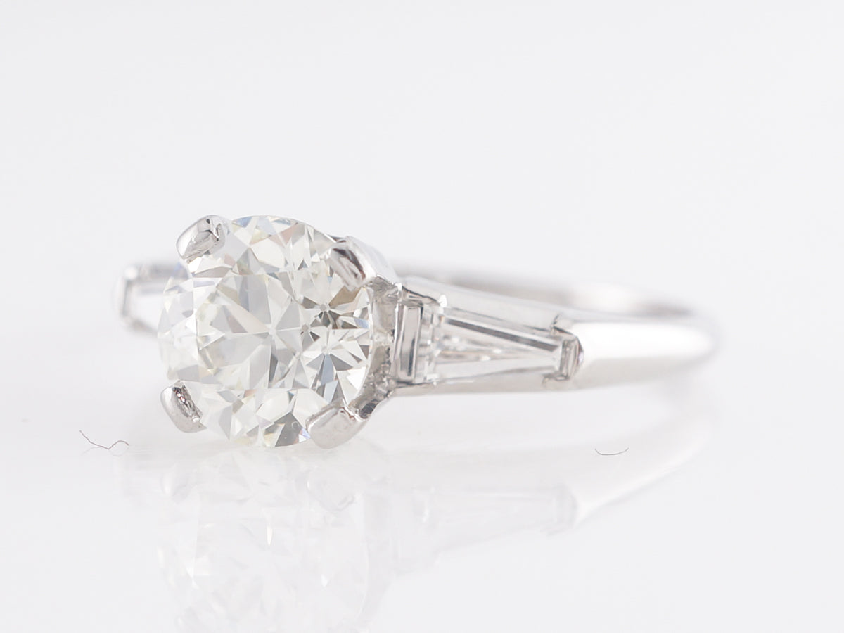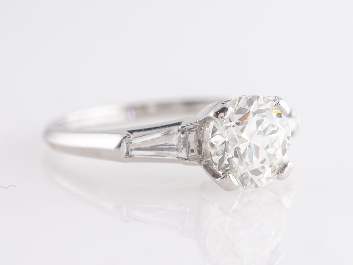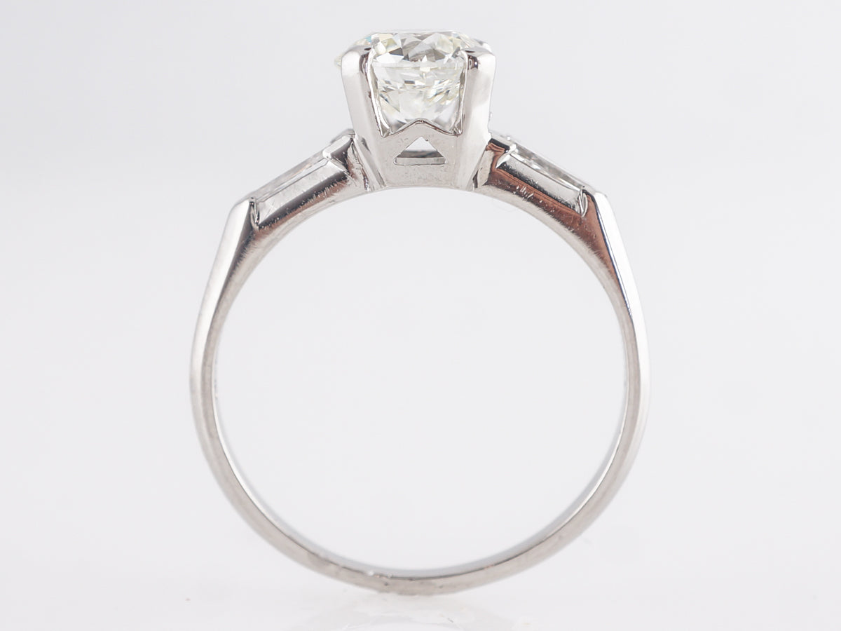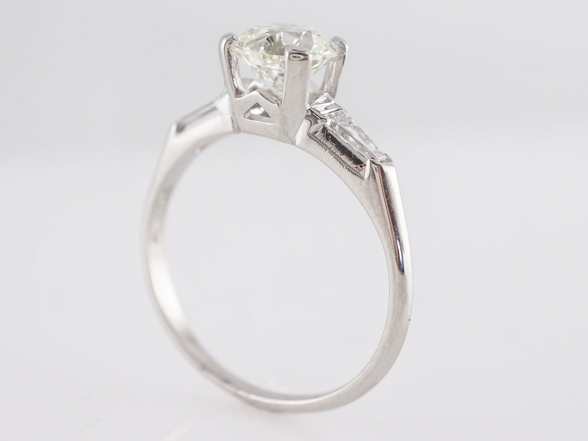 1.07 Mid-Century Round Diamond Engagement Ring in Platinum. This Mid-Century engagement ring features a 1.07 carat Old European cut diamond set in platinum. Accented by tapered baguettes across the shoulders, this clean design looks great next to any wedding band as the diamond is held by large flat prongs. A great choice for someone looking for a simple and elegant look that is truly timeless.