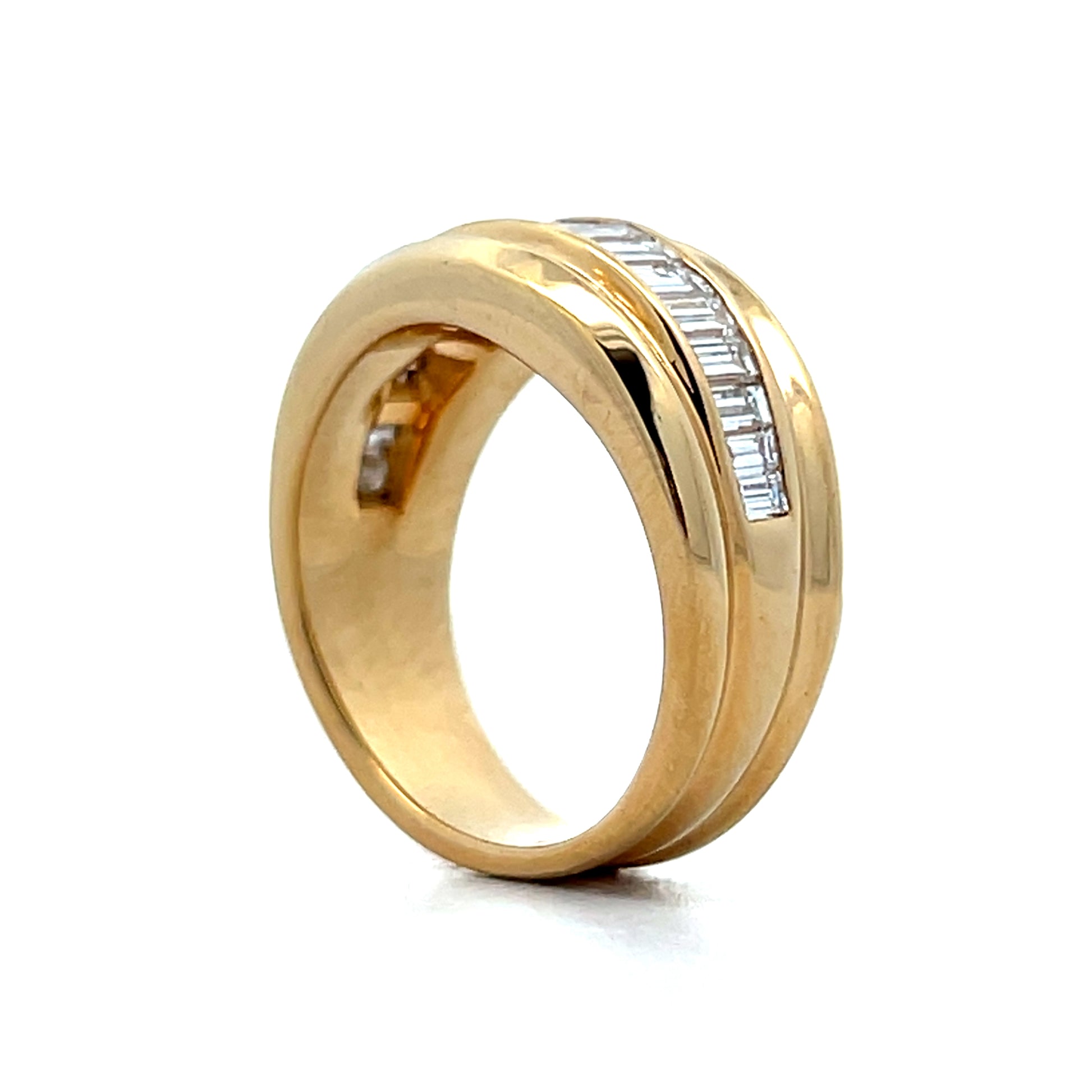This diamond stacking ring features 1.08 carats of baguette cut diamonds with H color and VS2 clarity, channel set in 18 karat yellow gold. The baguette diamonds line the band and taper in size toward the bottom. The yellow gold band has knife edge detailing and tapers for comfort. The straight lines of the baguette diamonds contrast with the angular edges of the band