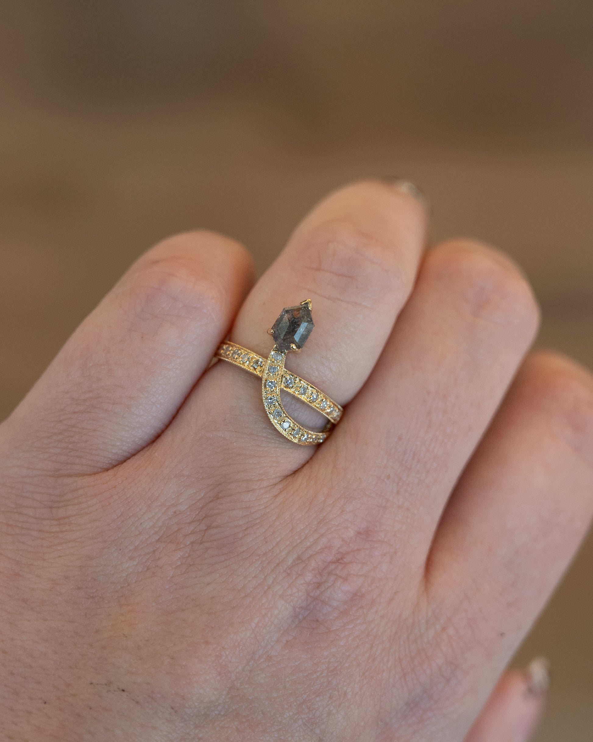 This snake cocktail ring features a 1.08 carat hexagon cut salt and pepper diamond set in the snake's head, with the body made of 18 karat yellow gold. Twenty-two round brilliant cut diamonds, each measuring 1.2mm and weighing .01 carat, are set along the coiling body for a total diamond weight of 1.30 carats. The snake design wraps around the finger in a continuous coil. The salt and pepper diamond displays natural light and dark inclusions throughout the stone.