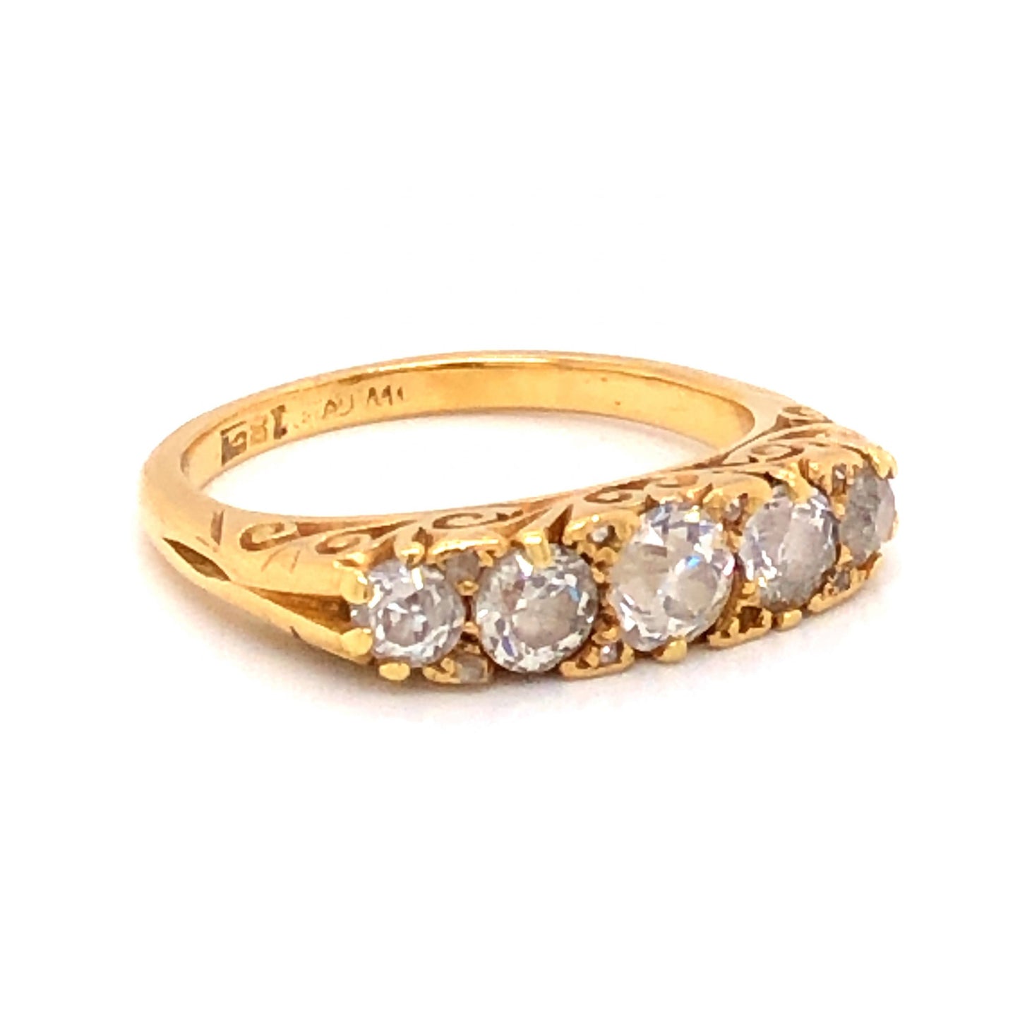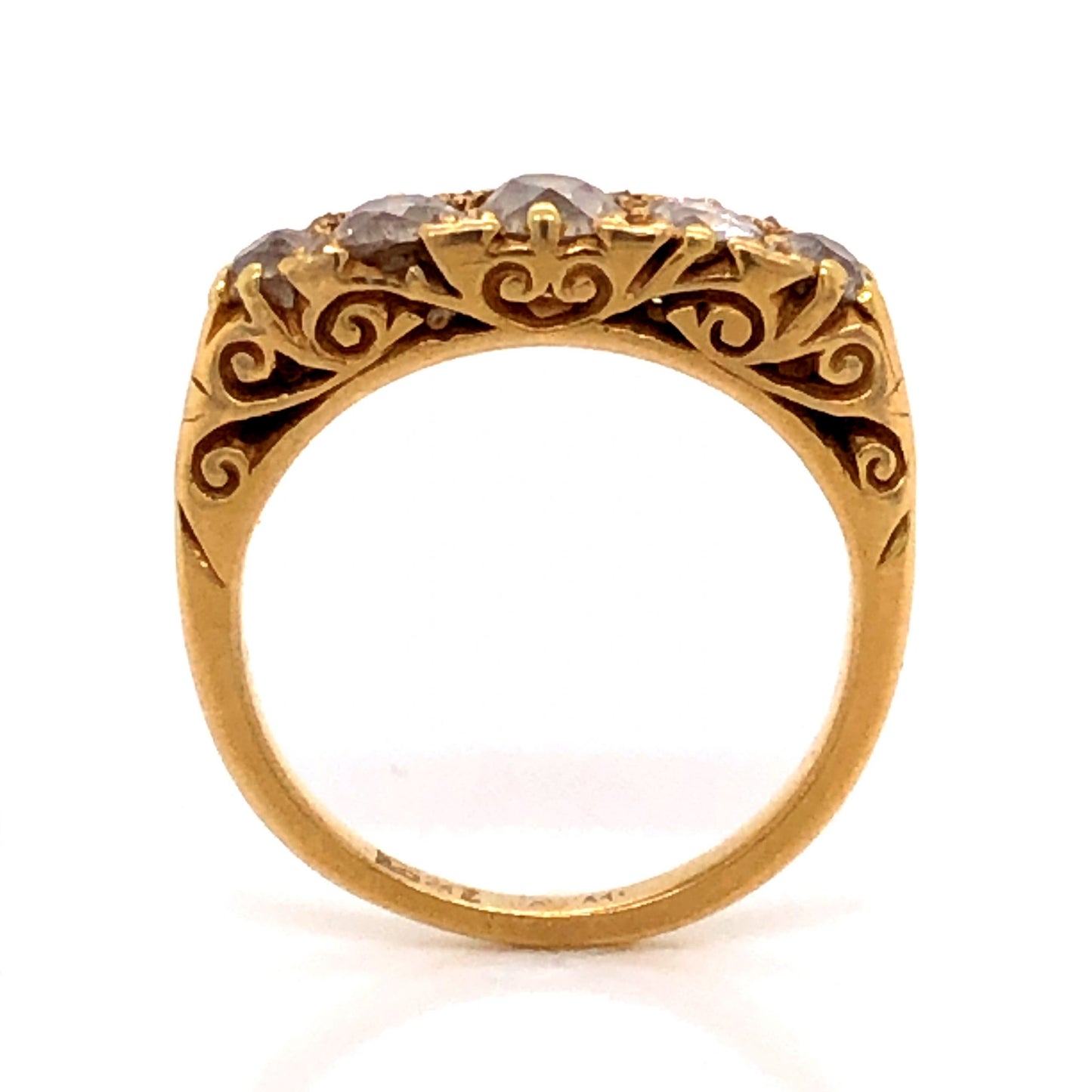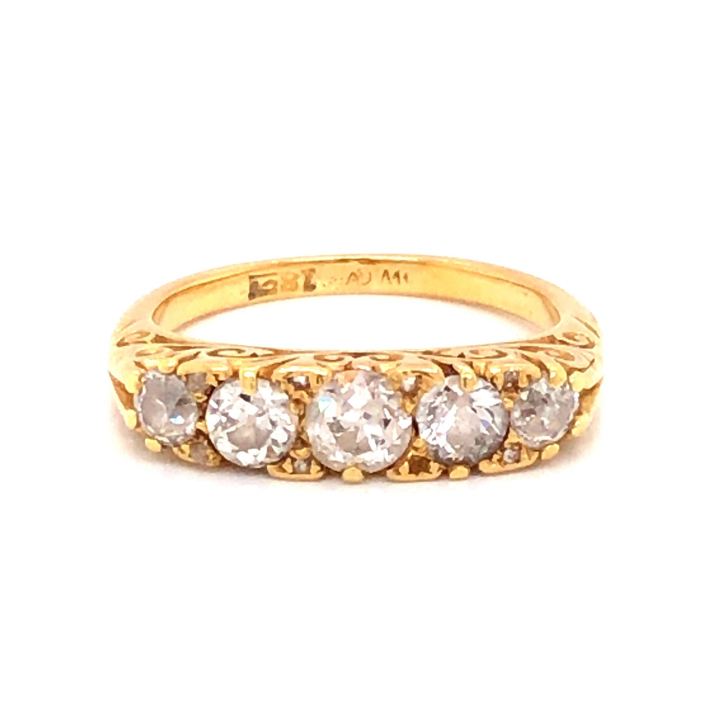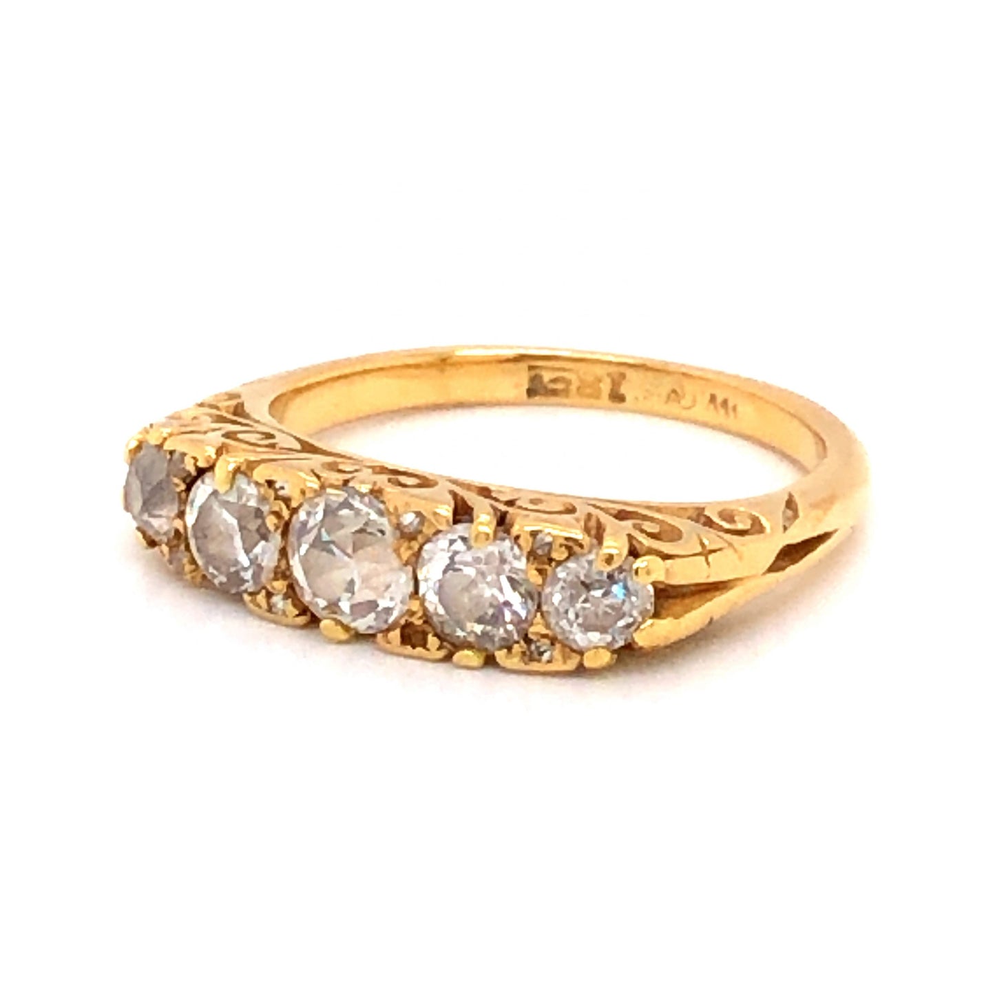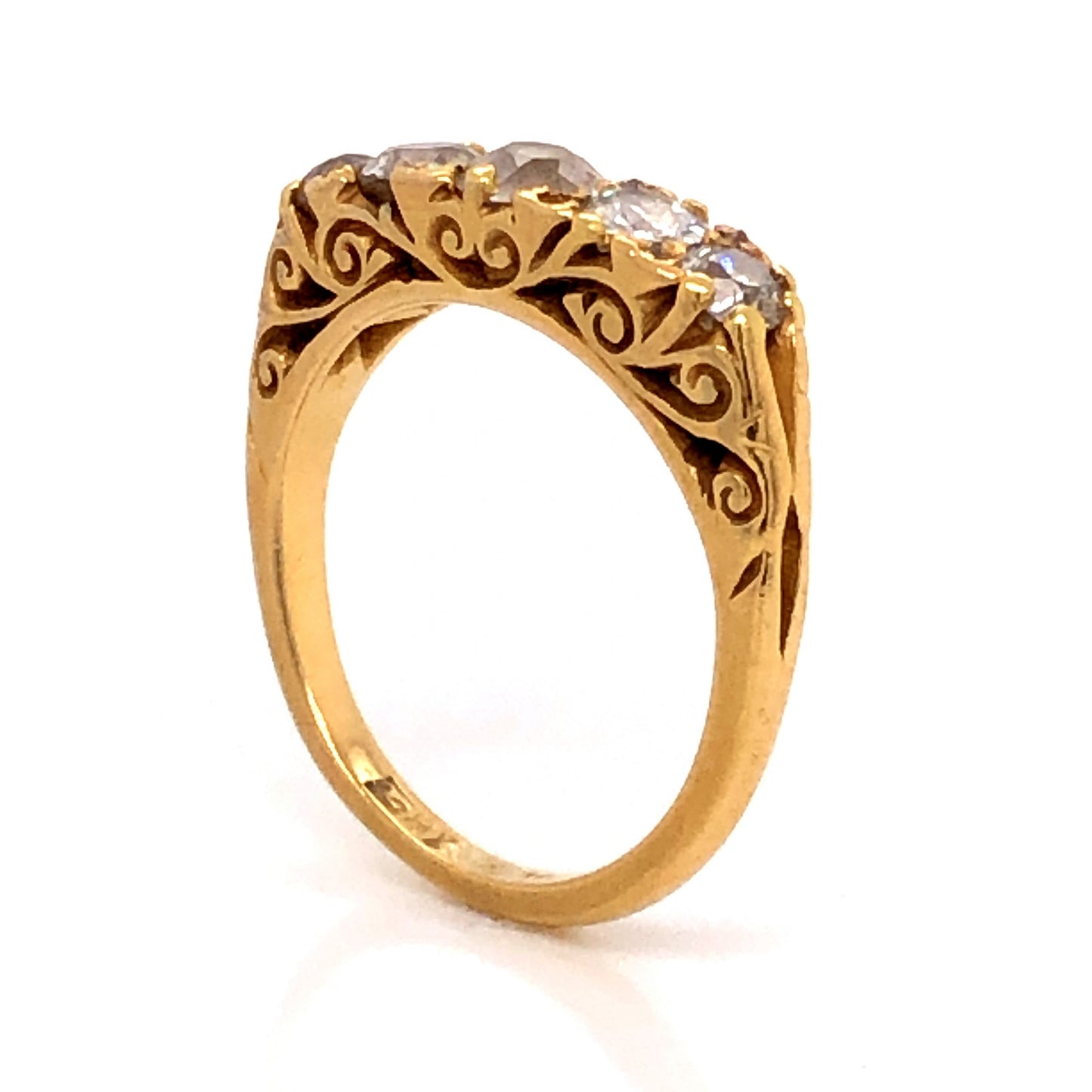 1.09 Victorian Mine Cut Diamond Cocktail Ring in 18K Yellow Gold. This Victorian cocktail ring features 1.09 carats of old mine cut diamonds finished in 18 karat yellow gold. The center diamond weighs .35 carats and is accented by two (2) .28 carat and two (2) .09 carat old mine cut diamonds. Each glittering diamond is near colorless and eye clean. The diamonds are prong set on an ornate, Victorian engraved mounting. A small inscription of “18K” is stamped on the inside of the shank, ensuring it is 18 karat yellow gold.