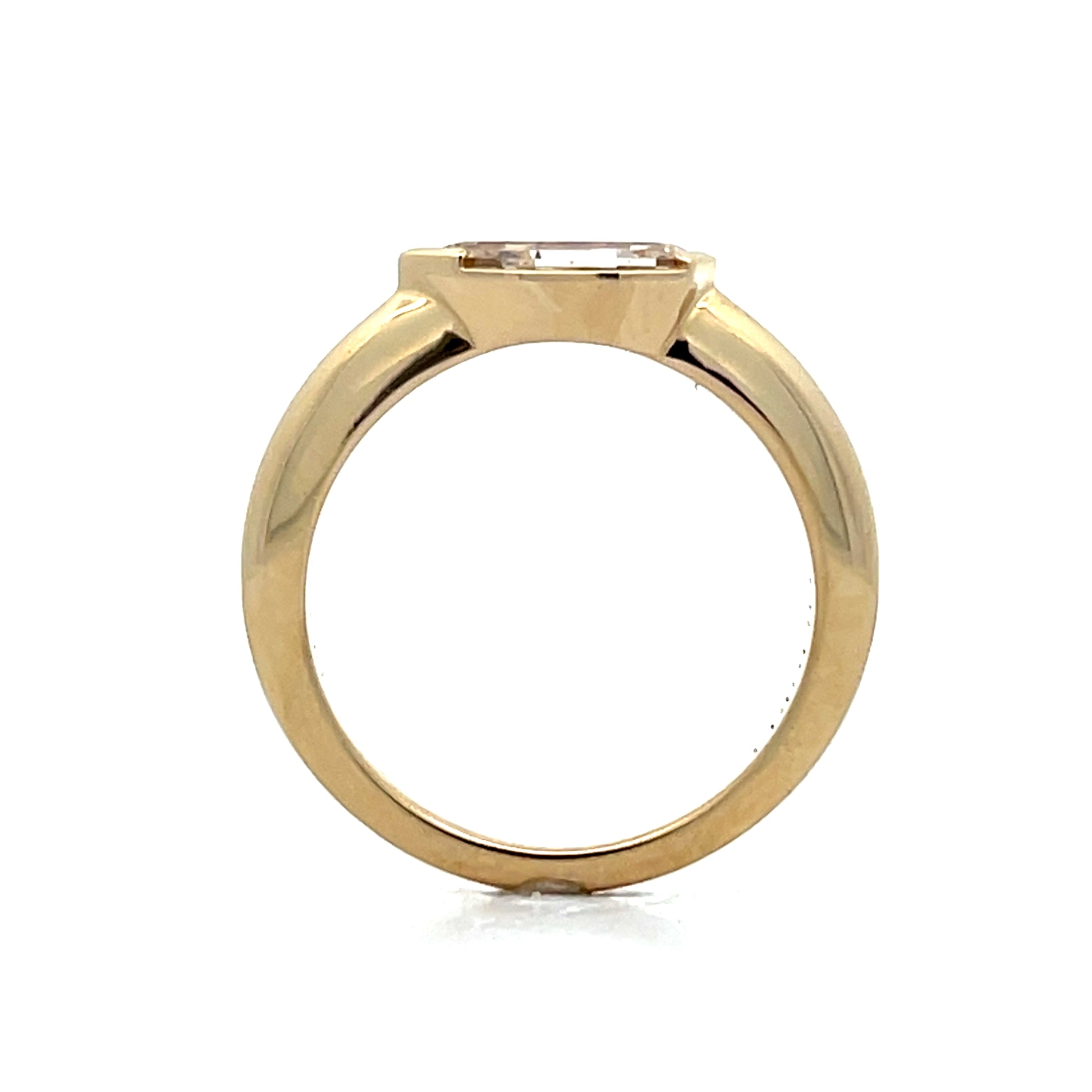 This pear-step cut diamond ring features a unique light yellow to fancy light brown 1.10 carat diamond (VS2 clarity) set horizontally in a bezel setting. Handmade 'By Filigree' in 14 karat yellow gold, the design lets light play through the diamond's facets from every angle. The band gradually narrows toward the back for comfort while wearing. The east/west orientation of the diamond gives this solitaire engagement ring a distinctive look.