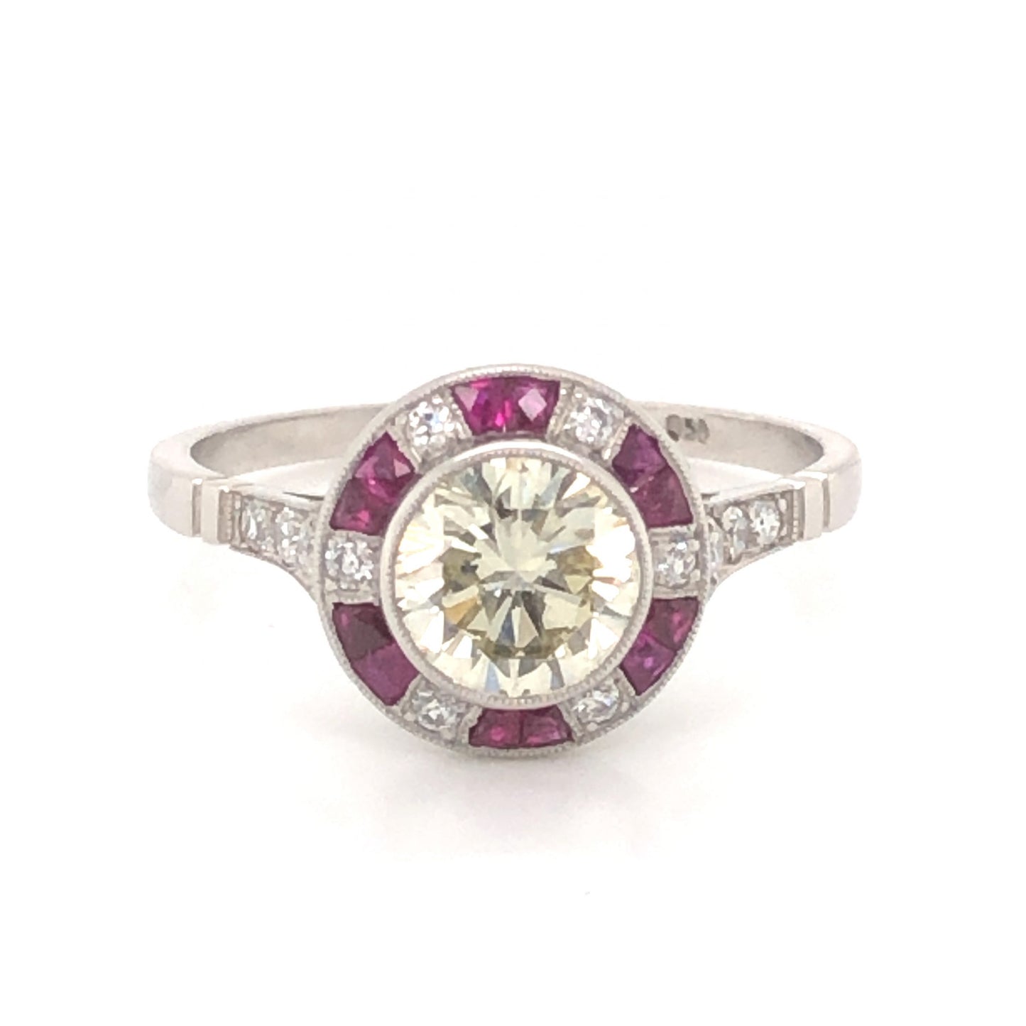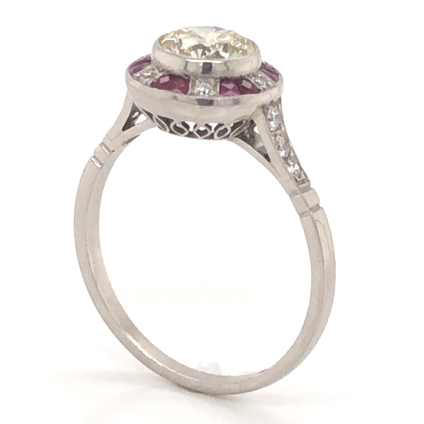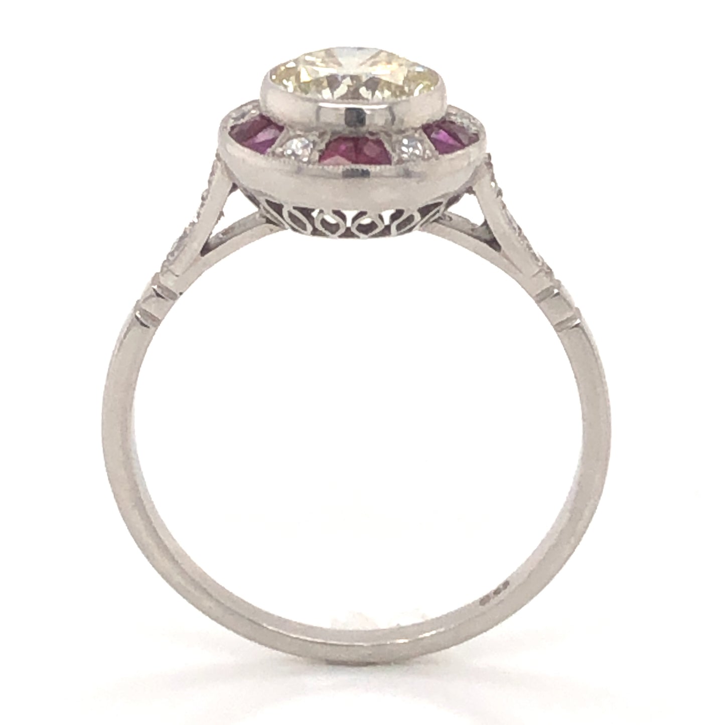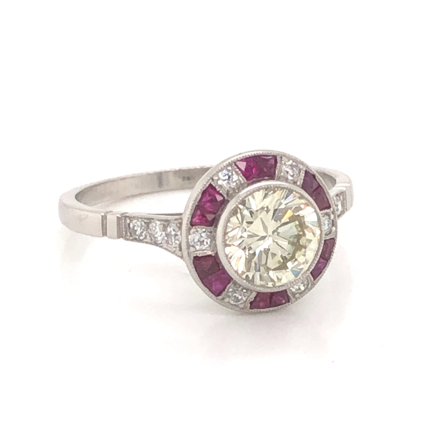 1.12 Fancy Light Yellow Diamond Ruby Ring in Platinum. The glowing ring features a 1.12 carat fancy light yellow diamond and ruby accents finished in platinum. The bezel-set center diamond has a creamy, light golden hue. A halo of twelve (12) .056 carat red rubies and twelve (12) .015 carat diamonds are set in alternating fashion. The red rubies have a deeper, red-magenta hue that adds a depth of color to the diamond varieties. The head of the ring features delicate milgrain details with brilliant diamonds decorating the shoulders of the band.