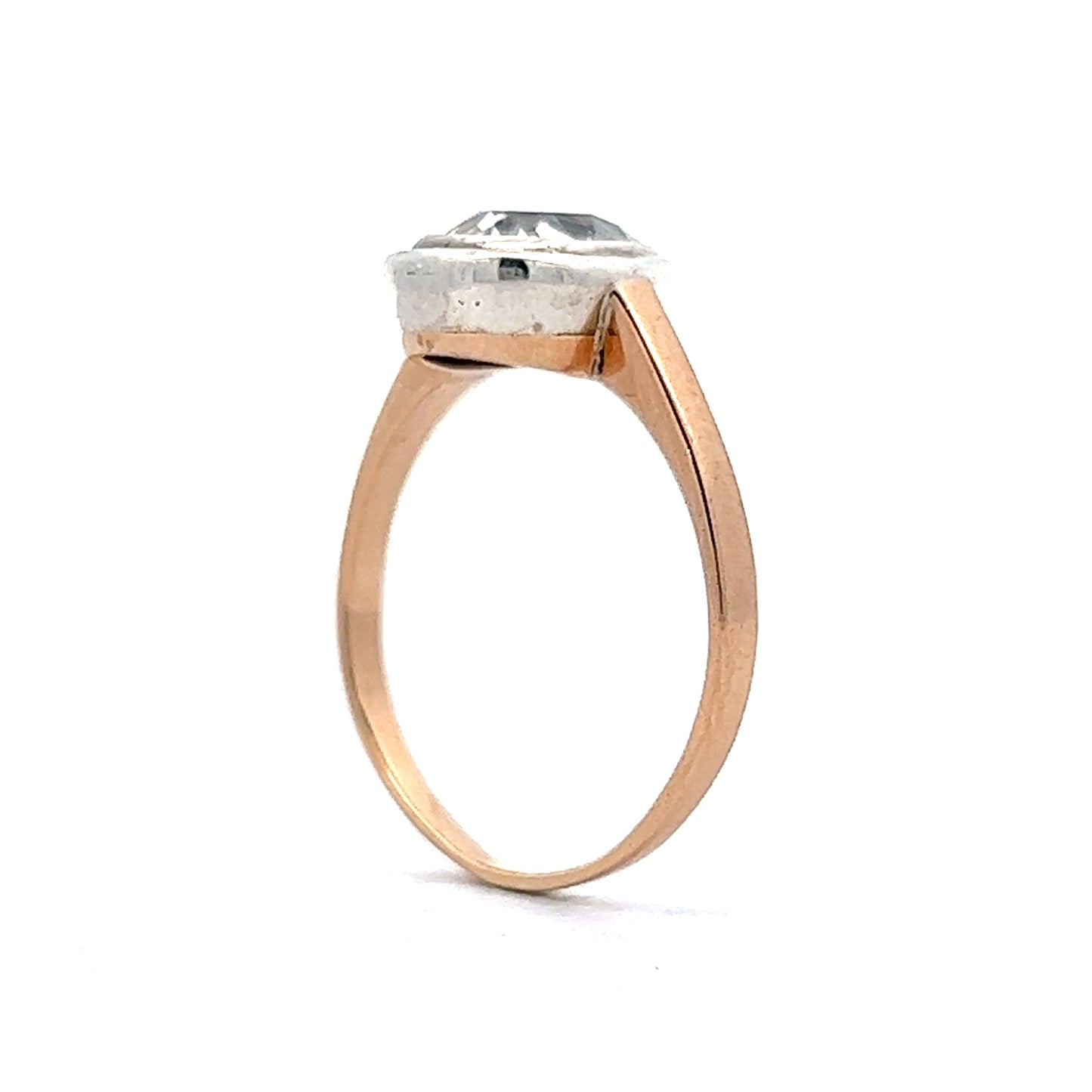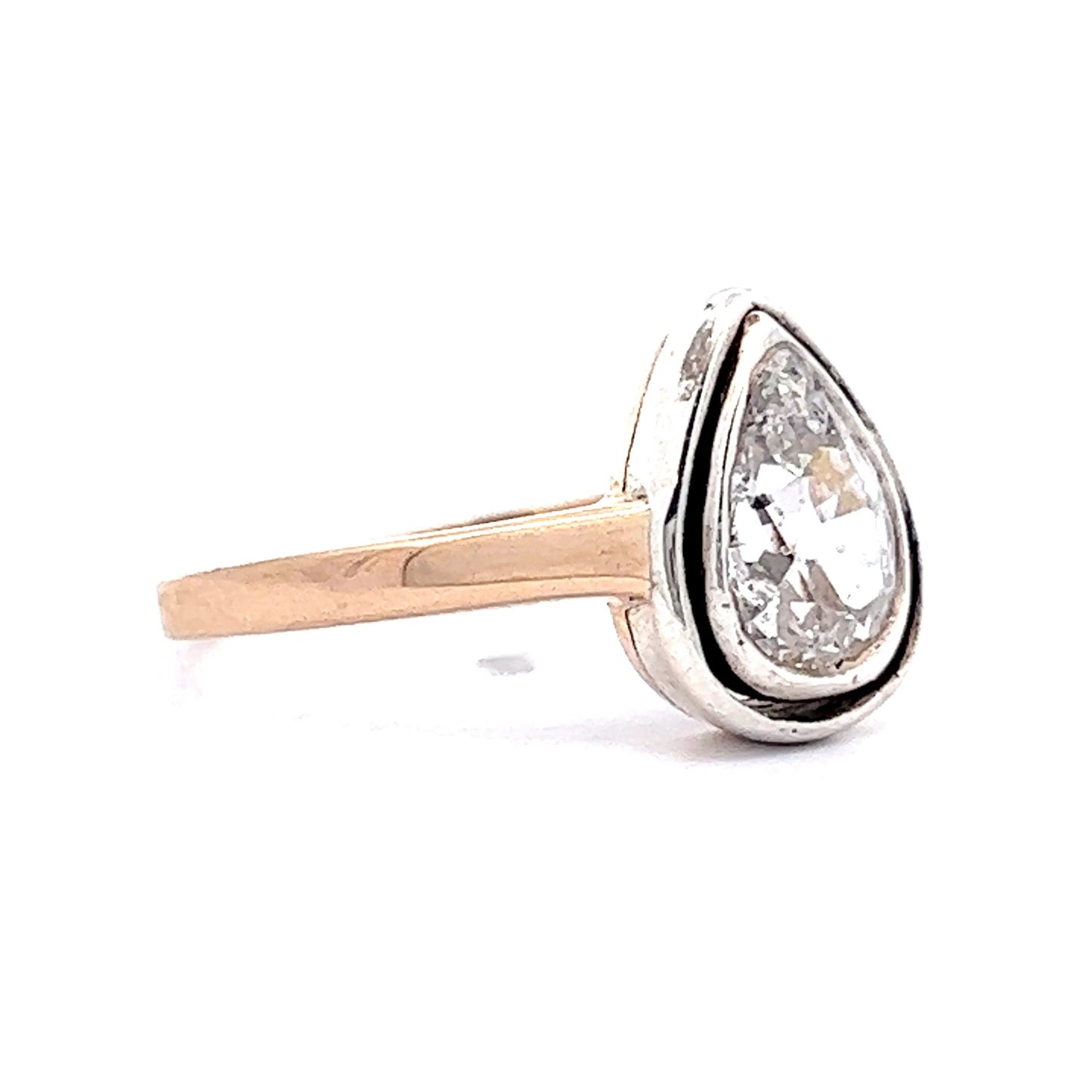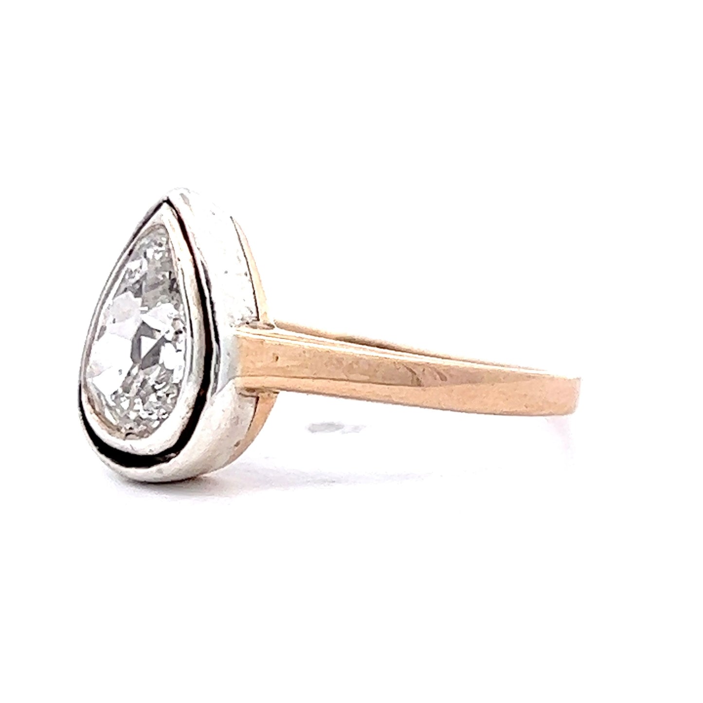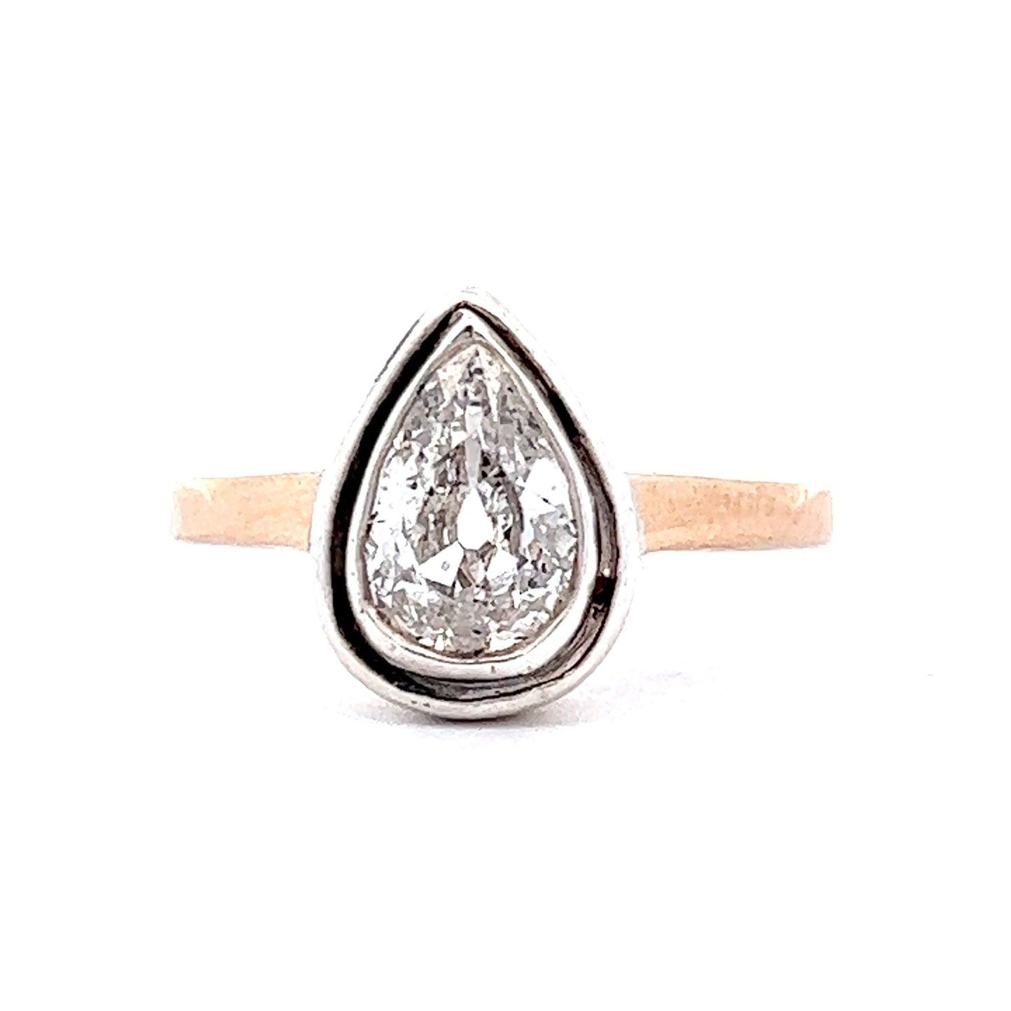 This romantic Victorian Era engagement ring features a bezel set 1.12 carat pear cut diamond in 14 karat rose gold and sterling silver. The antique design of this stunning solitaire features a center diamond with a clarity rated I1 and a color grade of G. The two-tone metalwork features sterling silver bezel to protect the center stone, and a 14k rose gold band that is still sleek and modern 130 years later.