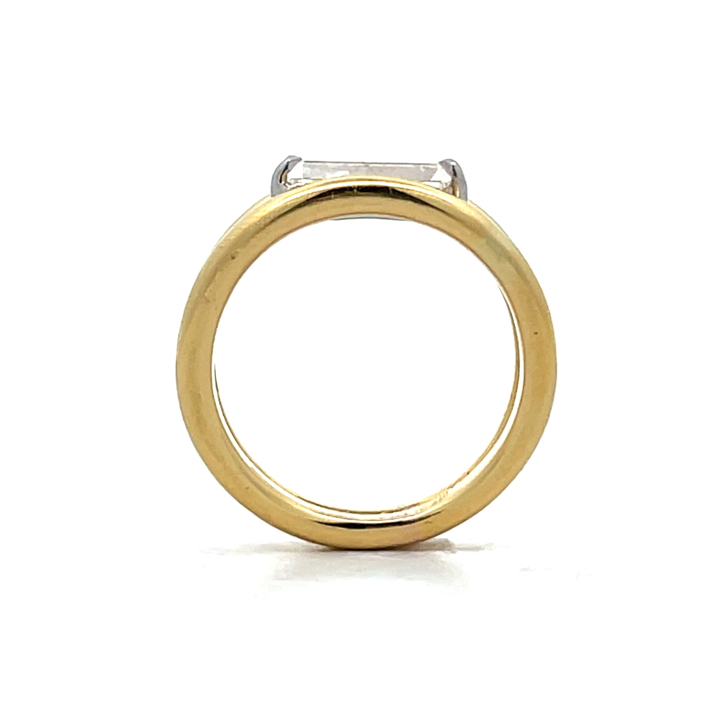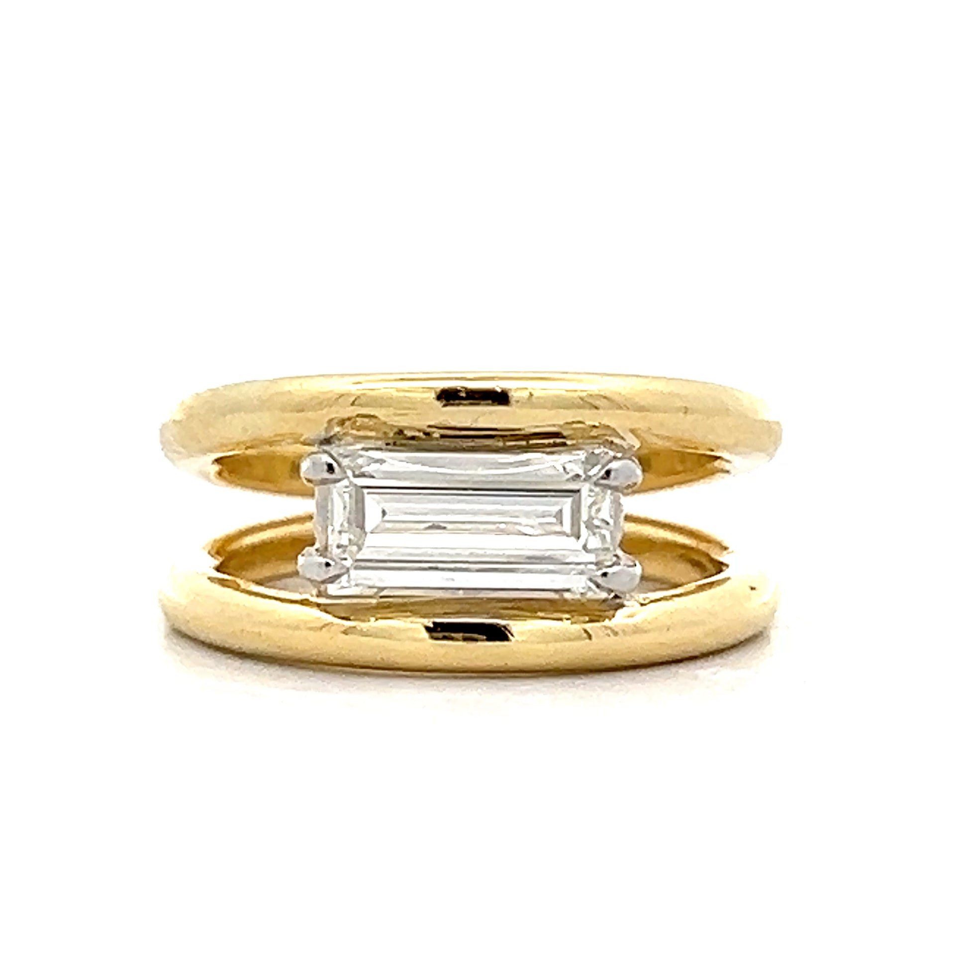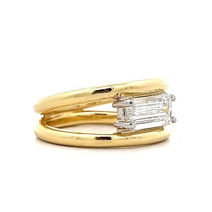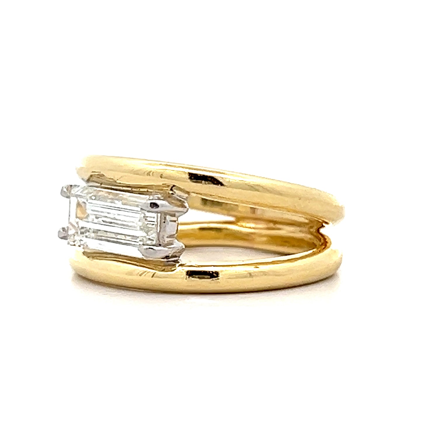 This solitaire engagement ring features a 1.13 carat emerald cut diamond set in white gold four claw prongs with an east-west orientation. The diamond has SI1 clarity and I color, mounted on a 14 karat yellow gold band with split shank design. The rectangular facets of the emerald cut create clean lines and geometric appeal. The mixed metal design pairs the yellow gold band with white gold prongs for contrast.