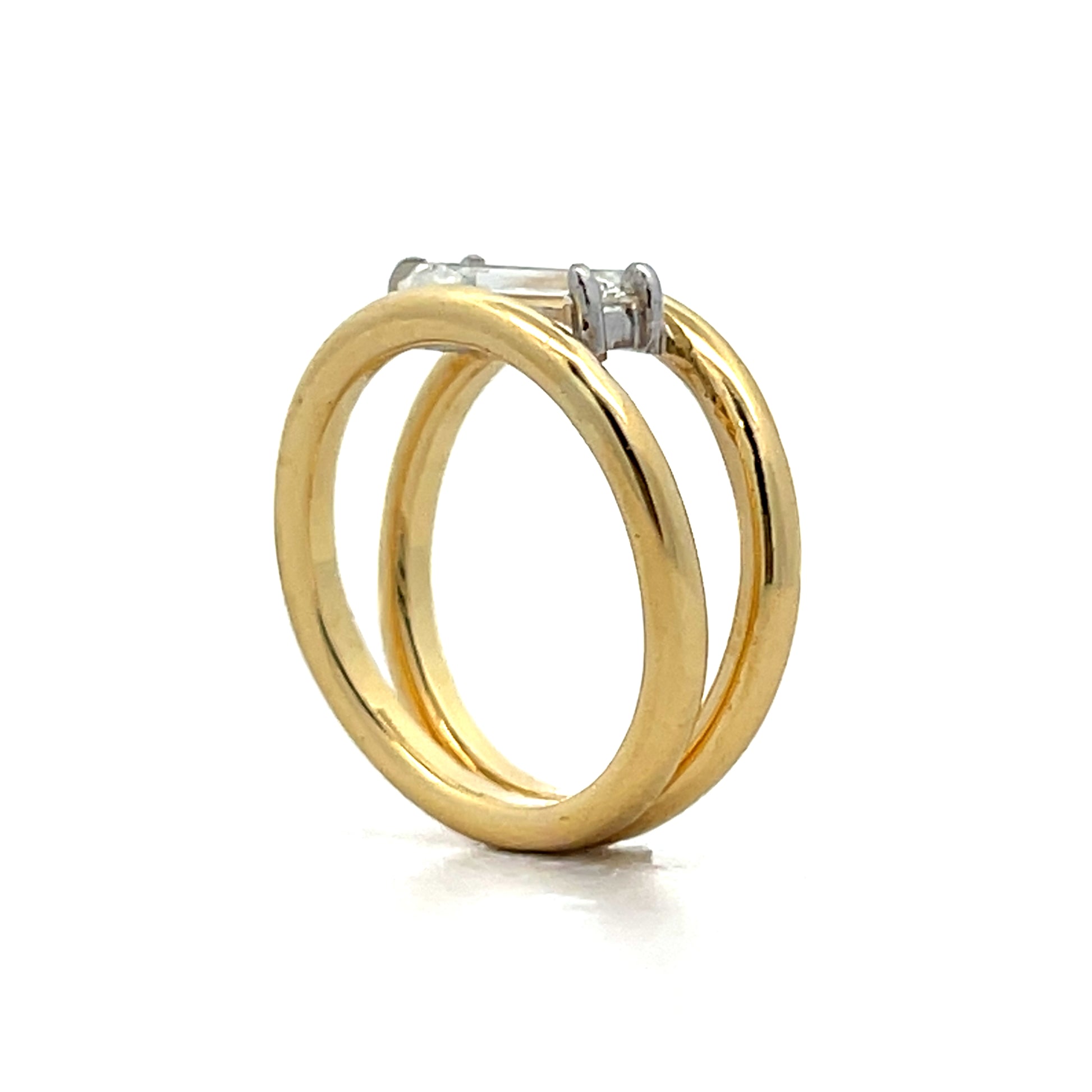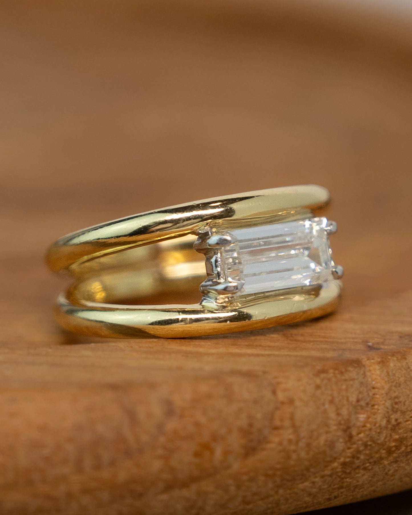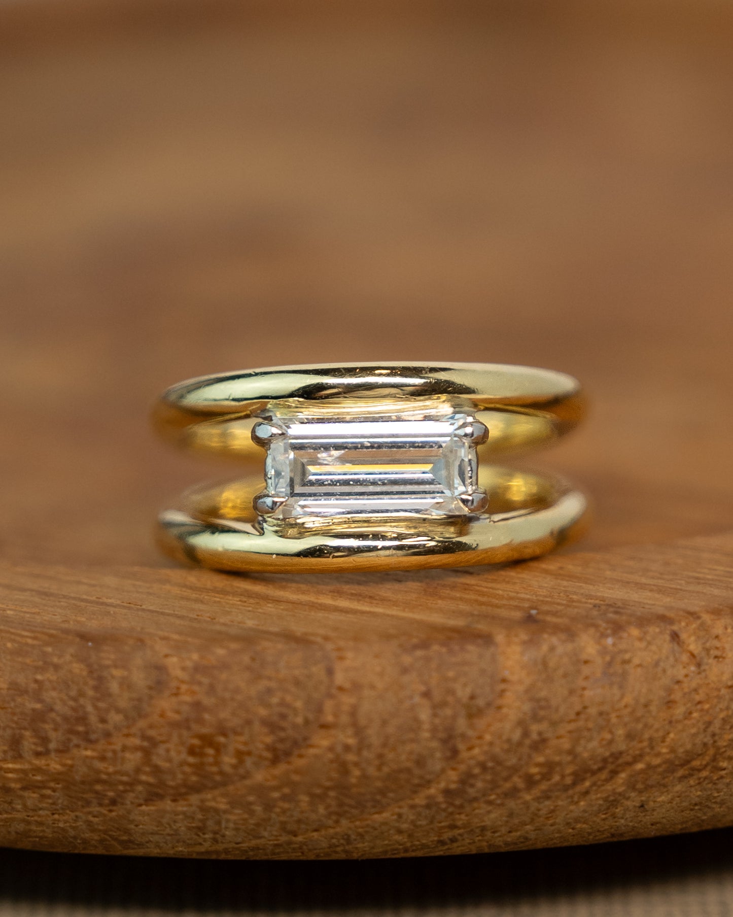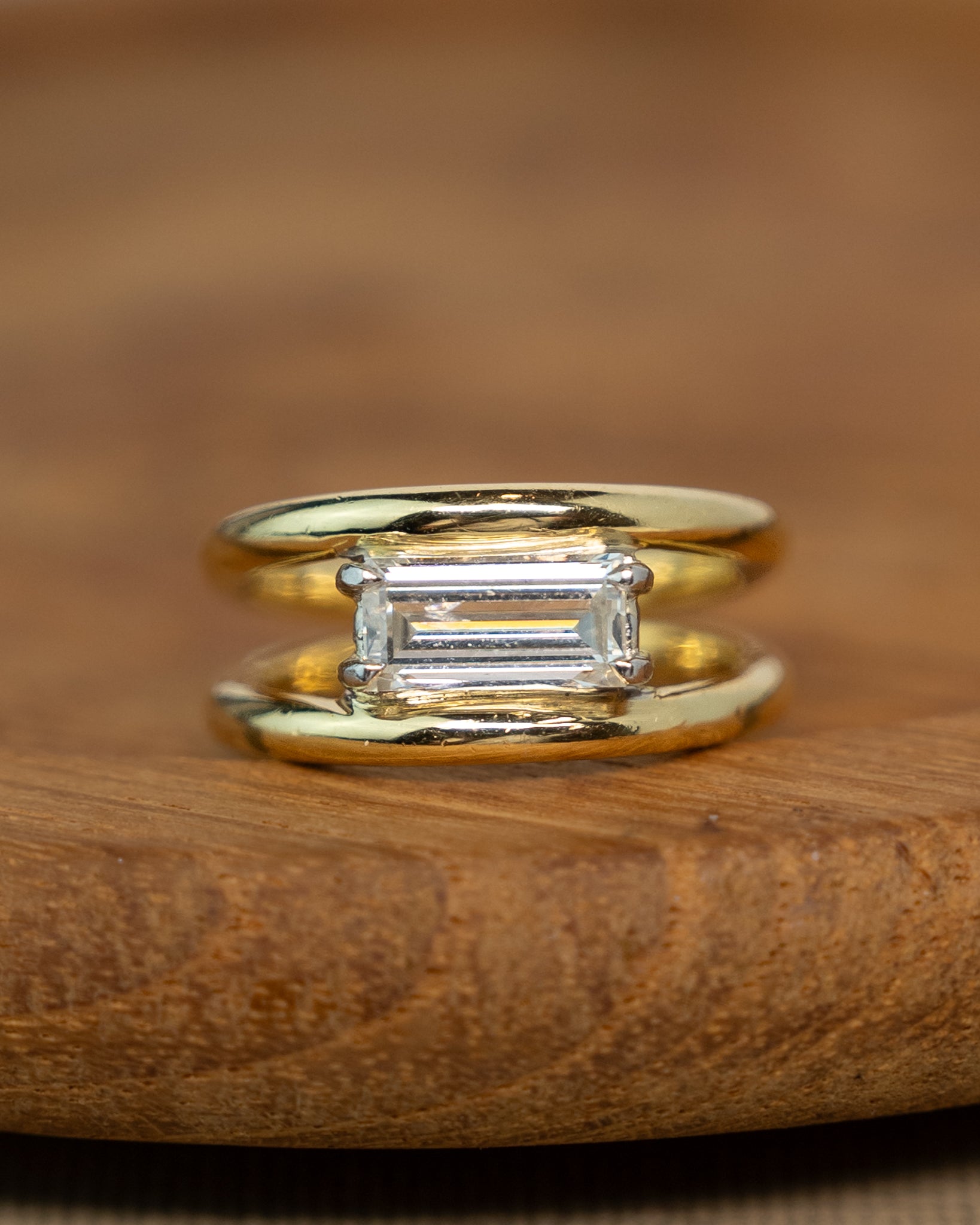 This solitaire engagement ring features a 1.13 carat emerald cut diamond set in white gold four claw prongs with an east-west orientation. The diamond has SI1 clarity and I color, mounted on a 14 karat yellow gold band with split shank design. The rectangular facets of the emerald cut create clean lines and geometric appeal. The mixed metal design pairs the yellow gold band with white gold prongs for contrast.