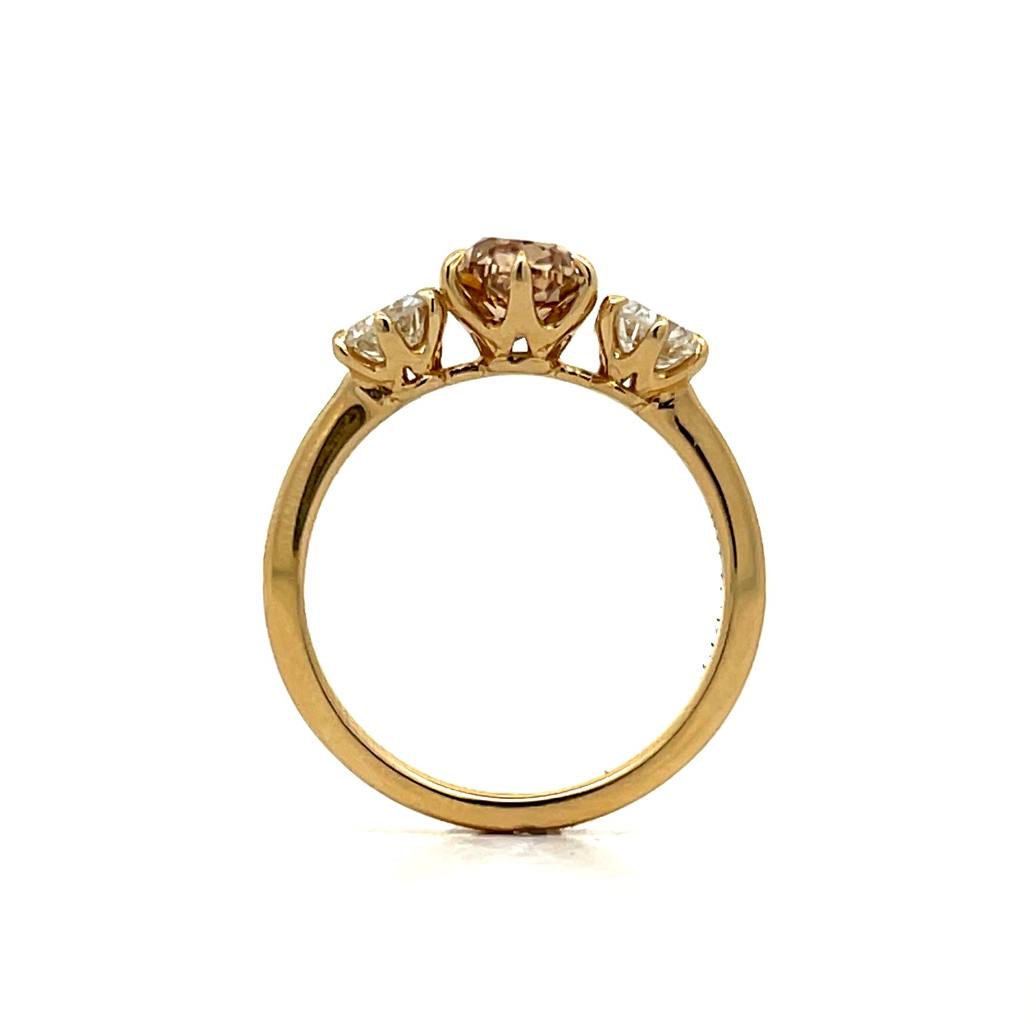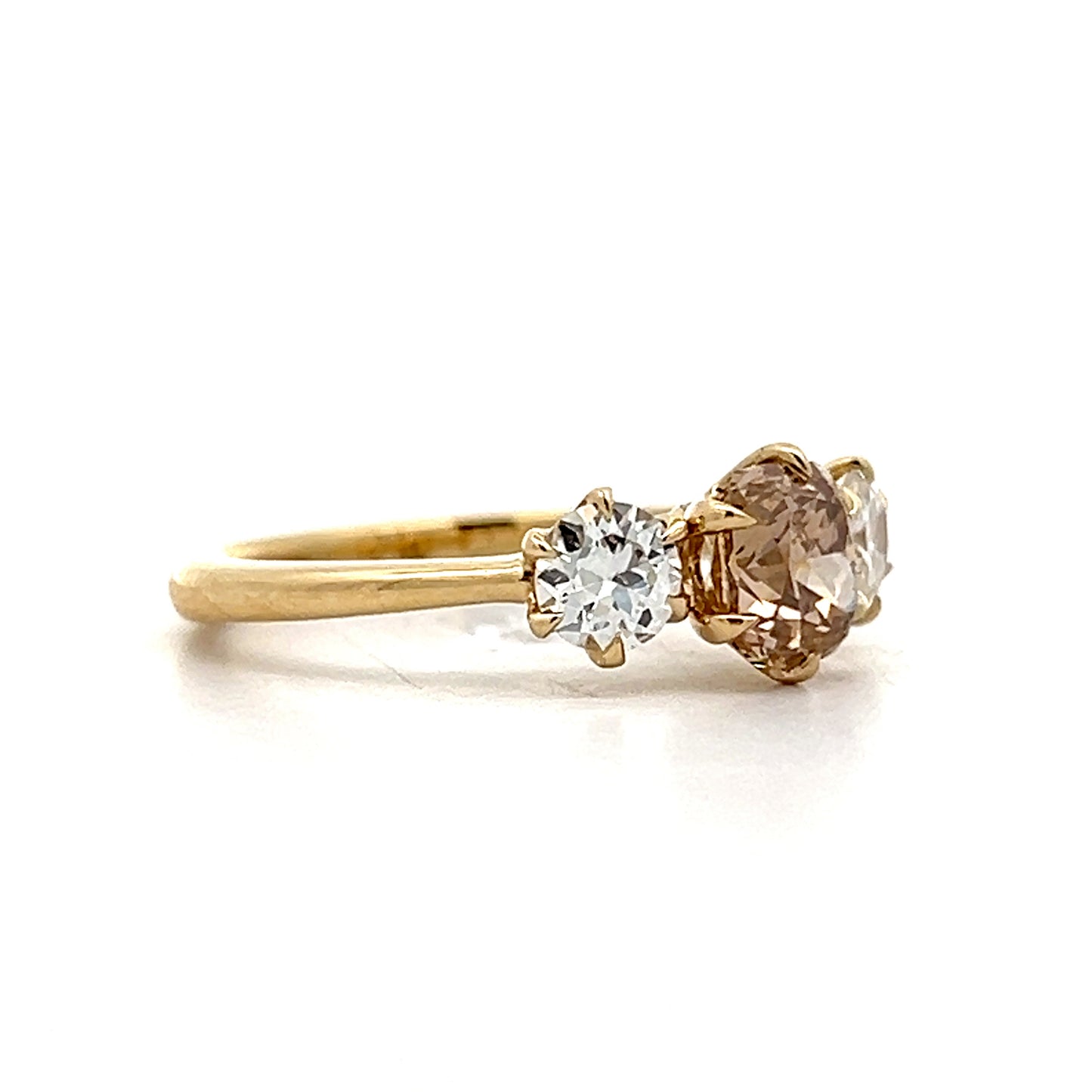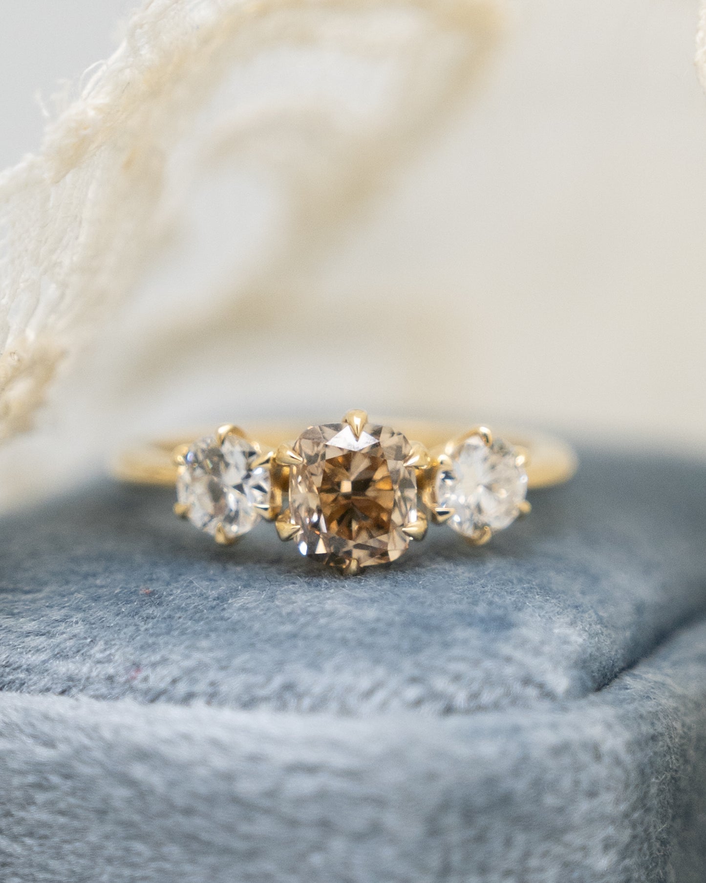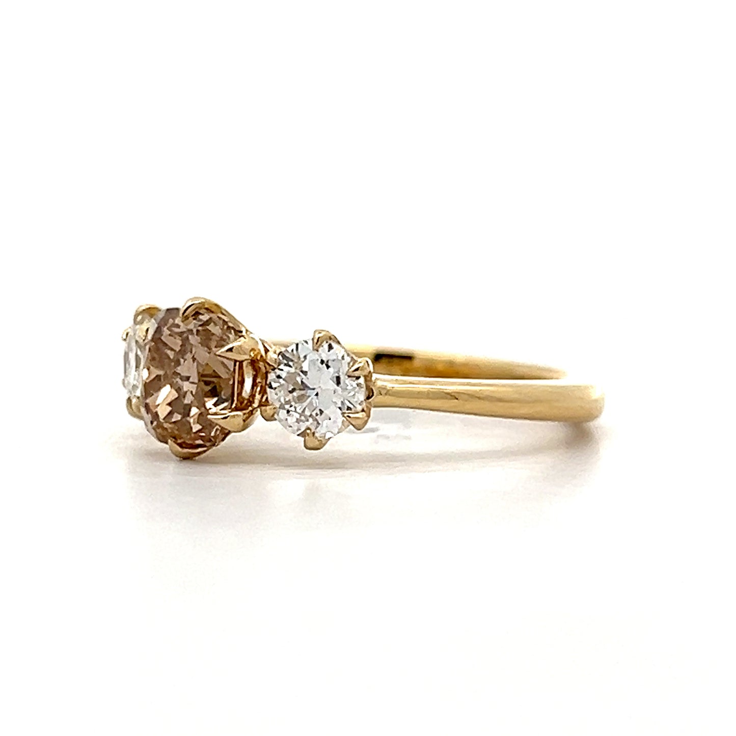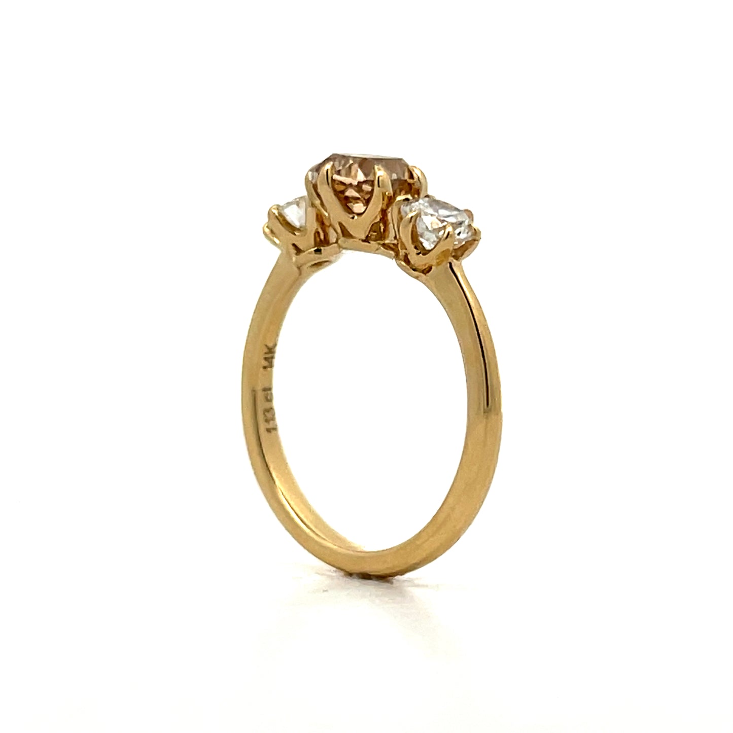 This modern three-stone engagement ring is made of 14 karat yellow gold with a cushion cut fancy brown diamond as its centerpiece. The main diamond weighs 1.13 carats with VS2 clarity, giving it excellent brightness despite its unique color. Two old European cut diamonds sit on either side, together weighing 0.63 carats and measuring 4.35 x 4.31 mm each, held securely in six-prong baskets.