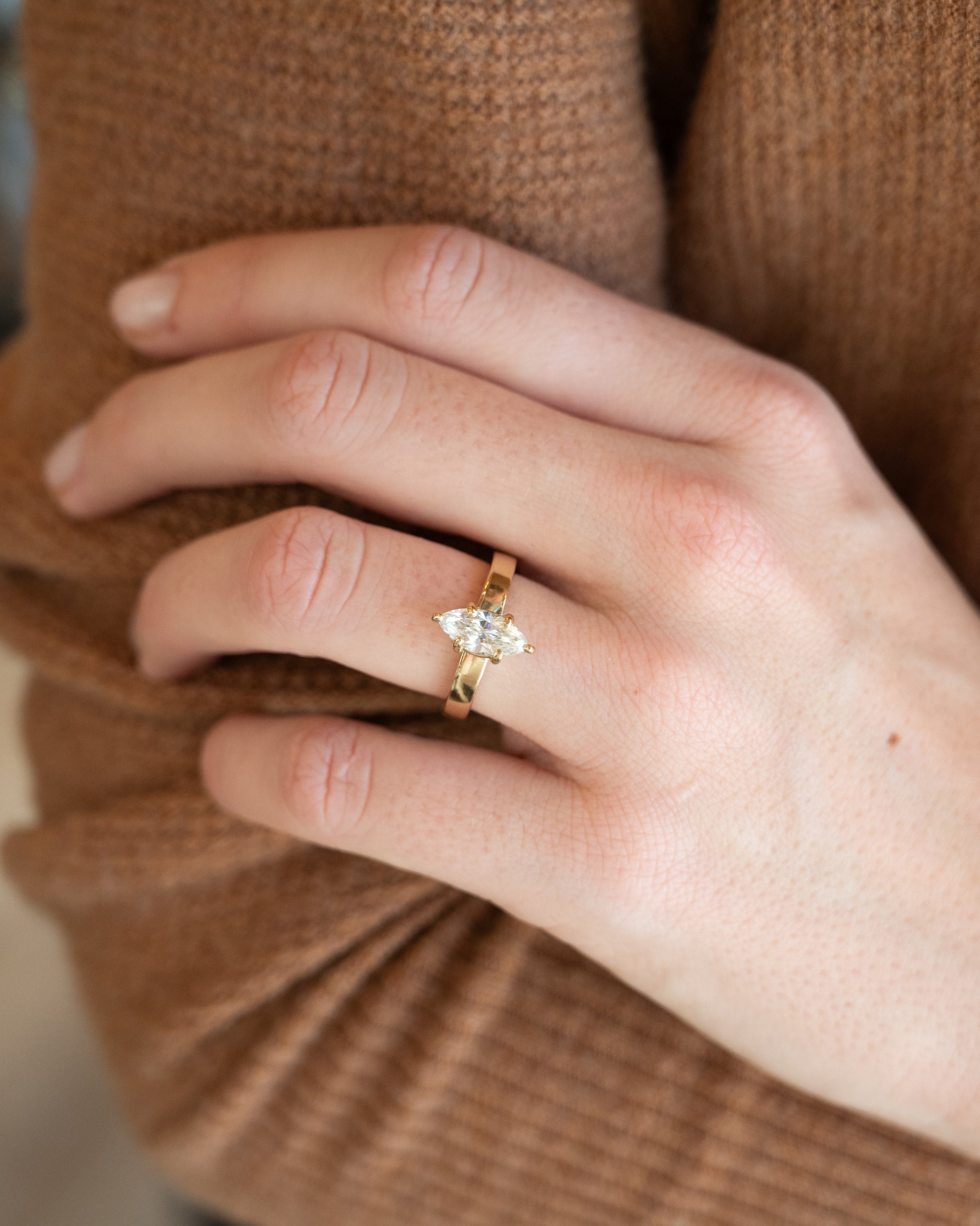 The marquise cut creates an elongated oval shape with pointed ends that makes the diamond appear larger than a round stone of the same carat weight and can make fingers look longer when worn.