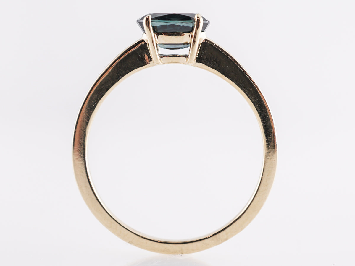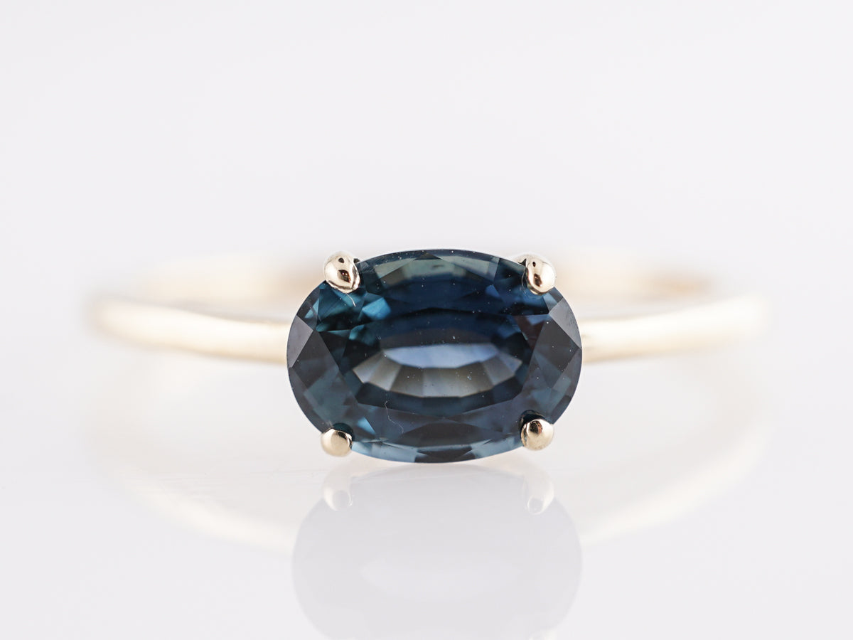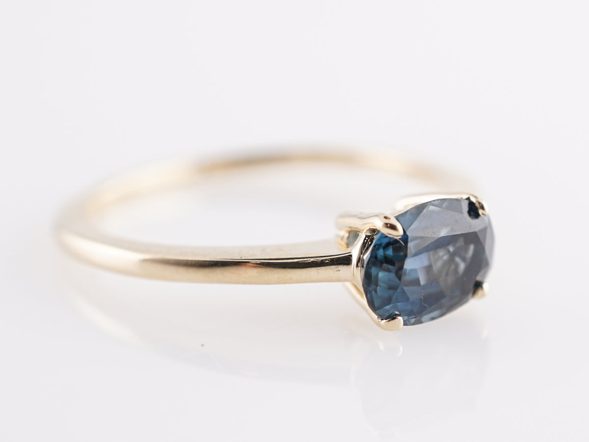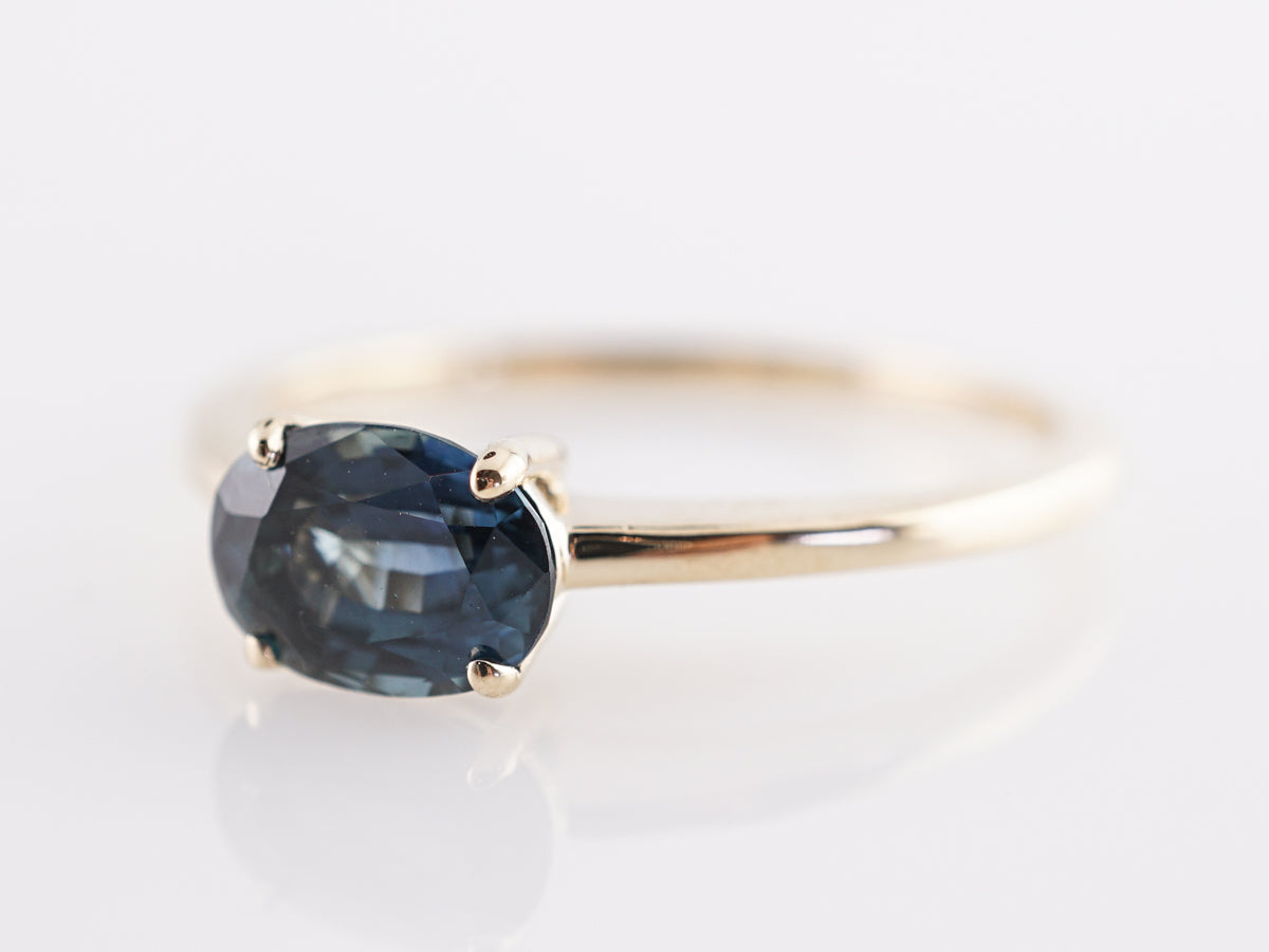 1.15 Carat Sapphire Engagement Ring in 14K Yellow Gold. This engagement ring features a 1.15 carat natural blue sapphire. Highly saturated in shades of darker teal and deep navy, this gorgeous stone is elegantly set in a four (4) prong, 14k yellow gold band. The facets are bold and recognizable, allowing light to bounce from within the gemstone. Slightly elevated from the band, the gallery view shows precision and a sleek elegance to this modern engagement ring.