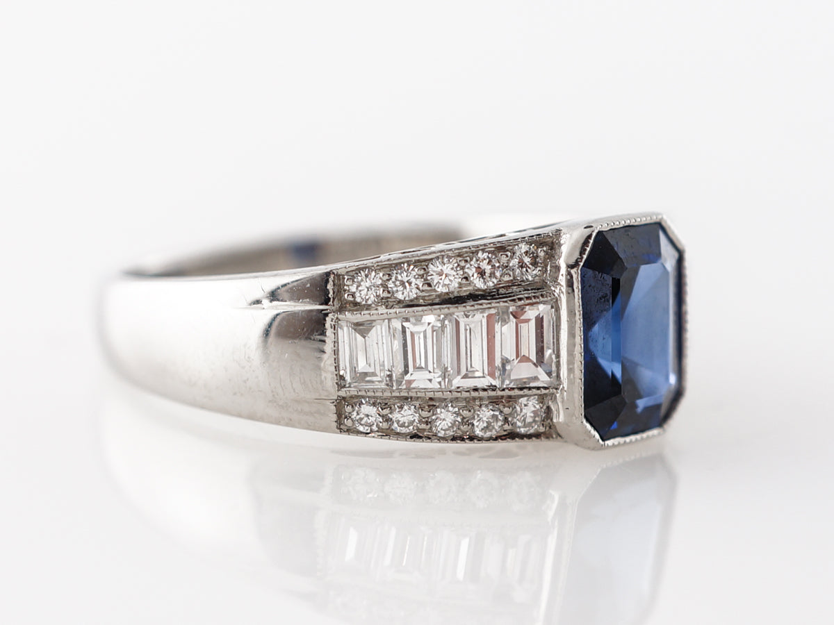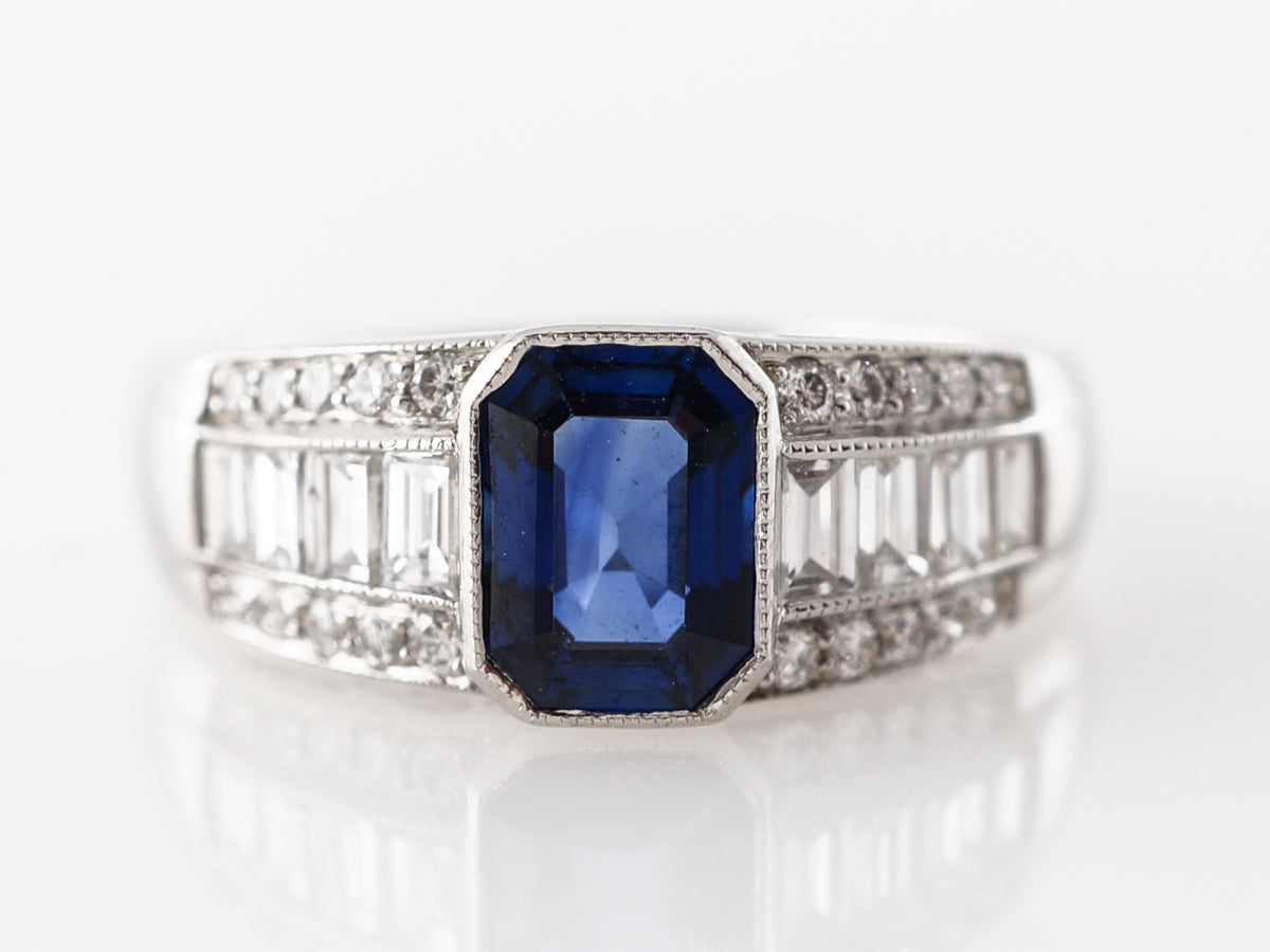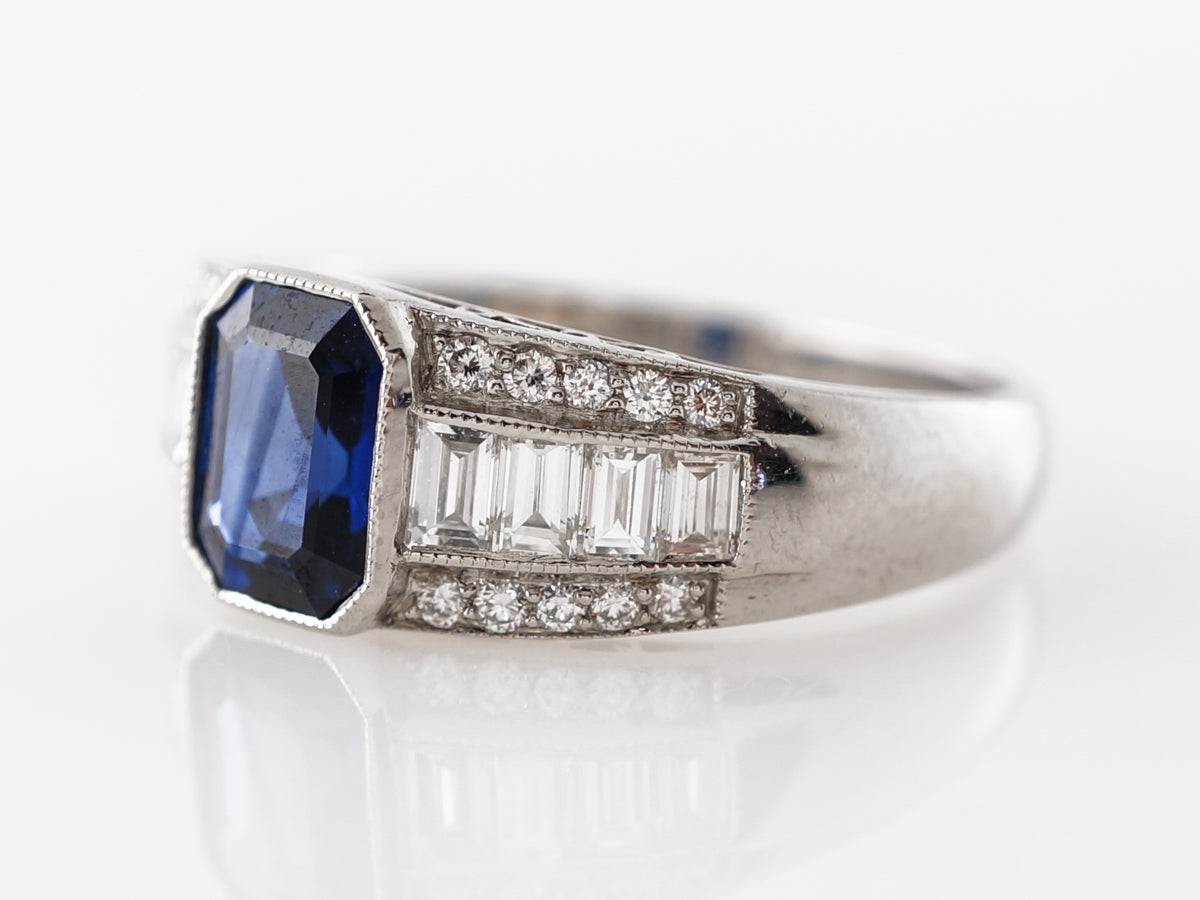 1.15 Emerald Cut Sapphire Engagement Ring in Platinum. This modern engagement ring features a 1.15 carat emerald cut sapphire with .78 carats of diamond accents and is set in platinum. The ring is rather wide at about 7 mm, with the accent stones remaining the same width as the bezel set center stone. The shoulders consist of three rows of accent diamonds separated by lines of milgrain detail, with the central row being channel set baguettes and rows of bead set round brilliant cuts on either side. These details combine to create a large diamond look that contrasts wonderfully with the deep blue sapphire.