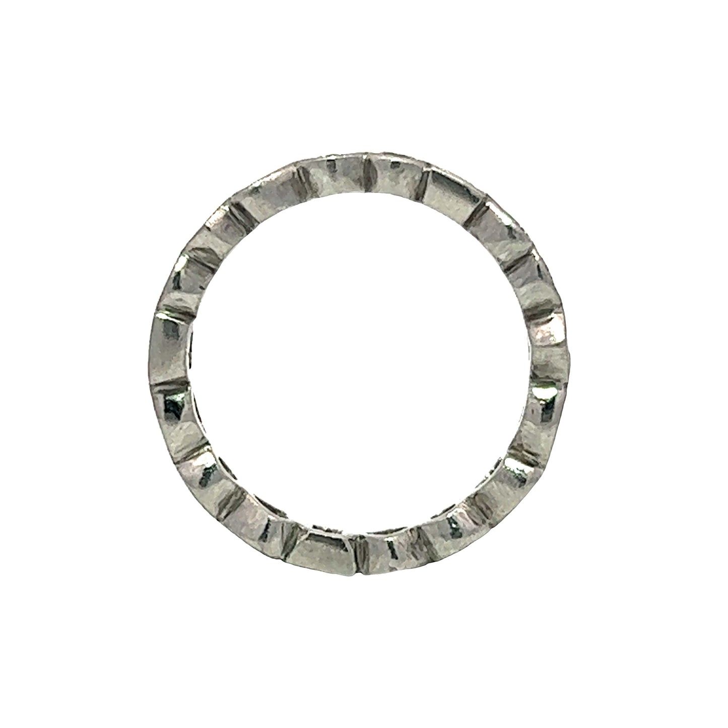 This eternity band is crafted in platinum and is set with multi-shaped diamonds.  The band features round brilliant, emerald cut, and princess cut diamonds with a total weight of 1.16 carats.  This unique band has a unique texture and would work well as the center of a stack or on its own finger.