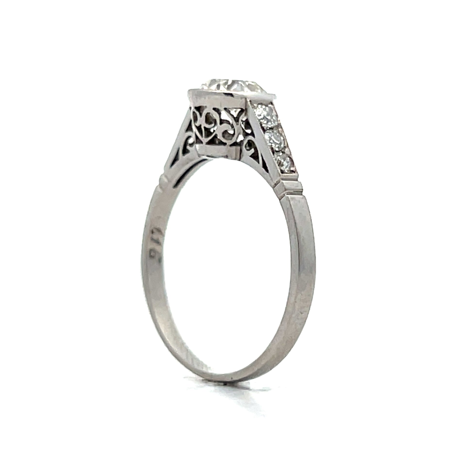 This modern antique-inspired engagement ring features a 1.16 carat old European cut diamond with VS2 clarity and J color in a bezel setting, accompanied by six old European cut accent diamonds each measuring 2.3mm and weighing .03 carats, all set in platinum. The side stone design places the accent diamonds on the ring's shoulders for additional sparkle around the center stone. The total diamond weight is 1.34 carats.