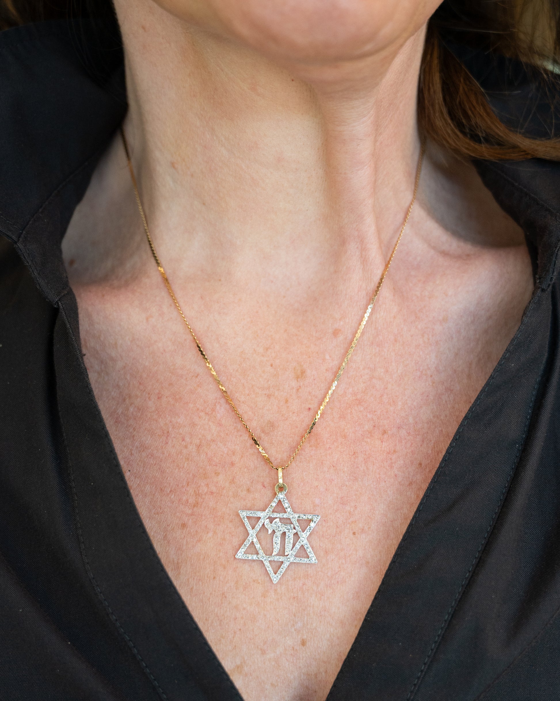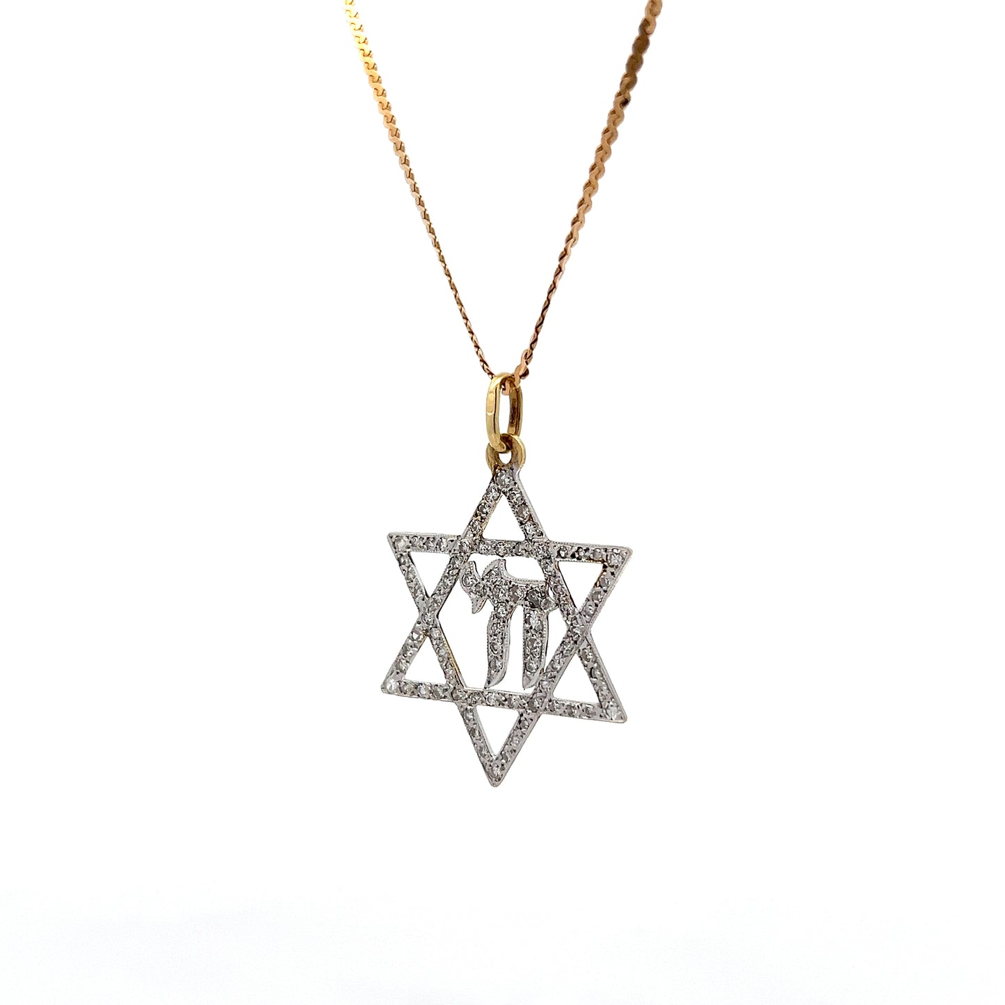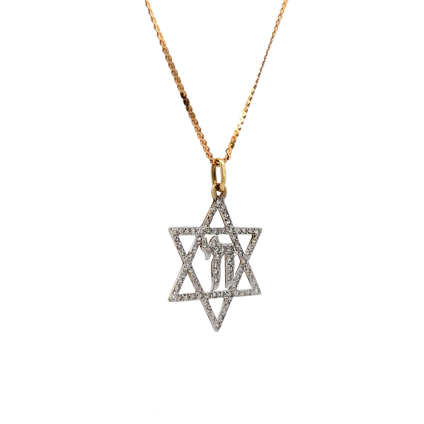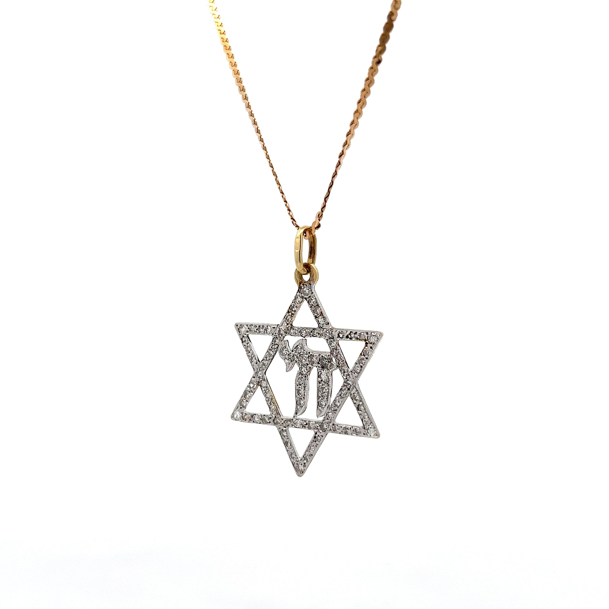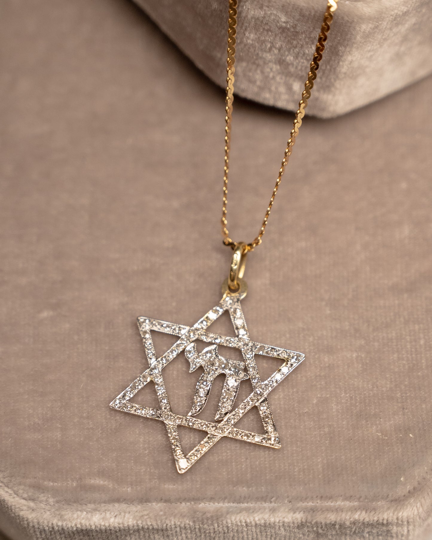 The Chai Star of David pendant necklace combines Jewish symbols with diamonds in a Mid-Century design. Made with 14 karat white gold, the pendant contains 79 single cut diamonds (VS2/SI2 clarity, I/J color) ranging from 1.25-2.00mm and .01-.03 carats each, creating a pave effect with a total diamond weight of 1.18 carats. A round brilliant cut diamond serves as the centerpiece of this 1.5-inch pendant. The piece hangs from an 18-inch chain crafted from 14 karat yellow gold, creating a two-tone metal effect.