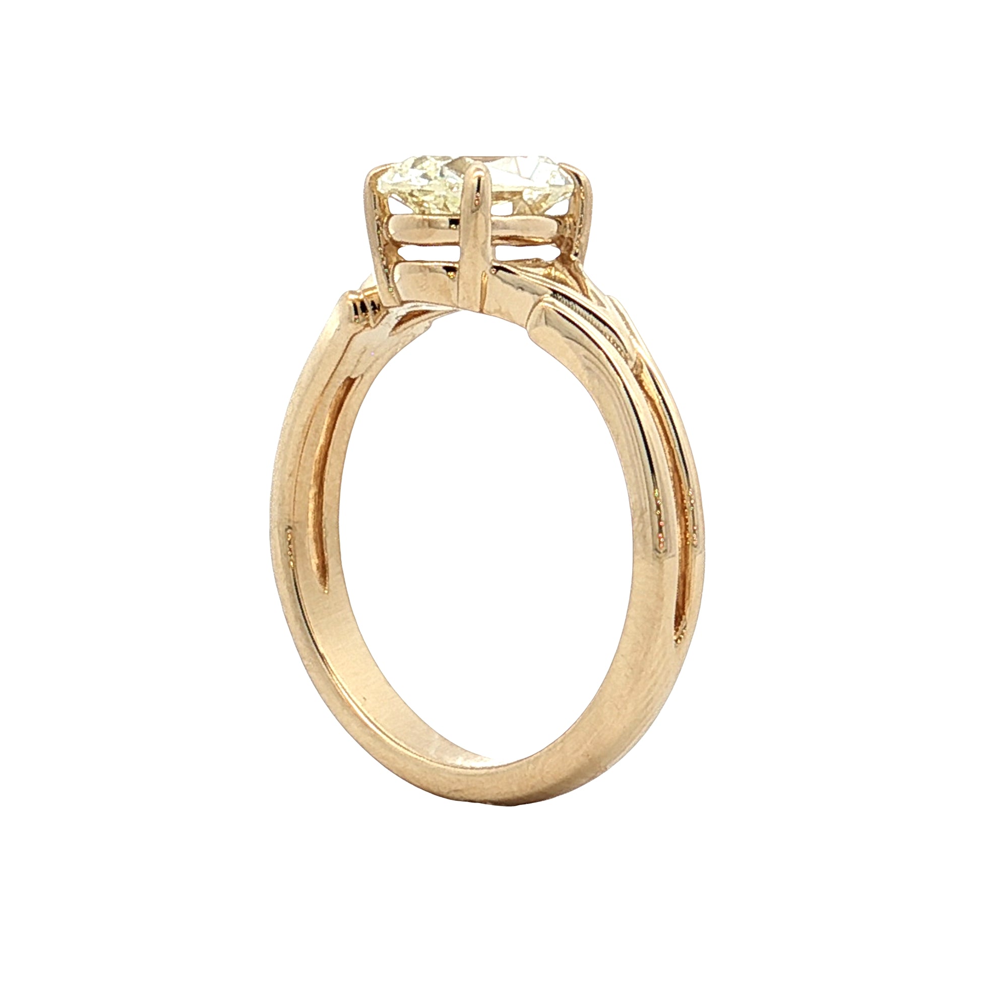 Old Mine Cushion cuts predate modern cutting techniques—they have larger facets and smaller tables that produce a softer, more romantic light pattern compared to today's precision cuts. The S-T color grade means it carries visible warmth; however, setting it in yellow gold helps the diamond's tint blend in rather than stand out. VS2 clarity indicates minor inclusions that are visible under magnification but won't be noticeable to the naked eye. The split shank adds visual weight to the ring's profile while keeping it comfortable on the finger.