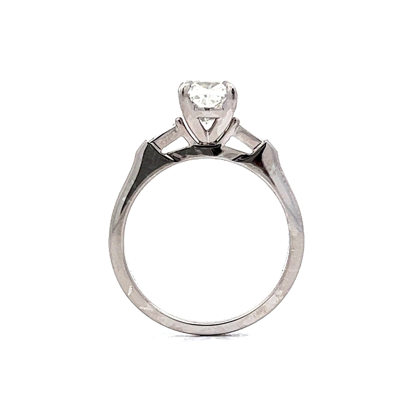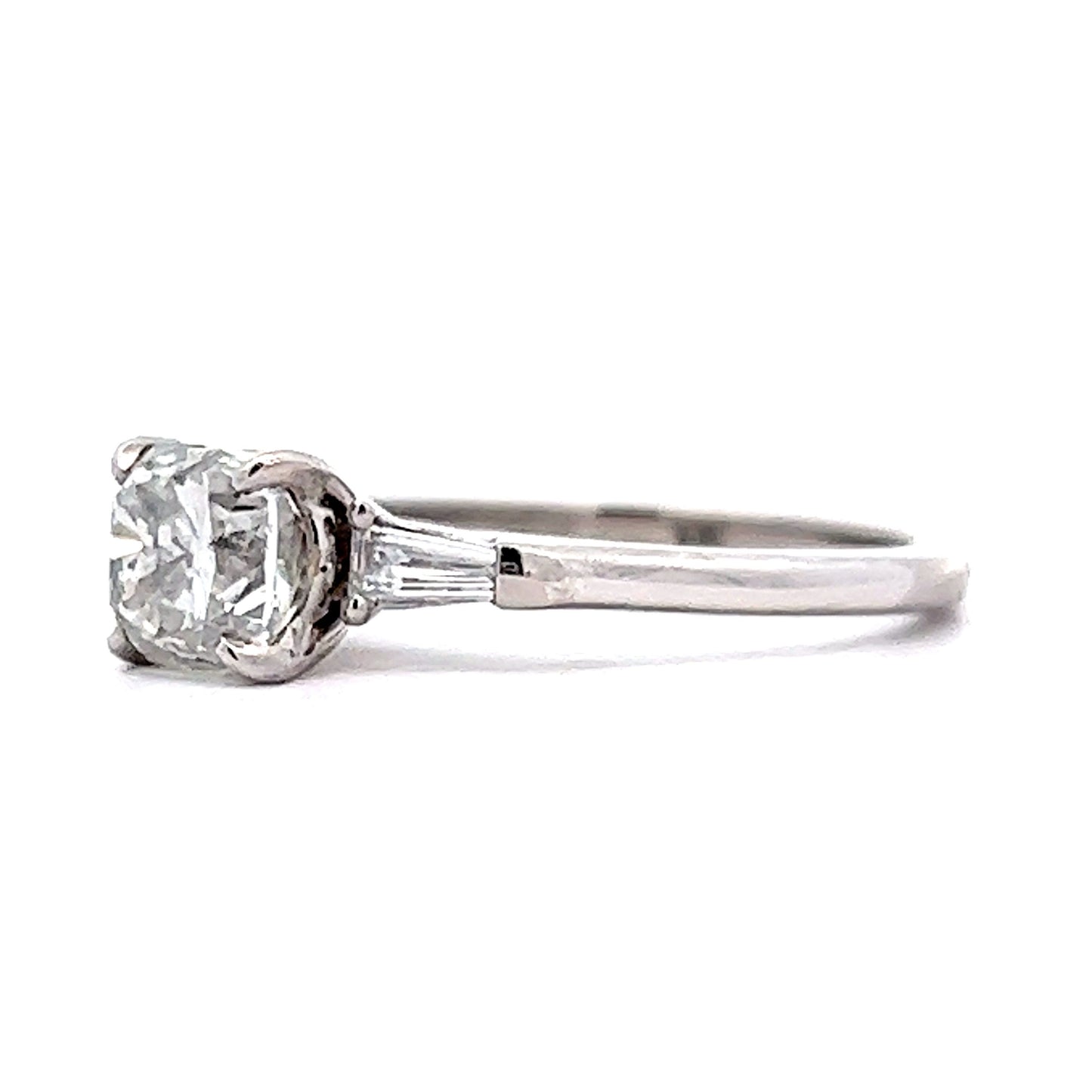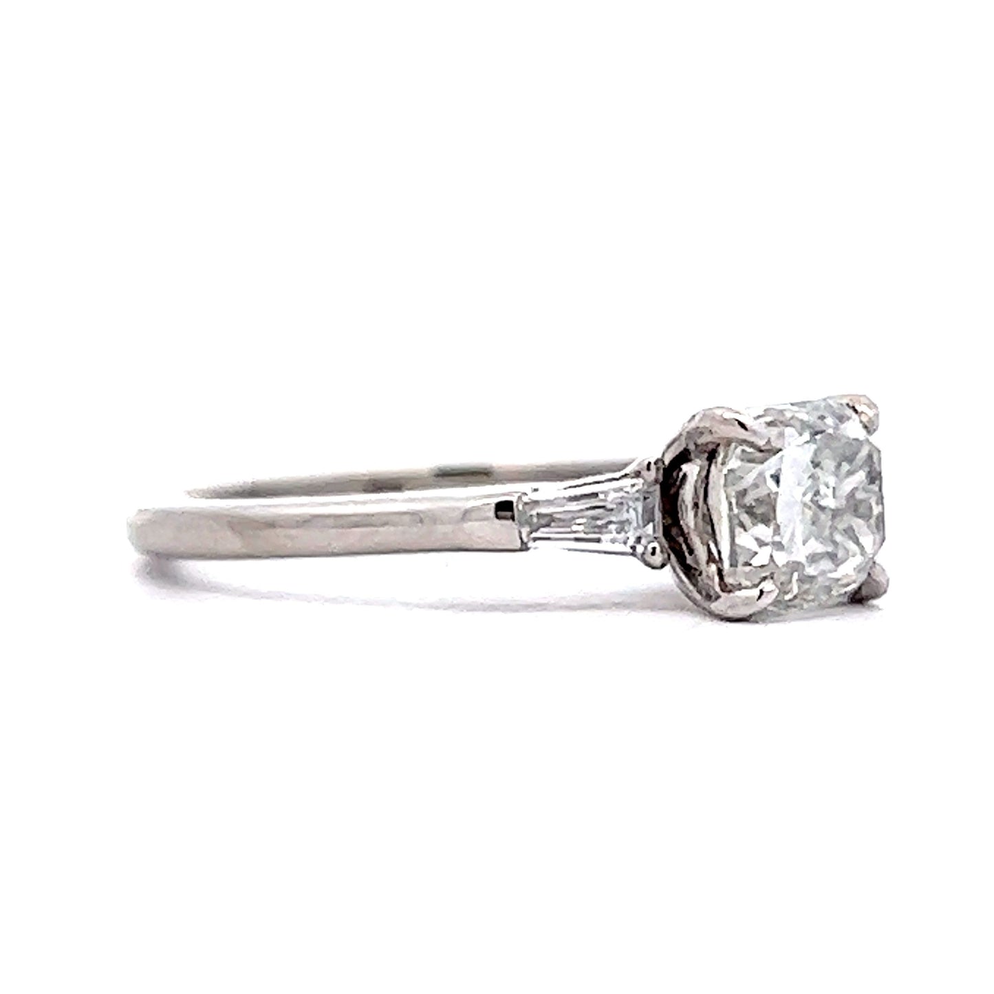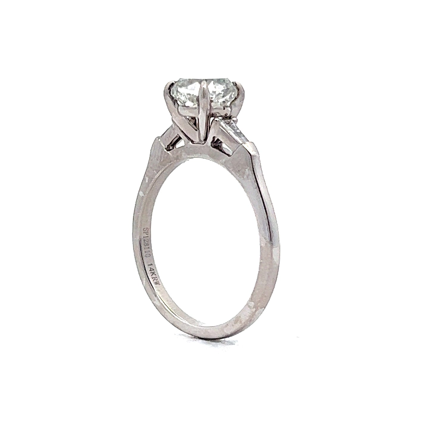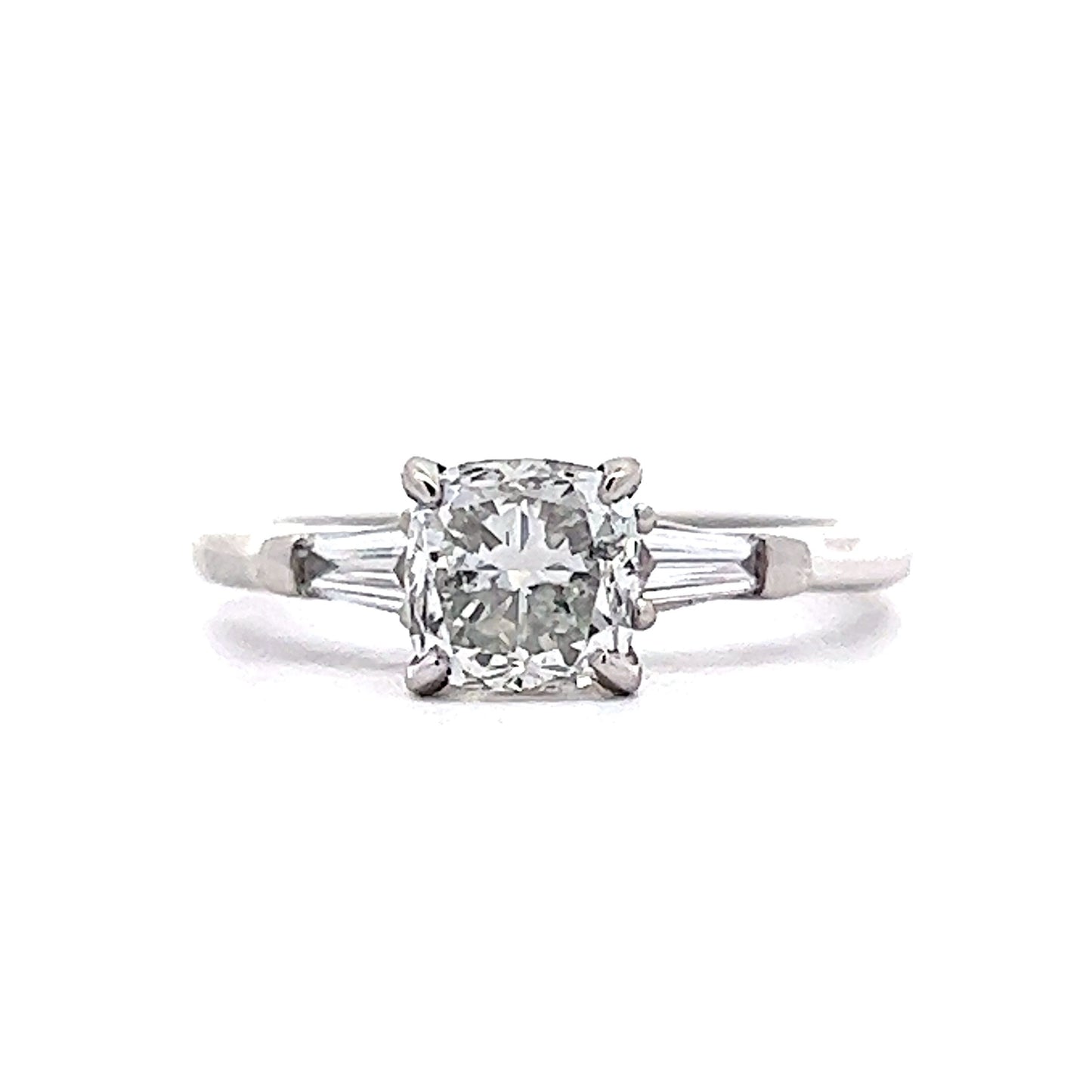 This modern solitaire engagement ring is crafted in 14 karat white gold and features a dazzling 1.20 carat cushion cut diamond. The center diamond has a clarity of SI2 and a color grade of H. On the side, two matching tapered baguette diamond accents dazzle with a total weight of .18 carats. The baguettes each measure 3.50mm x 2.50mm x 1.25mm and have a total weight of .09 carats each. This ring is about as classic as it gets and is a timeless option that will never go out of style.