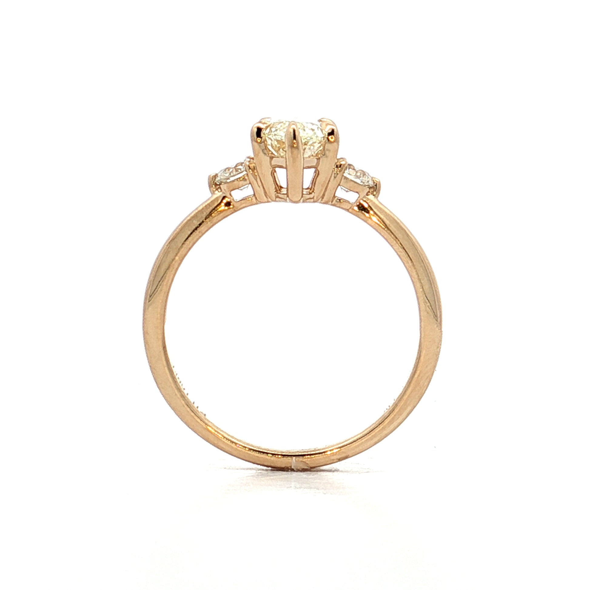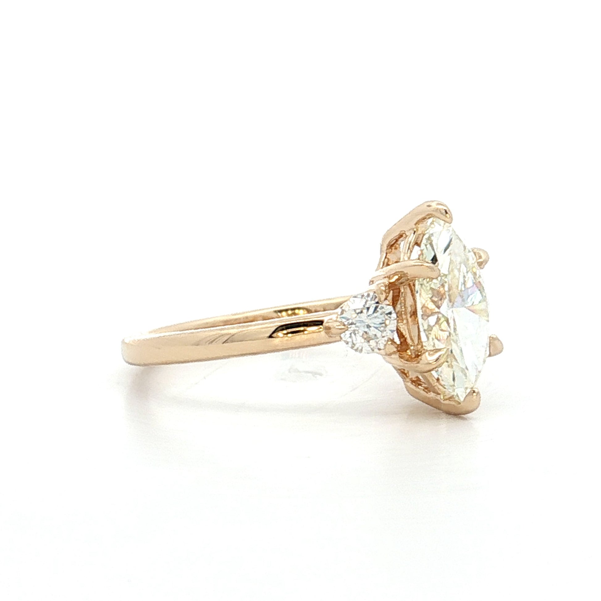 This three-stone engagement ring is set in 14 karat yellow gold and features a GIA-certified 1.20 carat marquise cut diamond with VVS1 clarity and M color as the center stone. The marquise cut creates a stone with pointed ends and brilliant-style facets that maximize sparkle while creating an elongated, eye-catching profile on the finger. VVS1 clarity means the diamond has extremely tiny inclusions visible only under magnification, making it essentially flawless to the naked eye—among the highest clarity grades available.