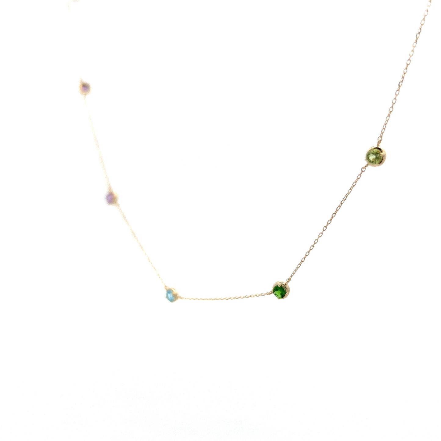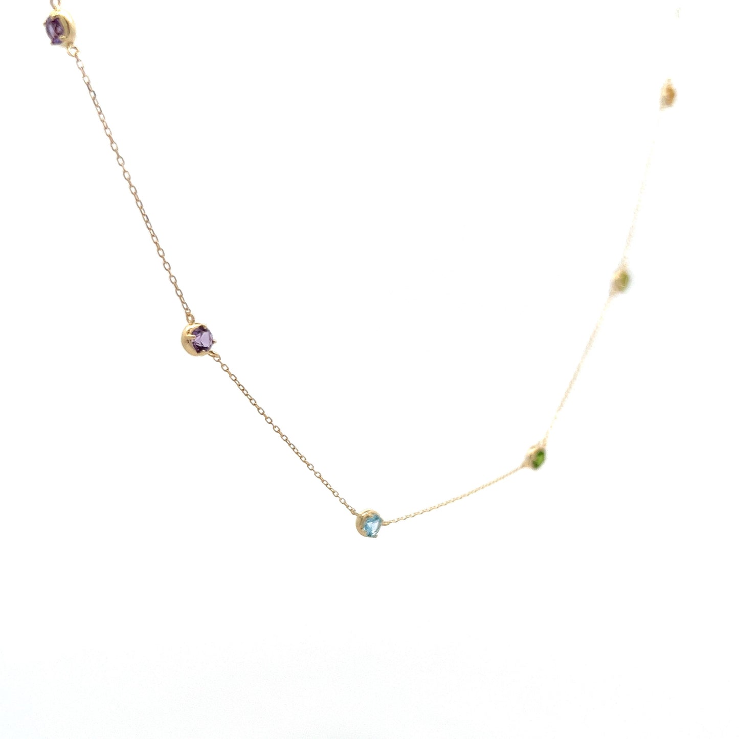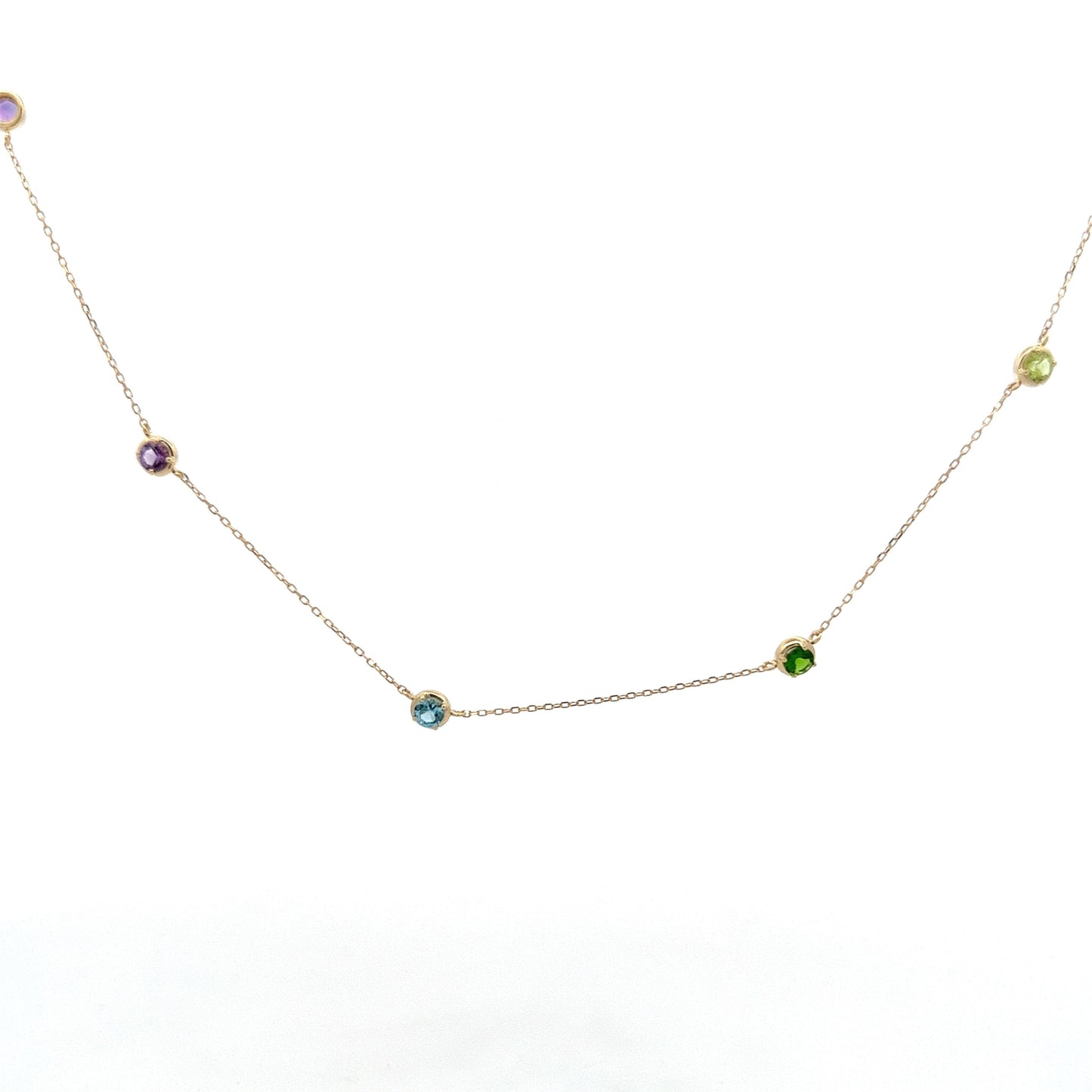 Add a pop of color to your jewelry collection with this modern multi-color gemstone necklace! The perfect layering necklace, this piece features a combination of vibrant amethyst, topaz, garnet, and citrine gemstones set in 14 karat yellow gold. The round cut gemstones have a total weight of 1.21 carats and measure 3.1mm each, with 11 stones in total. Perfect for adding a touch of personality to any outfit, this gemstone necklace is a must-have for any colored gemstone jewelry lover!