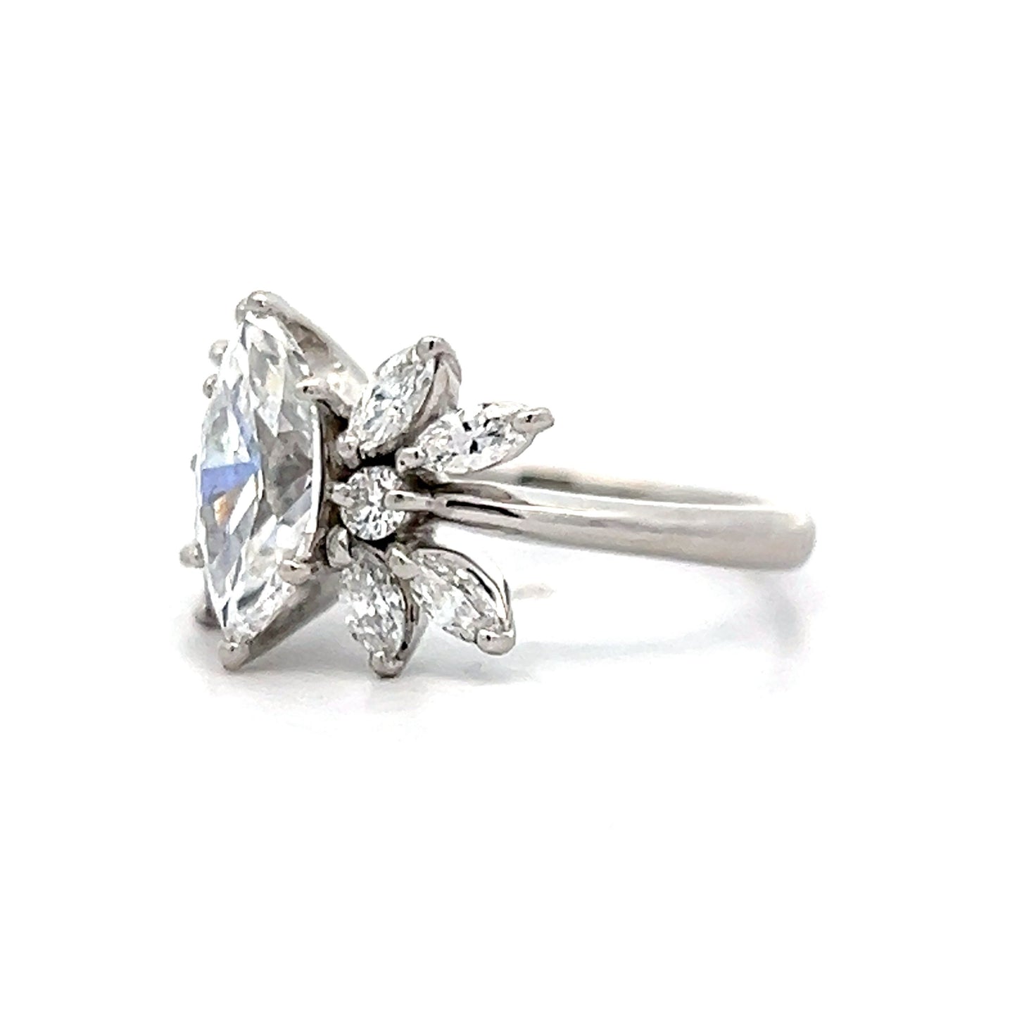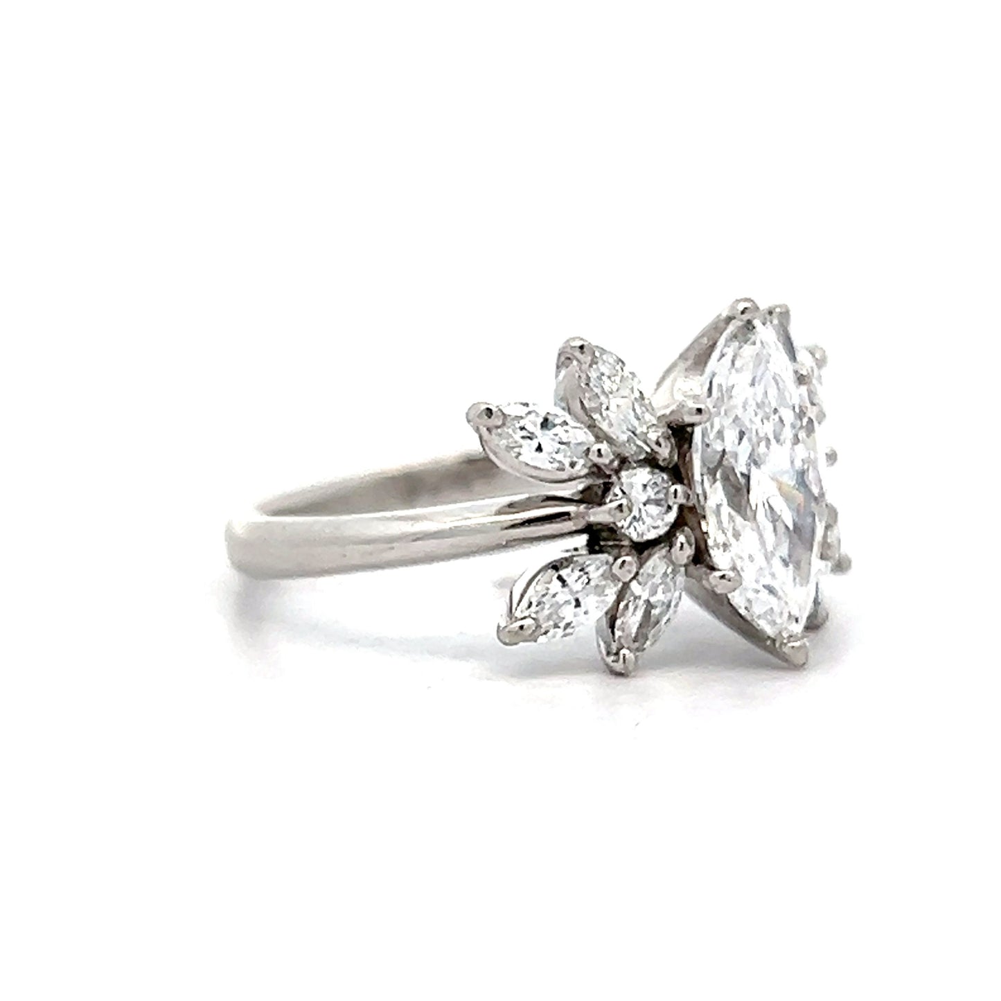 This cluster engagement ring features a 1.22 carat marquise cut diamond at its center, with exceptional D color and VVS2 clarity. The diamond is prong set to maximize its brilliance. Surrounding the centerpiece are eight marquise diamond accents, each measuring 3.85 x 2.00 mm and weighing .0575 carats, with F color and VS2 clarity, adding to the overall sparkle. Two round brilliant cut diamonds further enhance the ring's radiance. Crafted in platinum, the band complements the diamonds perfectly.