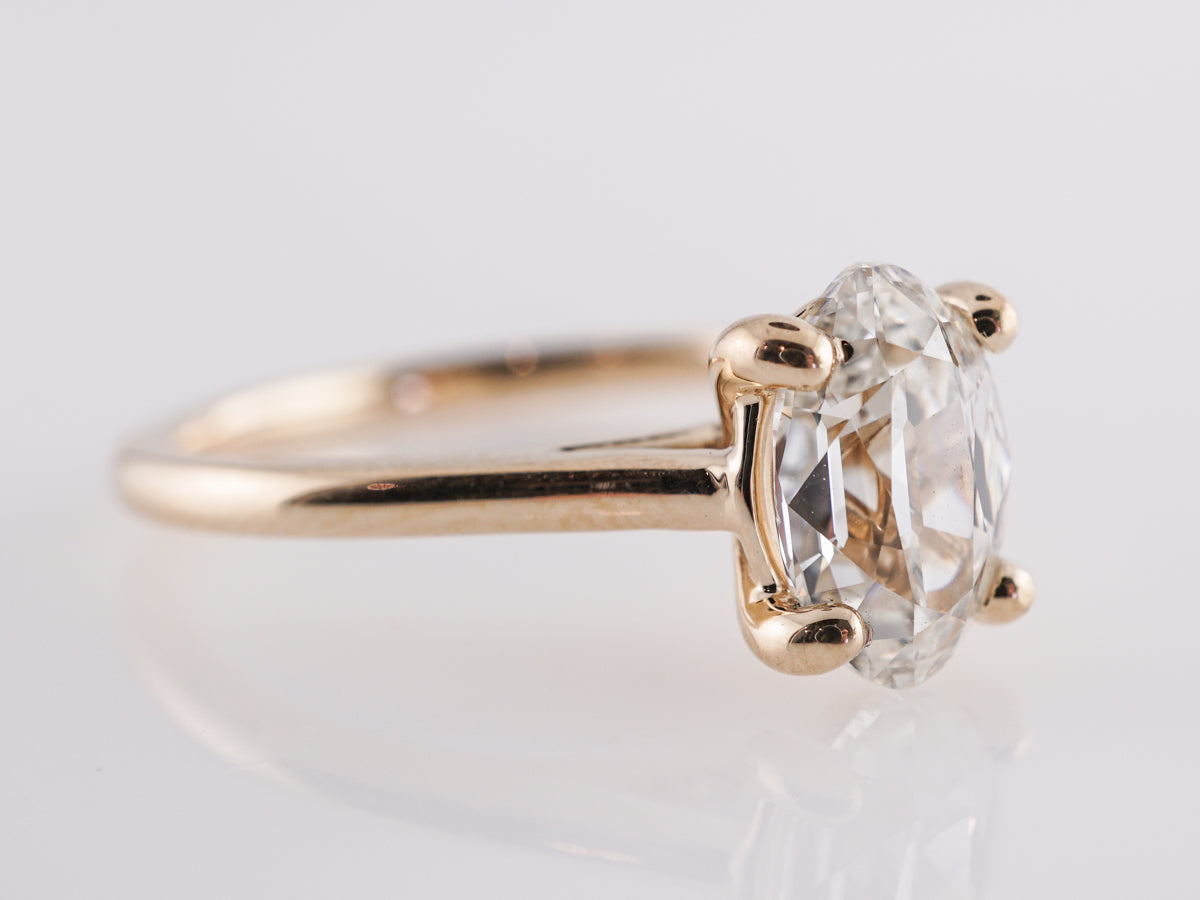 1.23 Oval Cut Diamond Engagement Ring 14k Yellow Gold. This gorgeous solitaire engagement ring features a 1.23 carat natural diamond in 14k yellow gold. The diamond is oval cut, with elongated, unique facets that create a sparkling fire and brilliance when catching light. The GIA-certified diamond is prong set and has an open work gallery mounting in 14k yellow gold. Fashionable and timeless, this engagement ring reaches 6.93mm above the finger and weighs a total of 3.0 grams.