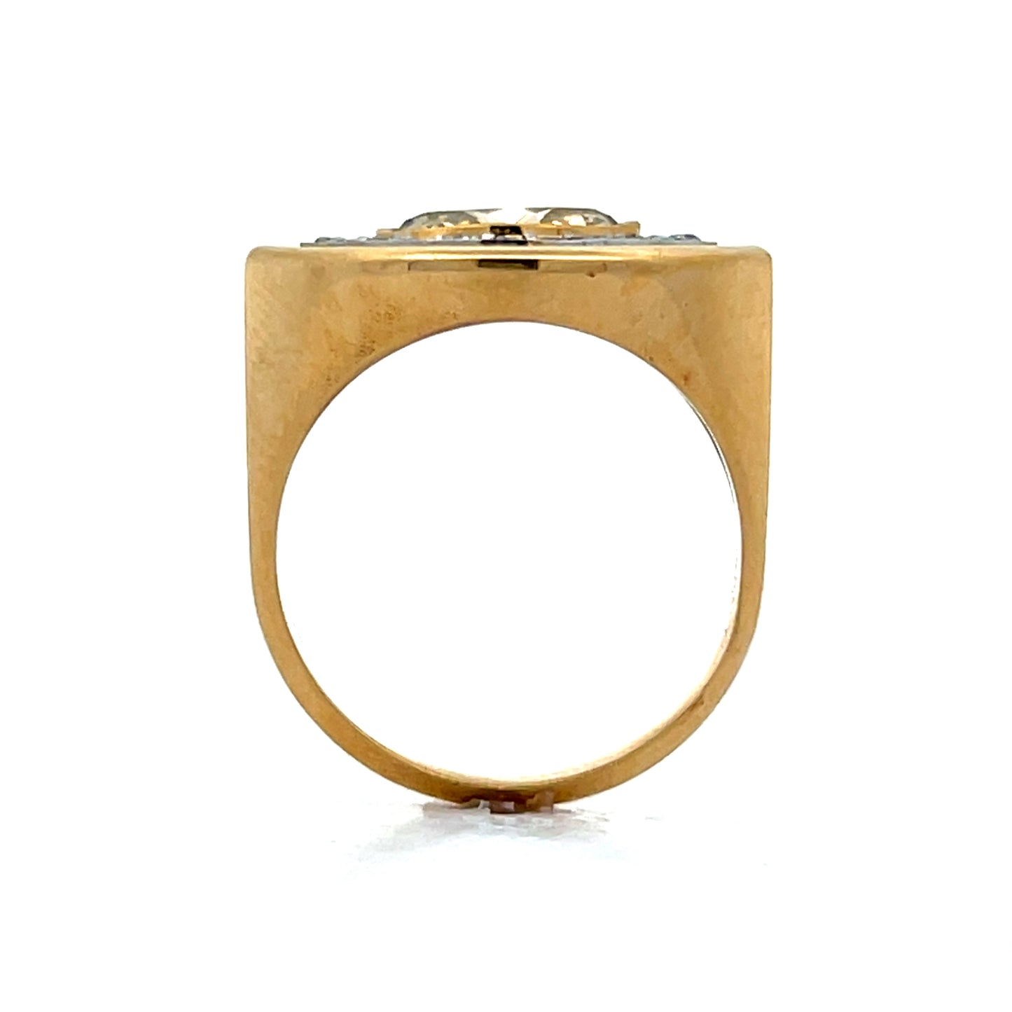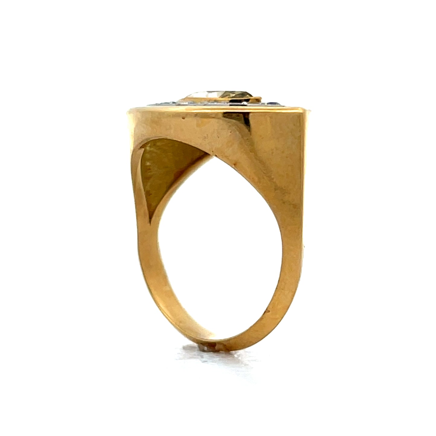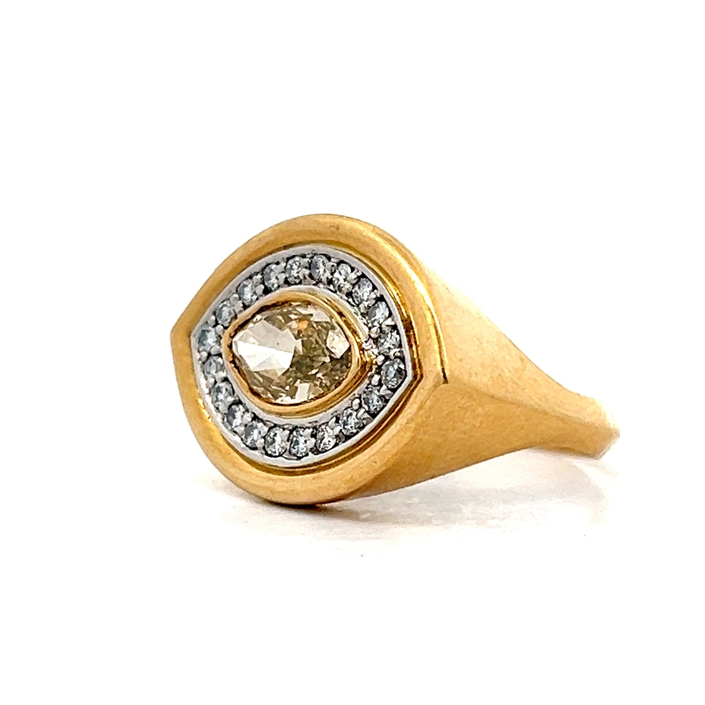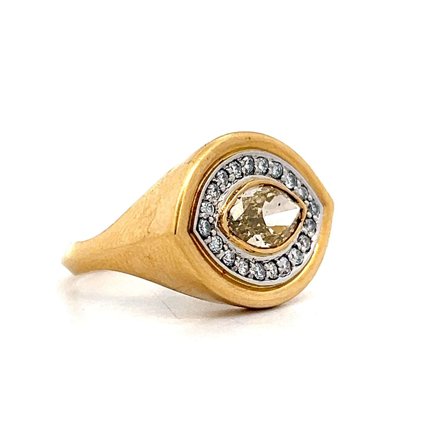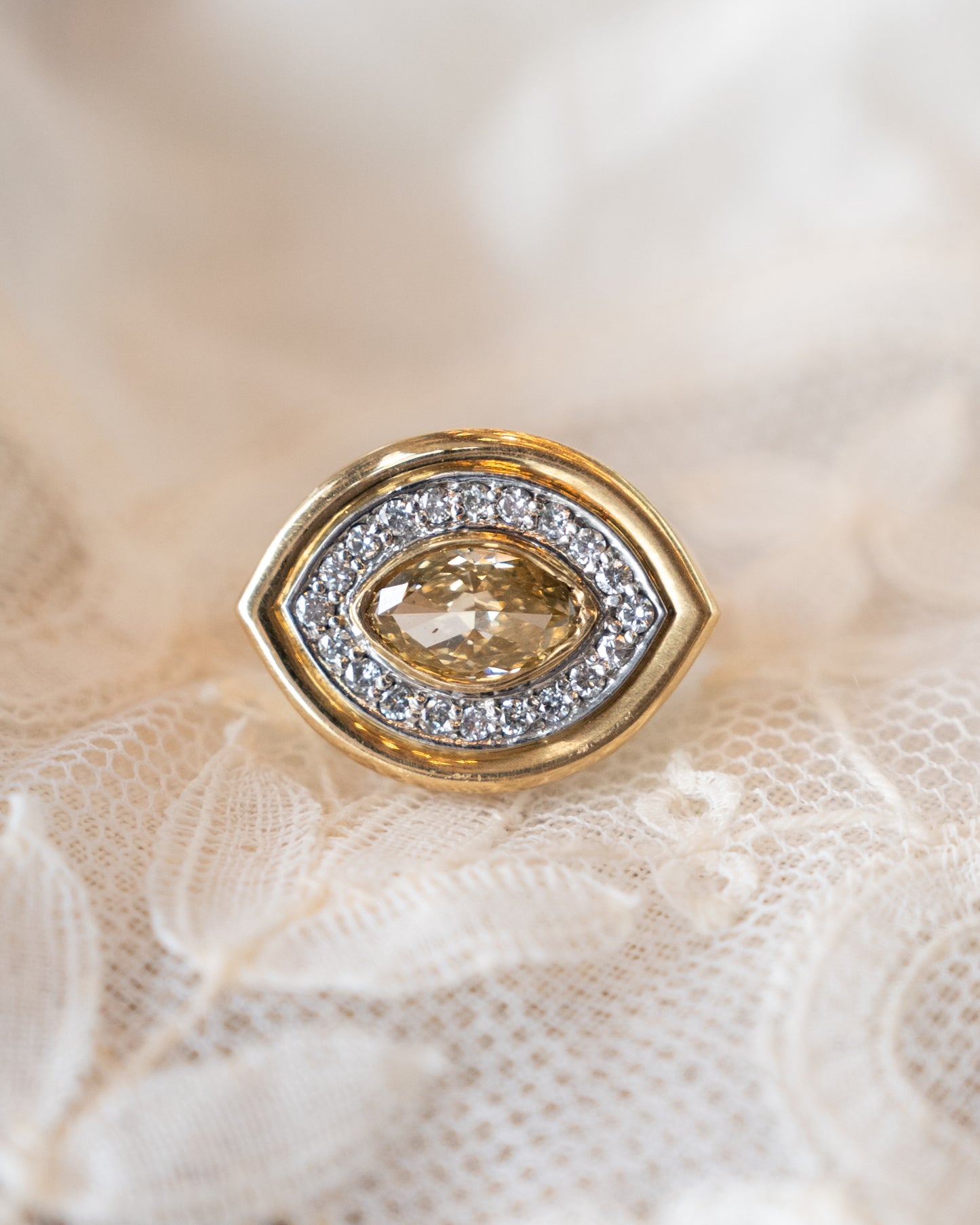 This cocktail ring features a fancy brownish yellow marquise cut diamond (1.00 carat) as the centerpiece in a bezel setting with an evil eye design. The main diamond is surrounded by twenty round brilliant cut diamonds (each 0.0125 carats, 1.35mm, totaling 0.25 carats) that are channel-set in a halo pattern.