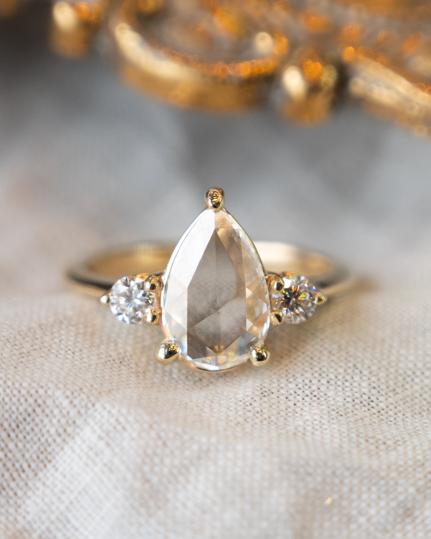 This three-stone engagement ring features a GIA-certified 1.25 carat pear rose cut diamond (VS1 clarity, F color) flanked by two round brilliant cut diamonds (.14 carats each, totaling .28 carats). Made 'By Filigree' in 14 karat yellow gold, the ring has a low-profile design with a thin band and prong settings that secure all three stones while maintaining a modern aesthetic. The total diamond weight is 1.53 carats.