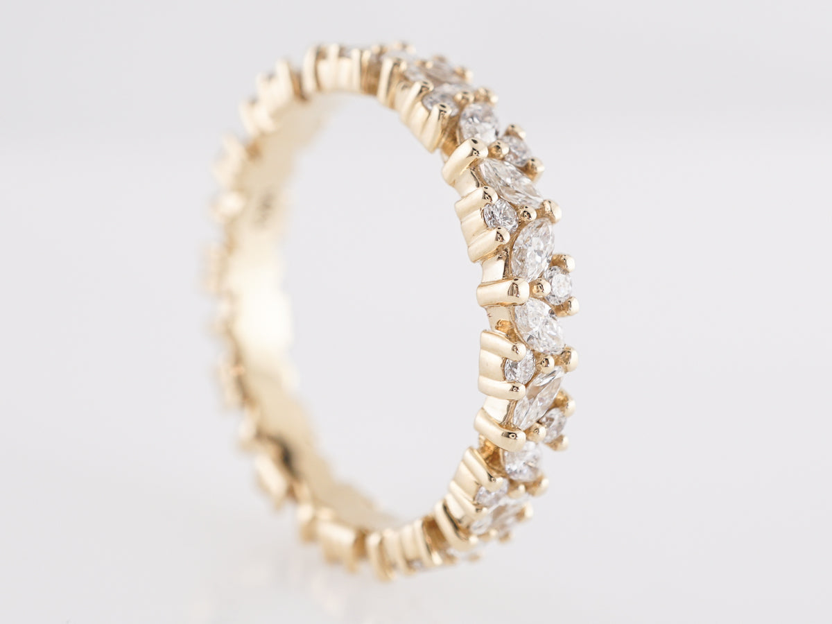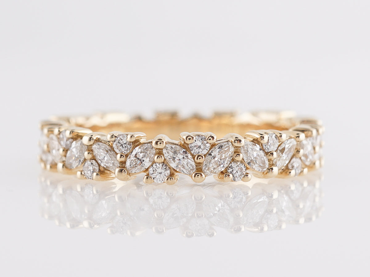 1.26 Diamond Eternity Band in 14k Yellow Gold. This band features rhythmic placements of Marquise and Round Brilliant cut genuine natural diamonds in a 14k yellow gold band. This diamond eternity ring, also known as an “infinity ring”, has style and sparkle. As a traditional symbol of “eternal love”, this modern eternity ring would make a marvelous wedding band for the diamond lover in your life!