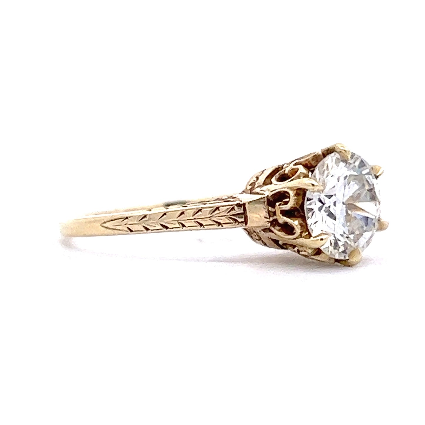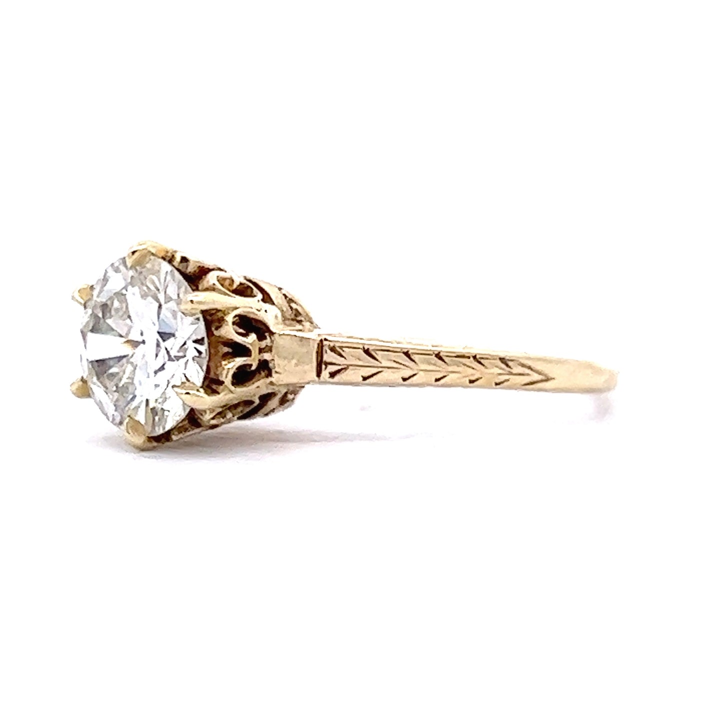 GIA-certified and elegant – This Art Deco solitaire diamond engagement ring features a 1.26 carat Round Brilliant cut diamond. The white diamond reflects high amounts of fire and sparkle when touched with light. The solitaire diamond showcases impressive clarity and a bright contrast in color tone to the yellow gold composition. The band of the ring features chevron engravings in 14 karat yellow gold. A romantic filigree crown basket holds the diamond. This ring showcases the detailed beauty of Art Deco engagement rings.