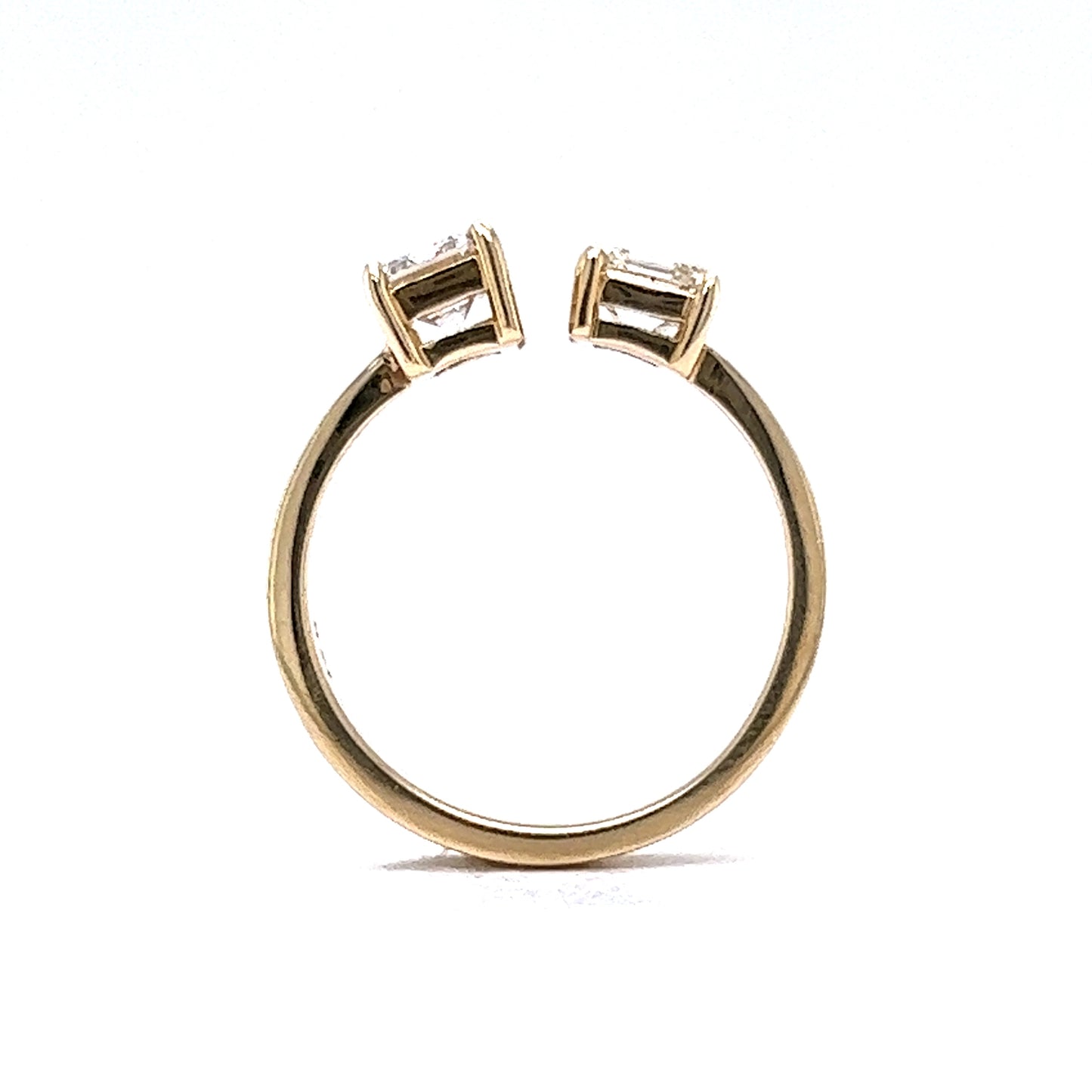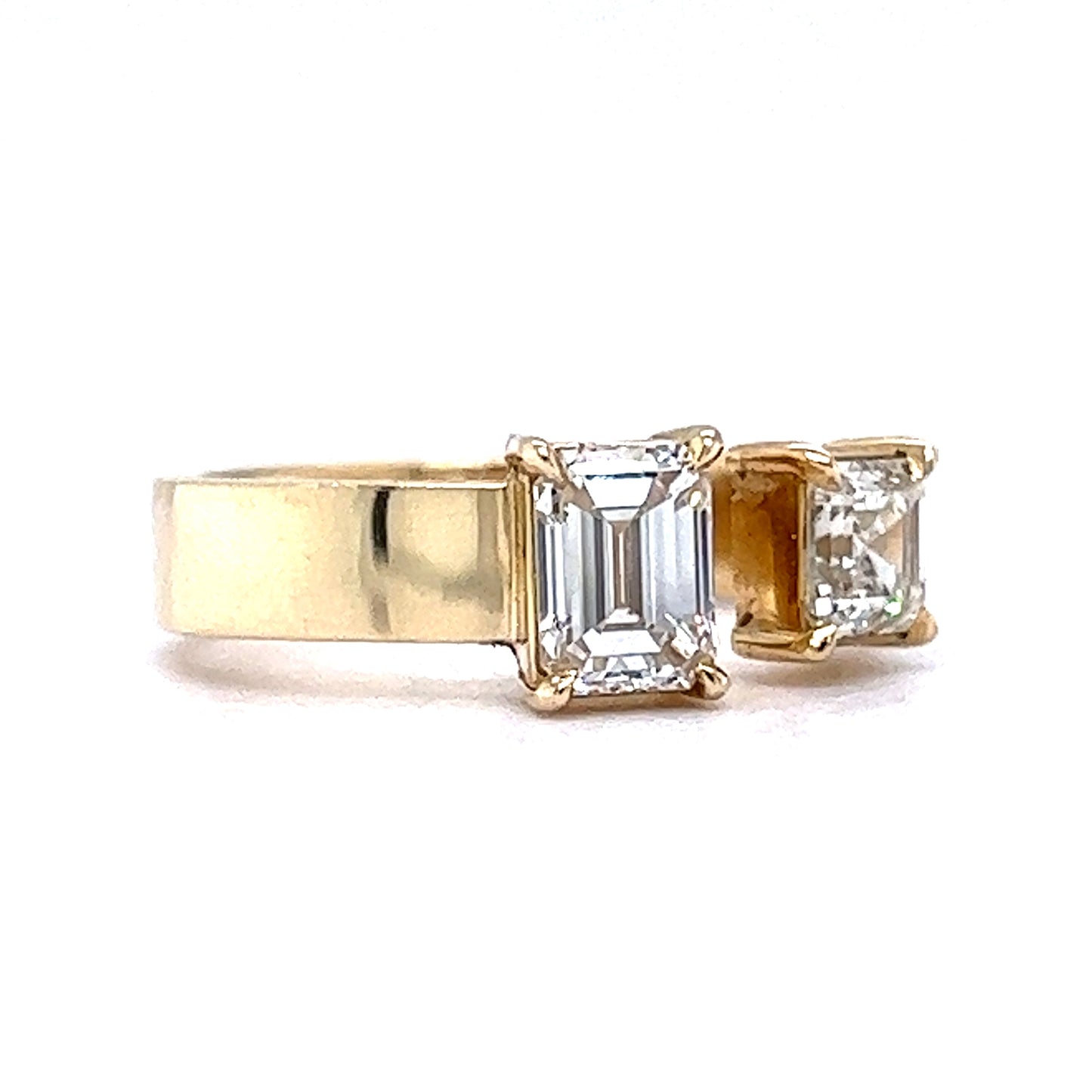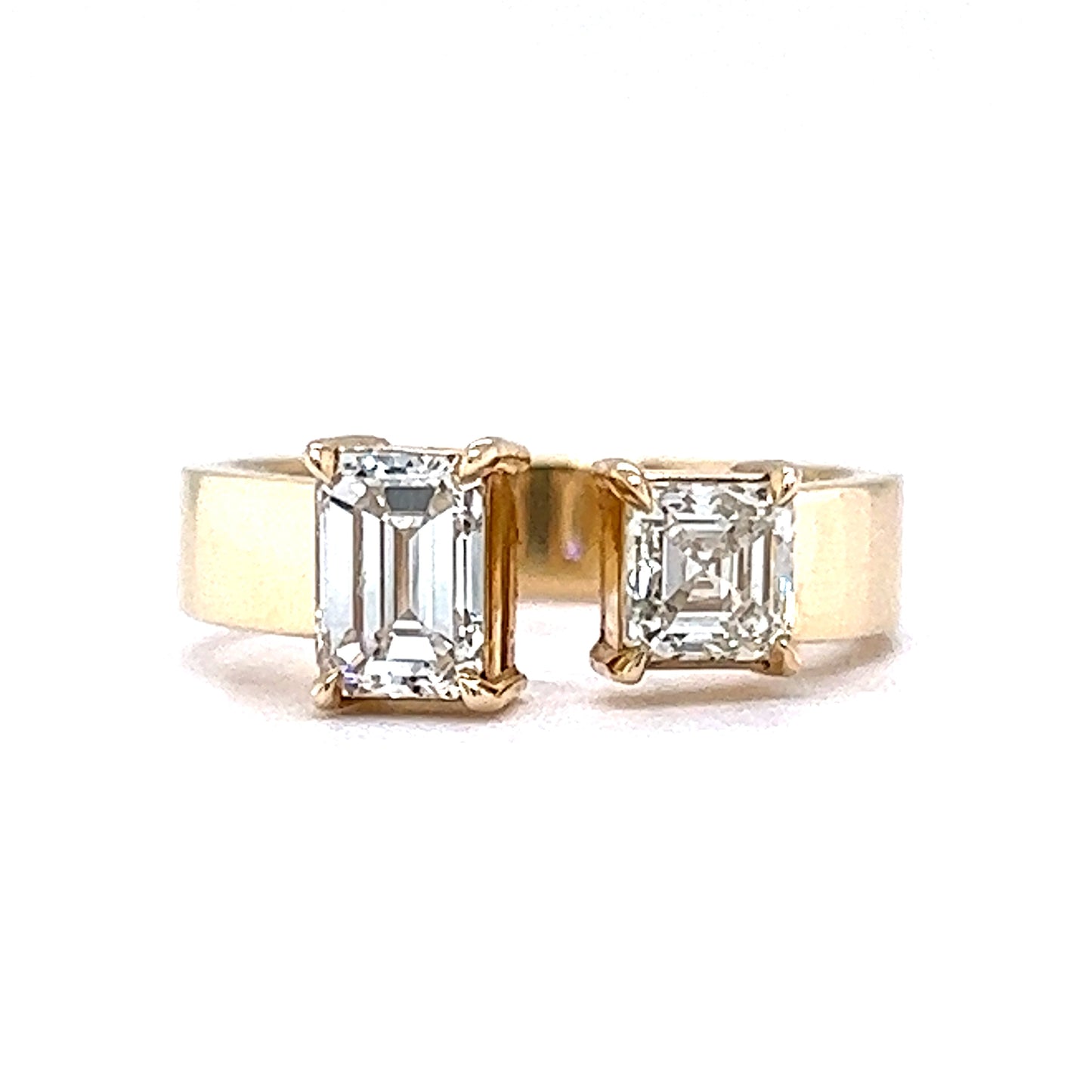 This mixed diamond cut open ring features 1.27 carats of diamonds finished in polished 14 karat yellow gold. The primary stone is a .75 carat emerald cut diamond. The larger emerald cut diamond is mounted in four prongs. Set on the opposite side of the open band, a .52 carat Asscher cut diamond decorates the end of the ring. The Asscher cut diamond has a faint, warm hue and the emerald cut diamond is near colorless. The thick, 14k gold band measures 7.12mm wide and has a sleek, flat profile. The variety of diamond cuts brings dimension to the look and adds extra brilliance to this unique, custom band. Wear this ring as a stacking ring or as a wedding band to enhance the sparkle of any engagement ring!