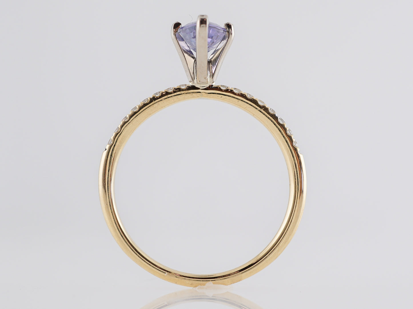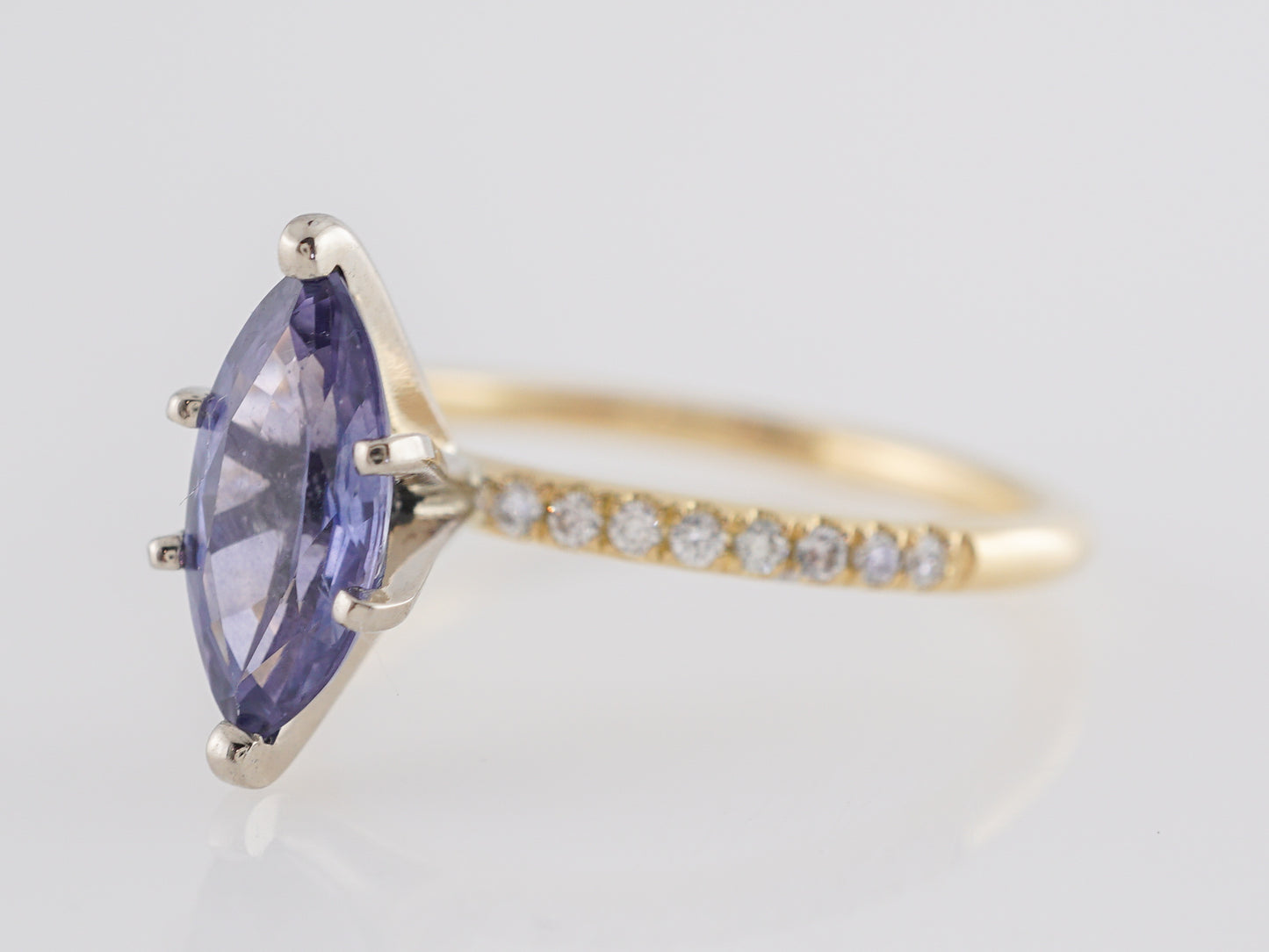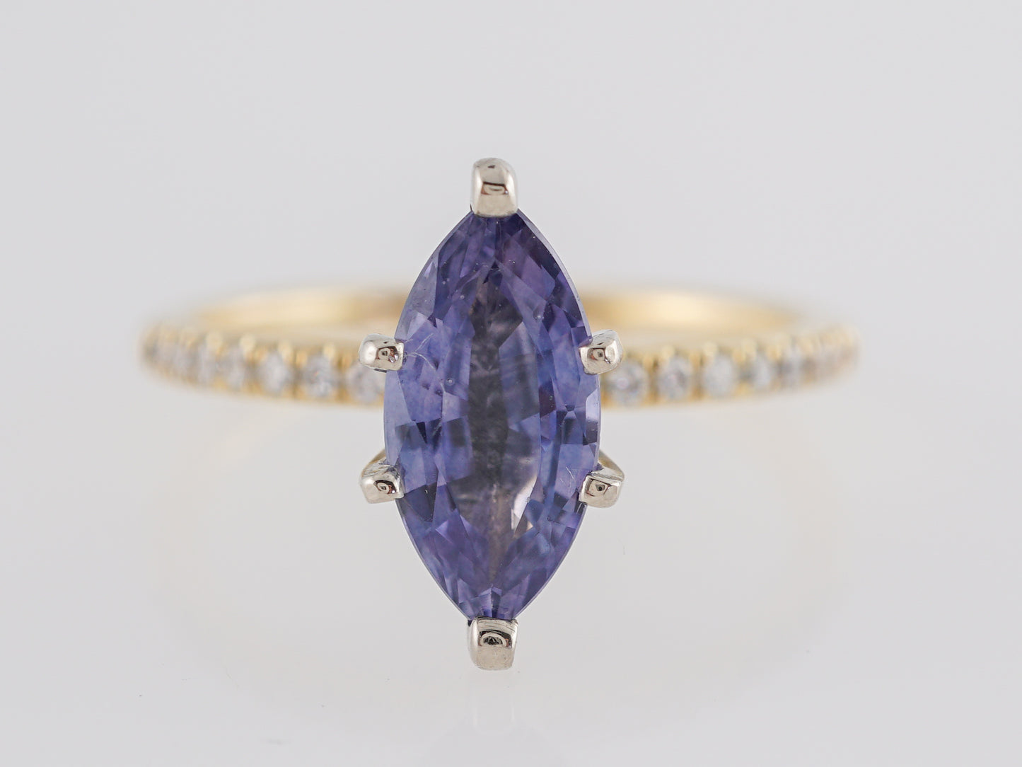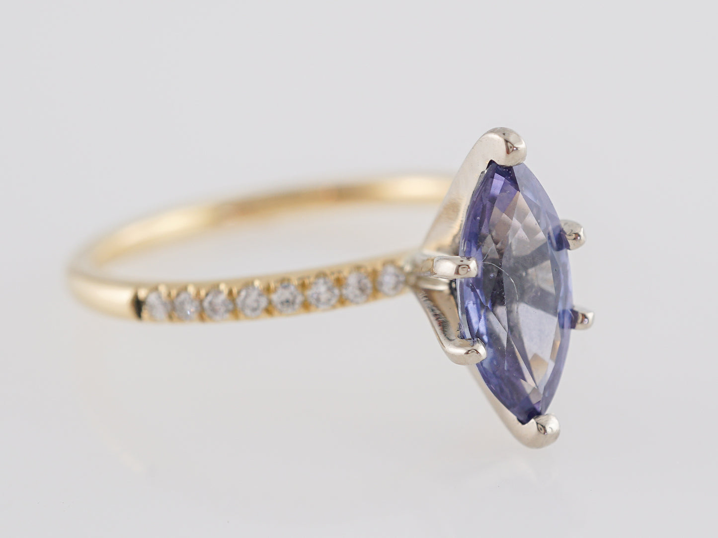 1.27 Marquise Cut Sapphire Engagement Ring in Yellow Gold. This majestic sapphire engagement ring features a 1.27 carat marquise cut sapphire and .08 carats of natural diamonds in 14k yellow gold. The ultraviolet hue of the dark blue sapphire is cut into marquise shape, with elegant, elongated, kite shaped facets that allow for a strong brilliance and sparkle. The sapphire is prong set on a cathedral mounting. The 14k yellow gold band features eight petite diamonds that melt into the shoulders of the band. This striking engagement ring is a size 6.75 but can easily be resized upon request.