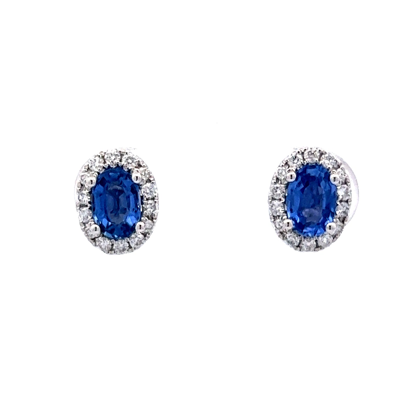 These modern classic stud earrings feature a dazzling halo of twenty-eight (28) diamonds around oval cut blue sapphires. Crafted in 14 karat white gold, the earrings have a total weight of 1.30 carats. These earrings are of perfect size for all day wear and are a perfect way to add some color into your earring rotation.