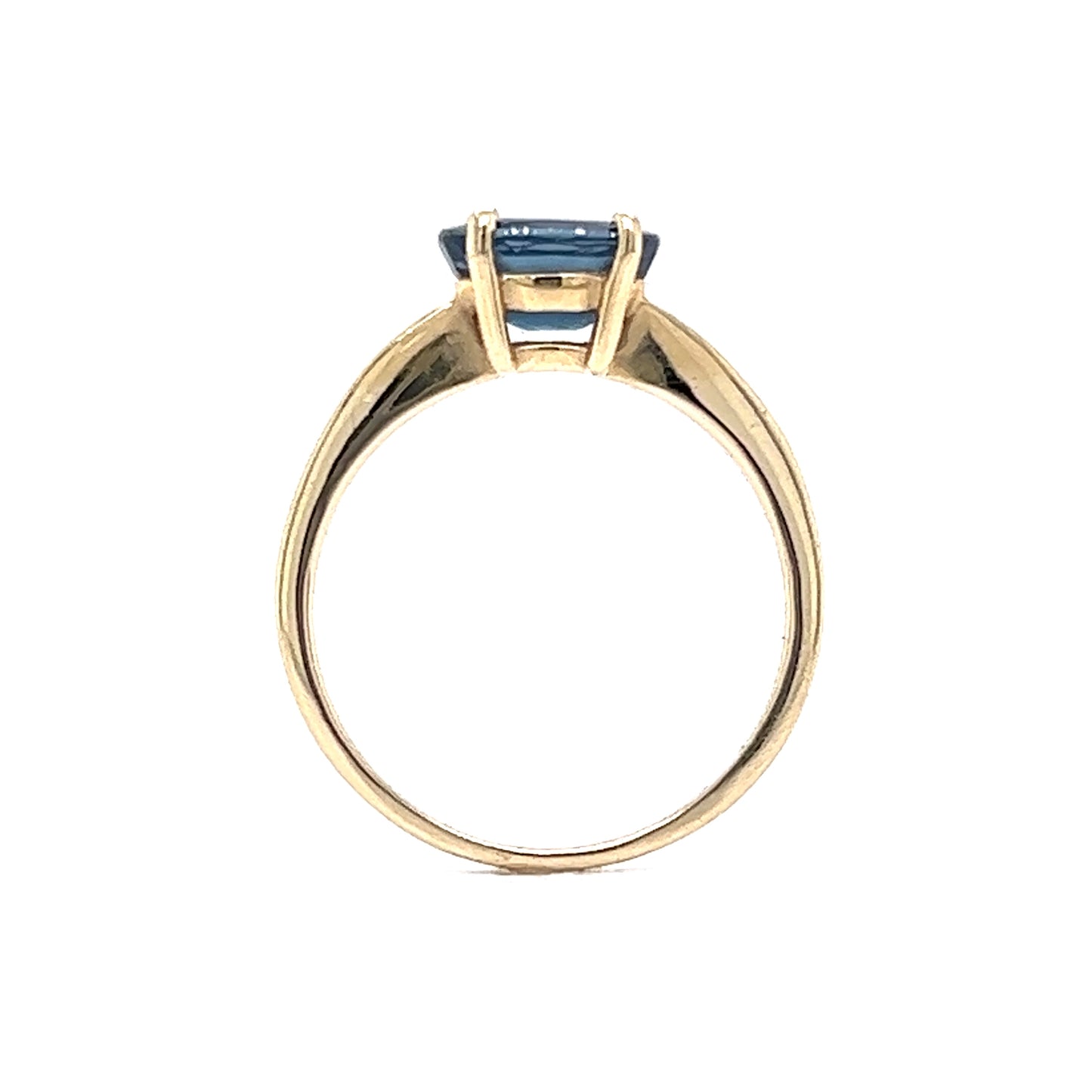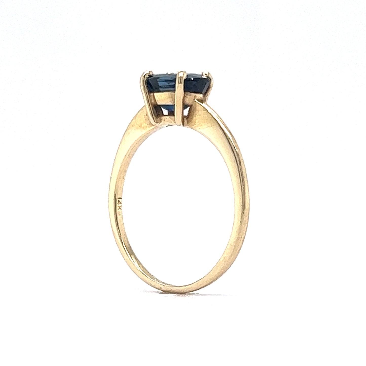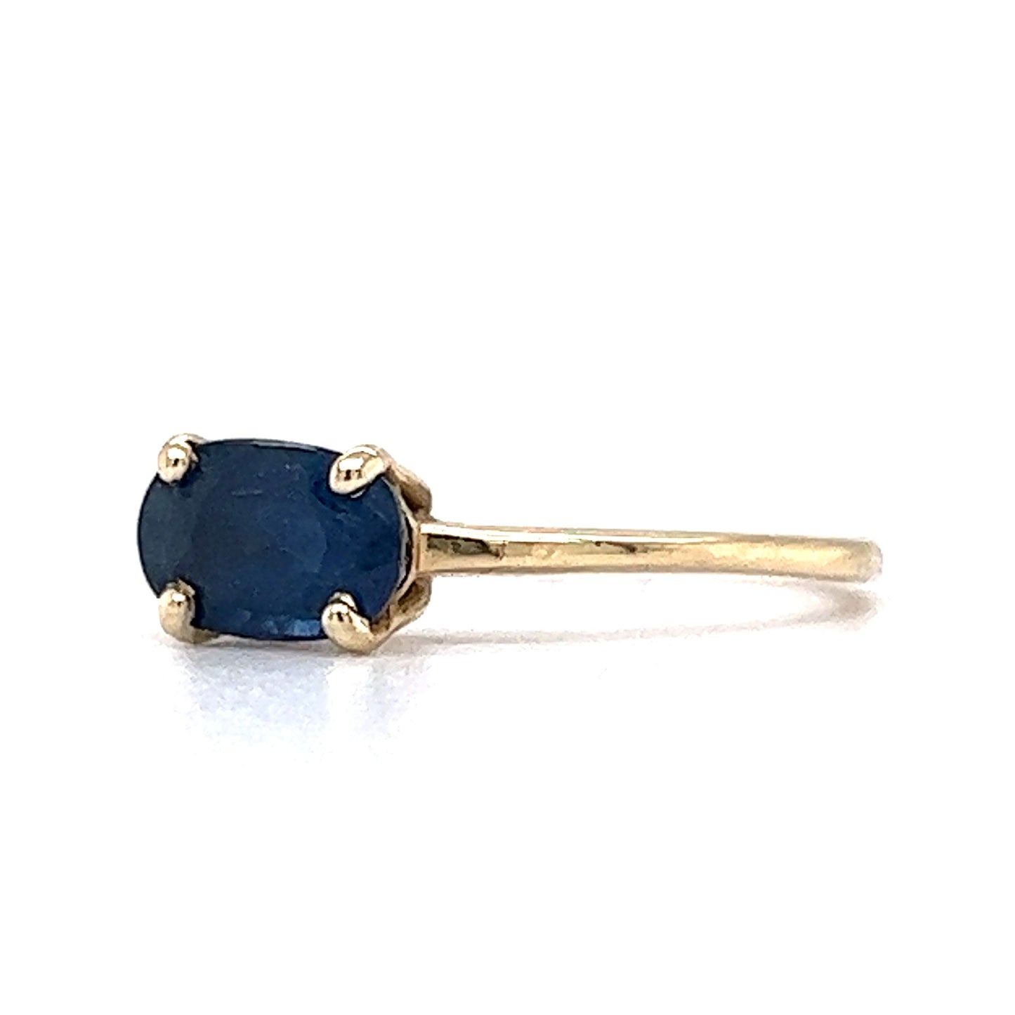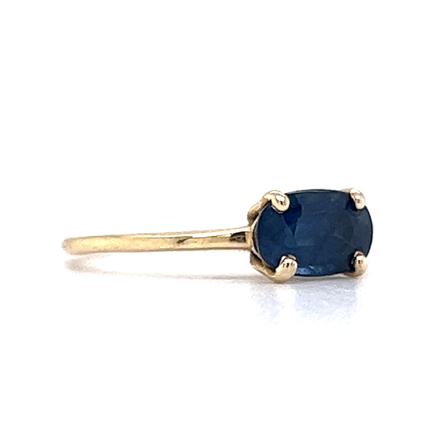 1.30 Carat Solitaire Sapphire Engagement Ring in 14K Yellow Gold. This elegant solitaire diamond is prong set on a shining, yellow gold band. The natural blue sapphire showcases hues of medium-dark vivid blue. The oval cut of this precious gemstone offers the brilliance and fire in an elongated shape. From the profile, the gallery view has a small window underneath the elevated stone. This ring measures 5.40mm above the finger and can be resized upon request.