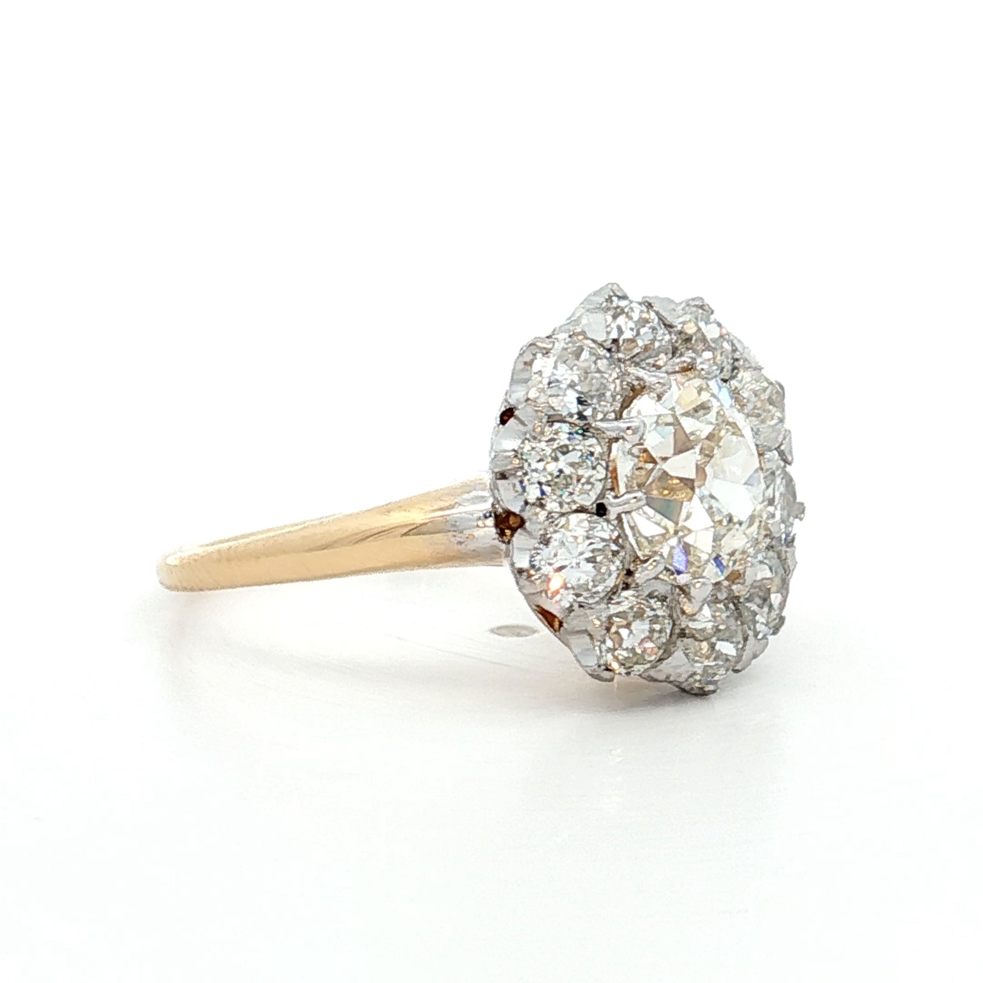 This Victorian Era halo cluster engagement ring centers a 1.30 carat old mine cut diamond with K color and VS2 clarity. Ten natural diamonds, each measuring 3.0mm and weighing .11 carats, create the halo setting around the center stone for a total accent weight of 1.10 carats. The diamonds are held by 18 karat white gold prongs while the band is made of 18 karat yellow gold, creating the two-tone metal design typical of Victorian period.