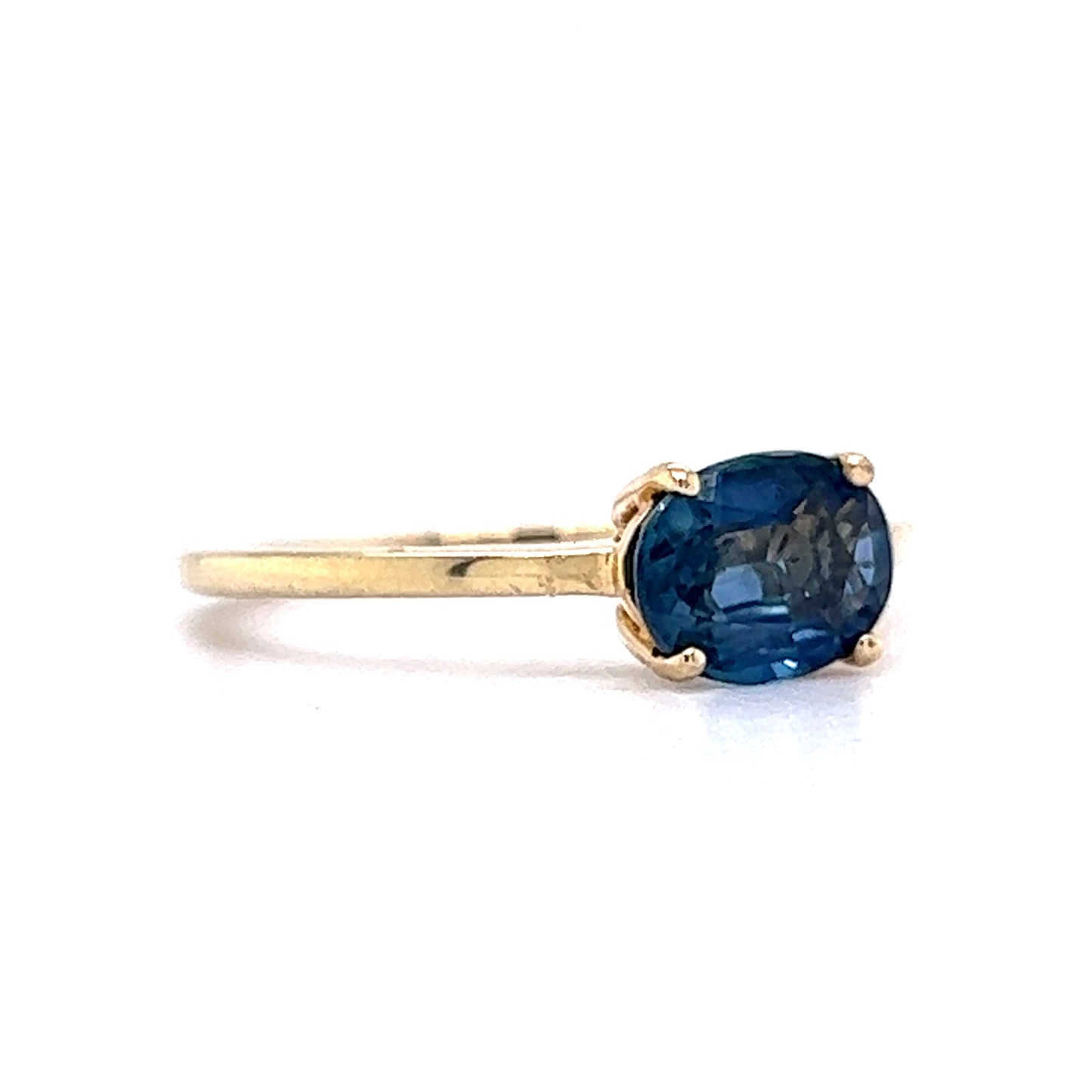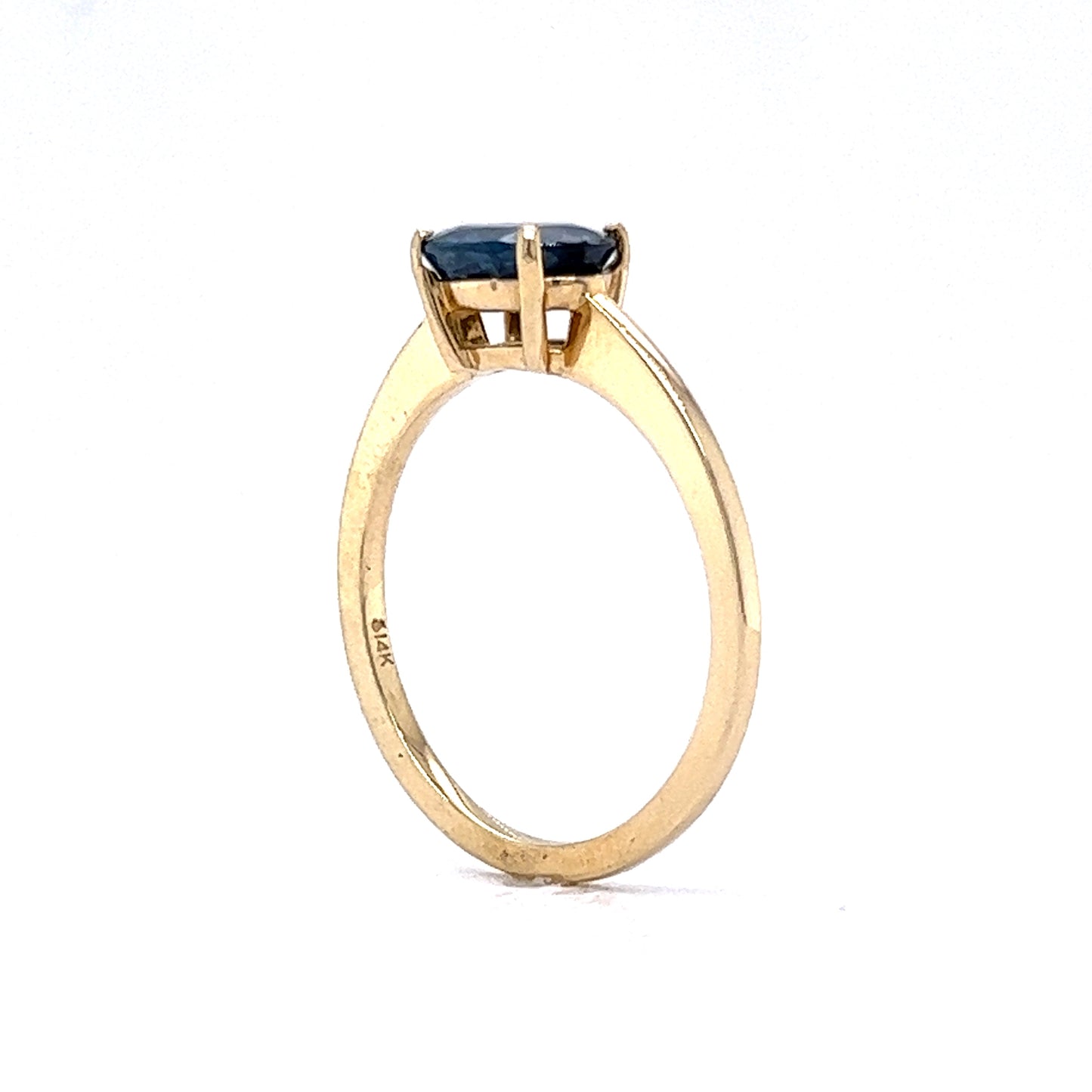 1.31 Carat Sapphire Engagement Ring in 14K Yellow Gold. This modern engagement ring features a 1.31 carat natural blue sapphire. This gorgeous sapphire reflects hues of deep navy blue and is elegantly set in a four(4) prong, 14k yellow gold band. Slightly elevated from the band, the gallery view shows precision and a sleek elegance to this modern engagement ring. If you are looking for a modern engagement ring in sapphire, this style of engagement ring is the perfect choice!