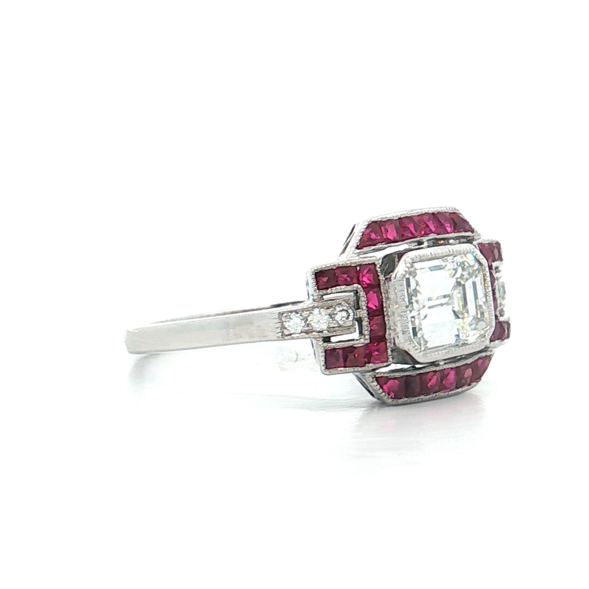 A halo of French cut rubies surrounds the center stone, with each 1.00mm ruby contributing to a total of .91 carat. Twenty-eight round brilliant cut diamonds are channel set along the shank, grading G/H color and VS2 clarity, and totaling .91 carat (.0325 each). Milgrain detailing runs along the bezel and channel edges, and the 1.6mm shank width keeps the ring comfortable for daily wear.