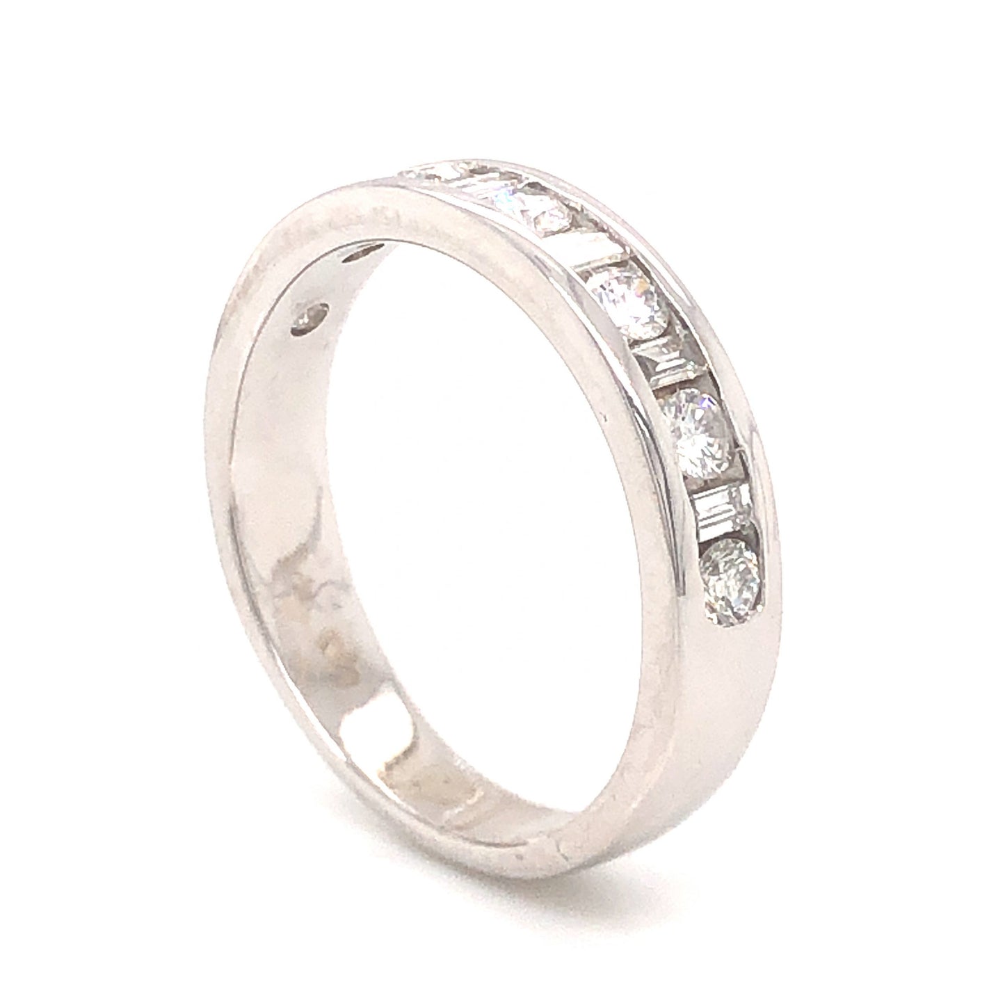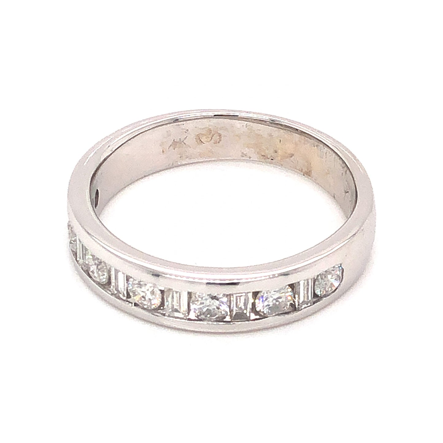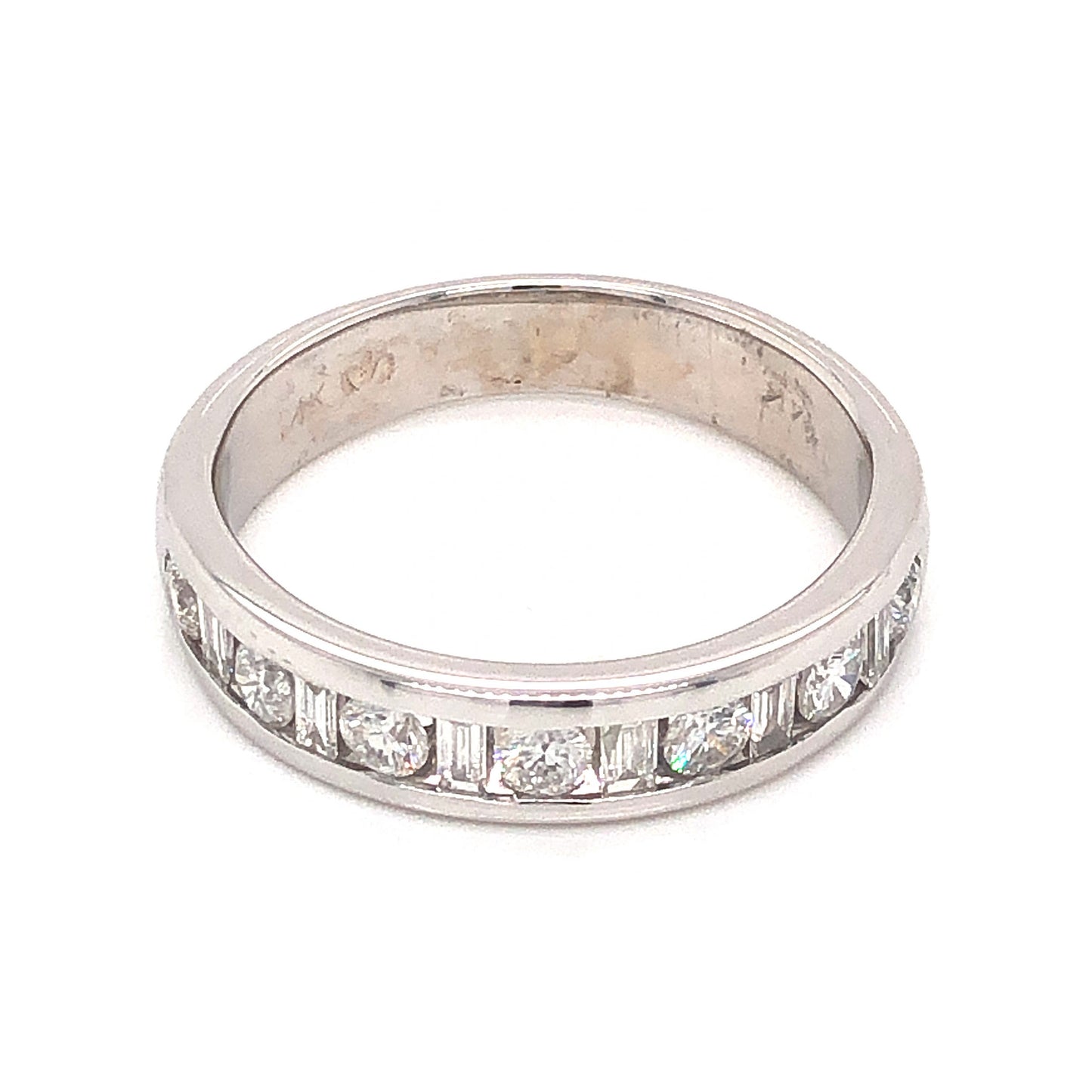 1.32 Mens Diamond Wedding Band in 14k White Gold. This modern men’s wedding band features 1.32 carats of diamonds finished in polished 14 karat white gold. Seven (7) .12 carat diamonds and six (6) .15 carat diamonds are channel set on the front half of the ring. The diamonds are near colorless and brilliant, with a stylish alternating pattern of baguettes and round cut diamonds for added texture and sparkle. The white gold band is 5mm wide and reaches 2.33mm above the finger.
