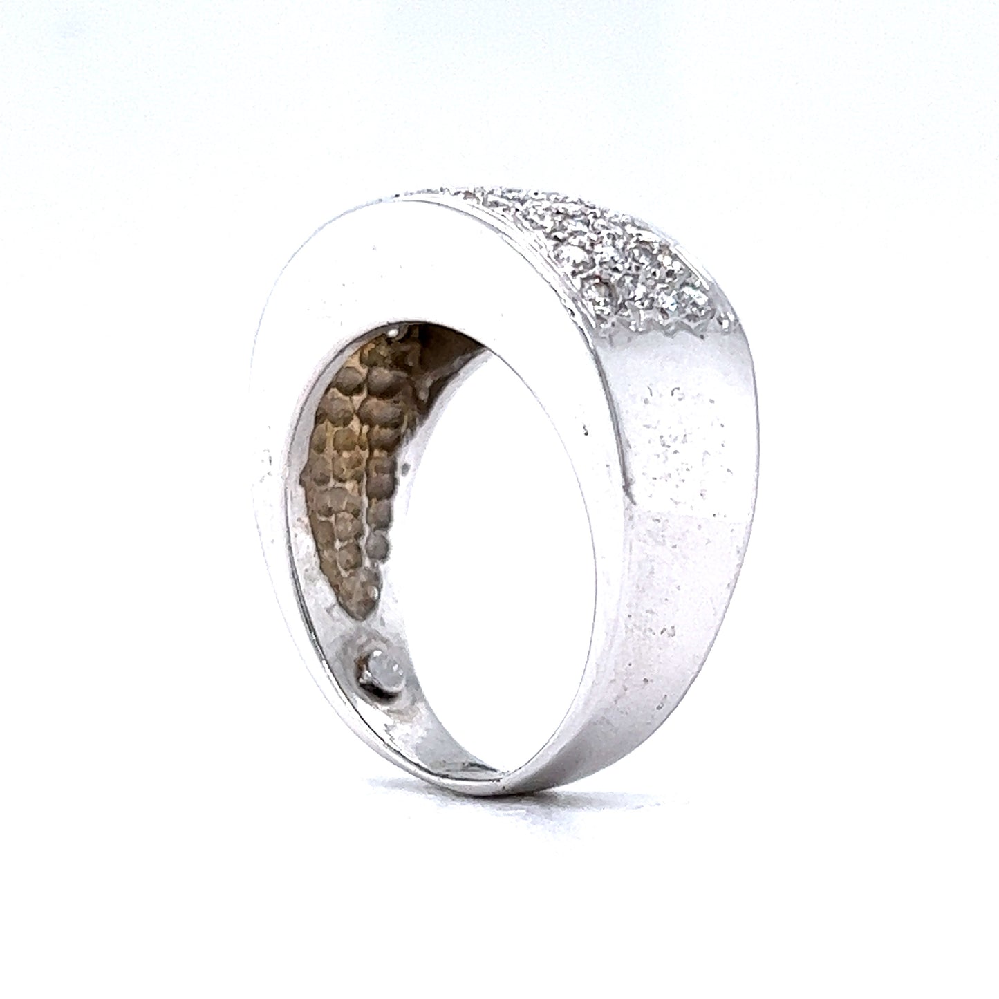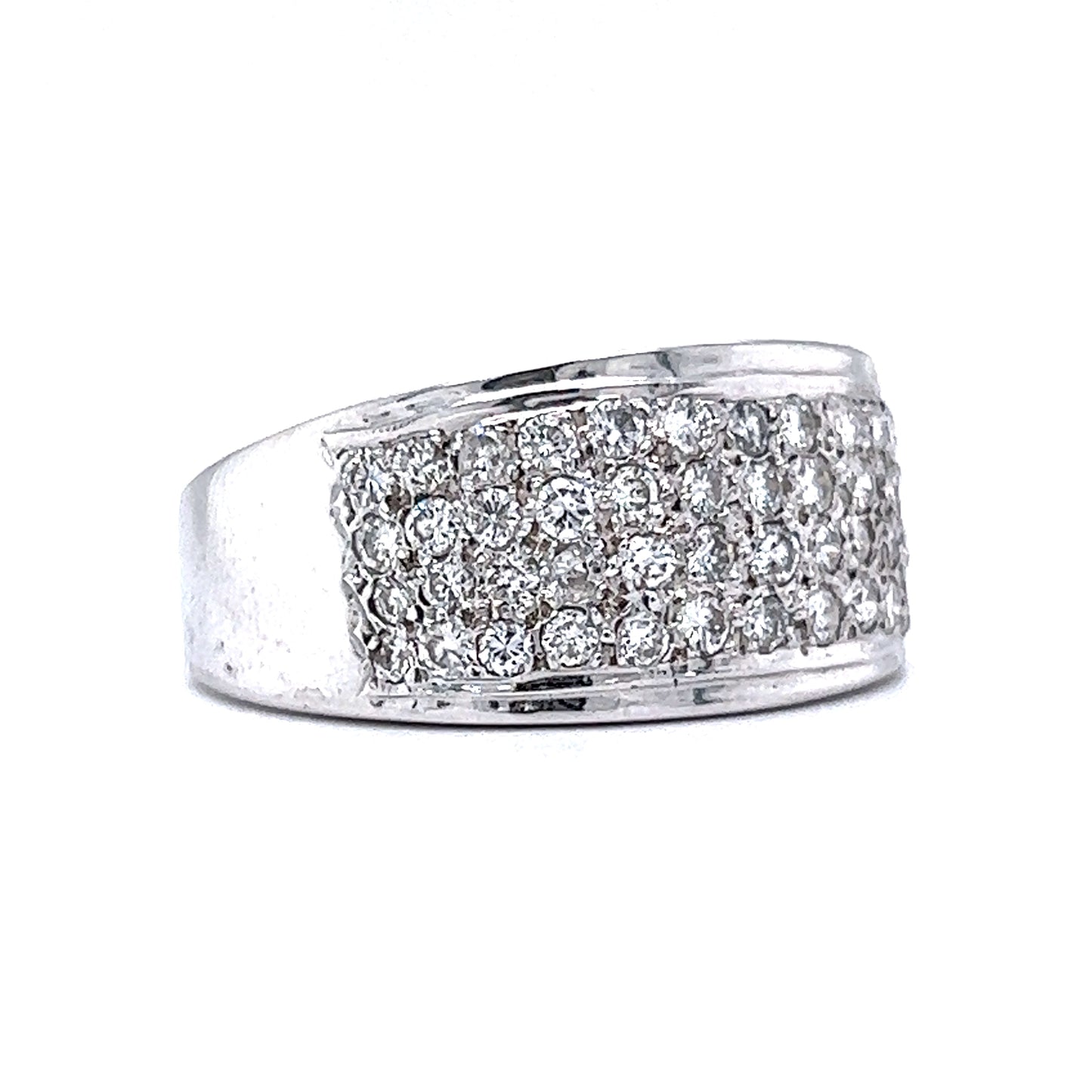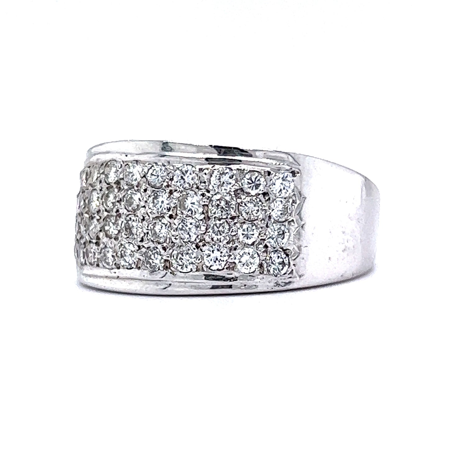 This modern pave cocktail ring features 1.32 carats of diamonds finished in shimmering 14k white gold. Sparkling from every angle, forty-four (44) .03 carat diamonds, each near colorless and eye clean, are pave set on the front of the band. The ring measures 11.35mm wide and features soft engravings that line the diamond collection. Finished on a slightly tapered white gold band, this right hand ring will be the shining piece in your jewelry collection!
