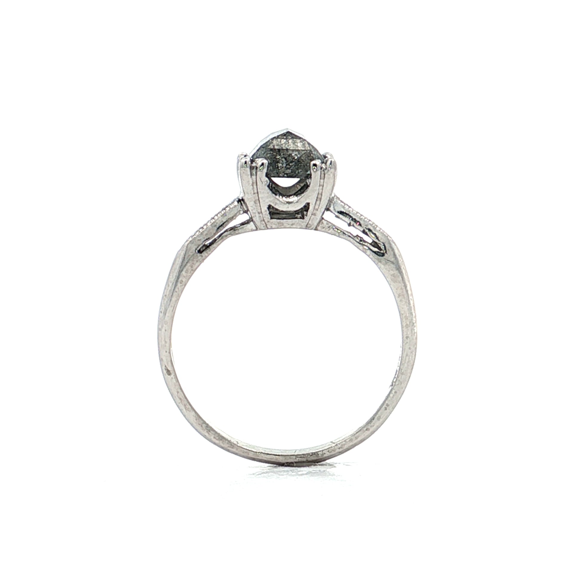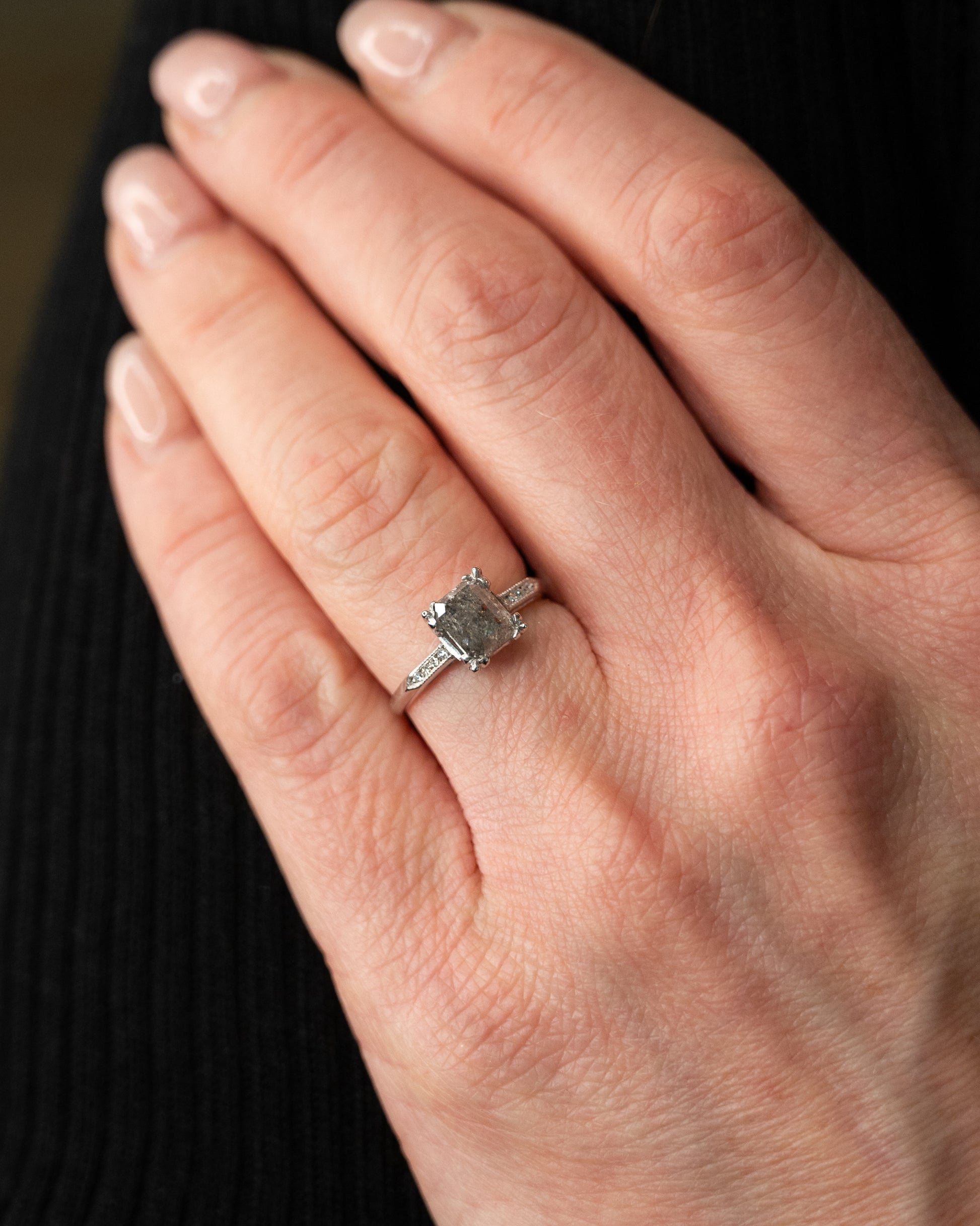 This modern engagement ring features a 1.33 carat emerald rose cut diamond in a platinum setting with eight round brilliant white diamond side stones. The center diamond is salt and pepper, meaning it contains visible black and white inclusions that create a speckled, organic pattern throughout the stone.