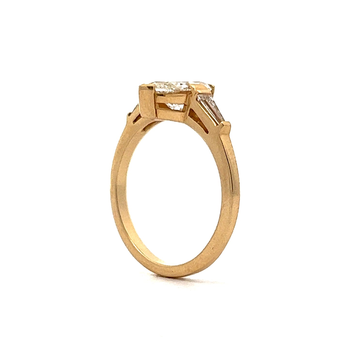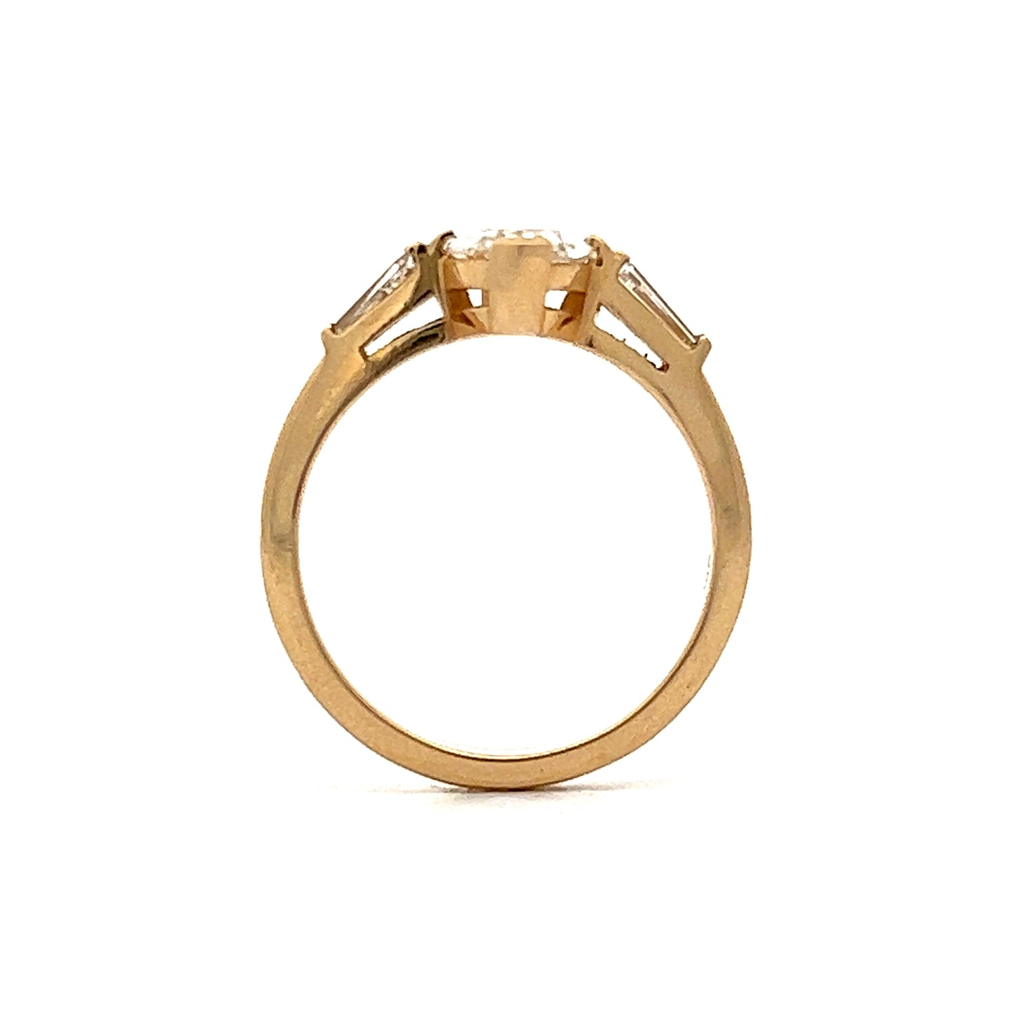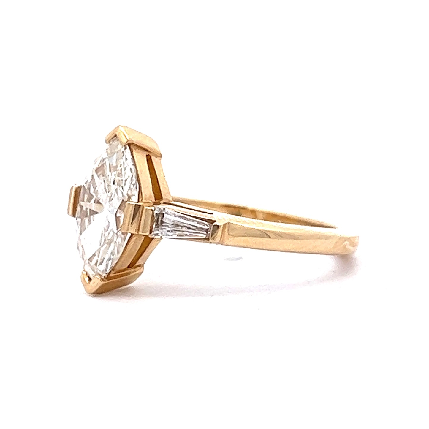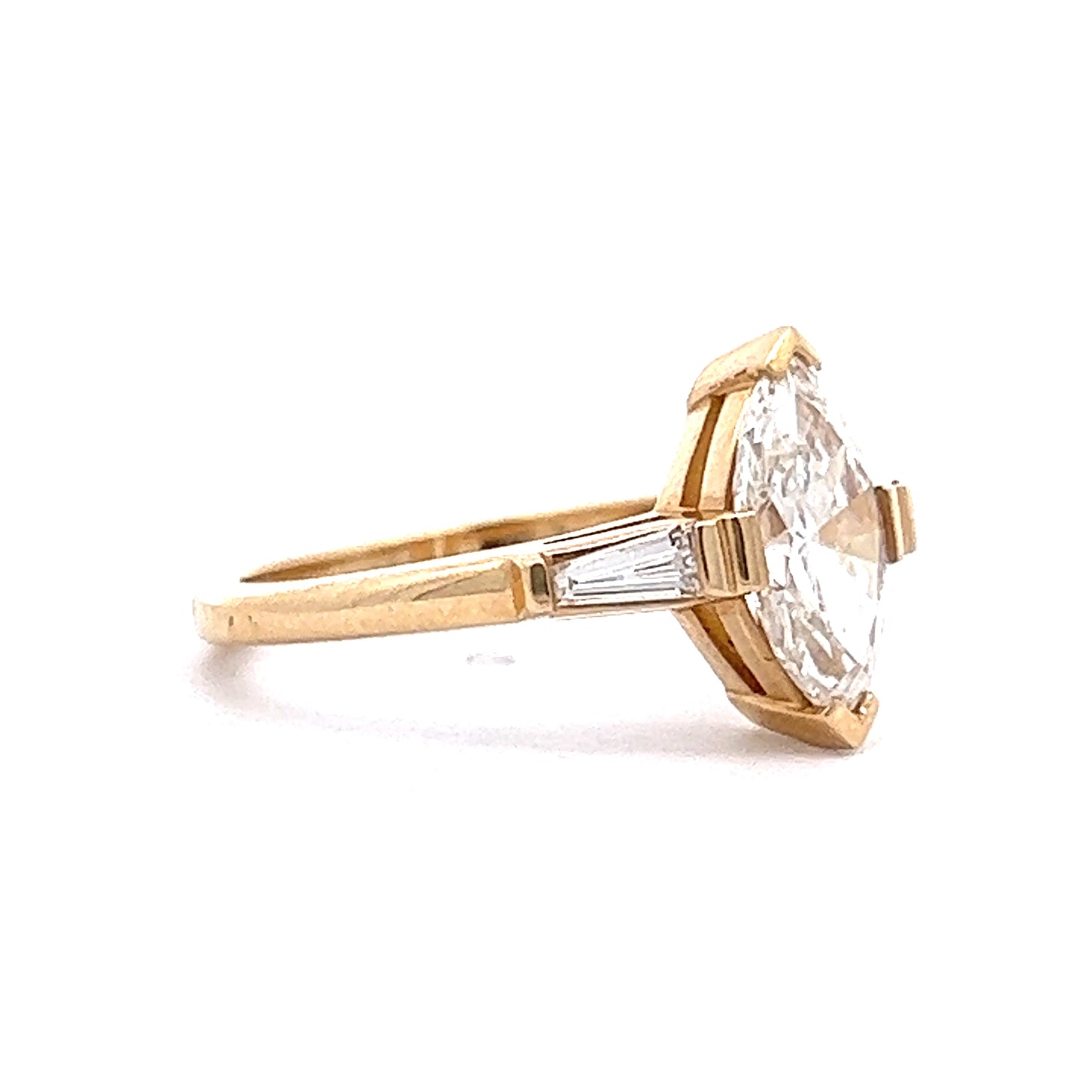 This dreamy diamond engagement ring made custom By Filigree features a GIA certified marquise cut diamond and diamond accents in 14 karat yellow gold. The center near colorless diamond is multifaceted and highly brilliant. Set in structured prongs, the marquise diamond is flanked by two (2) .12 carat tapered baguette diamonds. The engagement ring has a harmony of minimalism but decorated design. The diamonds are fitted in classic basket mountings on a perfectly polished 14 karat yellow gold band.