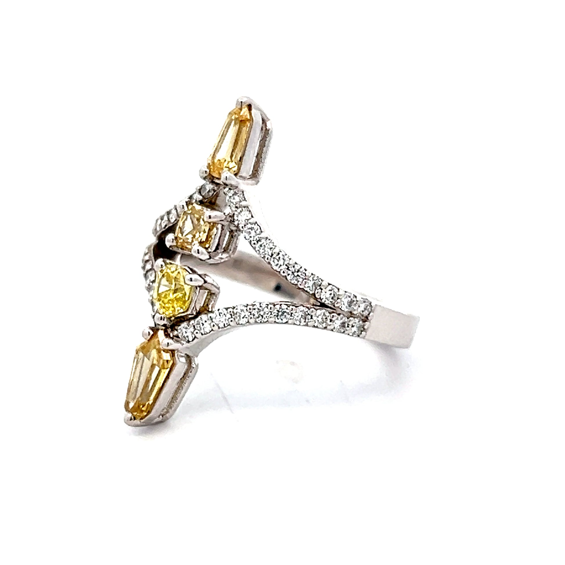 This modern cocktail ring features a distinctive Navette design cast in 18-karat white gold with a fancy intense yellow diamond at its center. Shield and cushion-shaped diamonds (totaling .91 carats with VS2 clarity) form the centerpiece, creating an unusual and unique focal point. The band comes alive with 40 round brilliant cut accent diamonds (1.3mm each, weighing .42 carats combined), bringing the total diamond weight to 1.33 carats. Each diamond sits in a prong setting that maximizes light penetration for exceptional brilliance and fire. The white gold provides a clean, bright backdrop that makes the yellow diamonds pop with vibrant contrast.