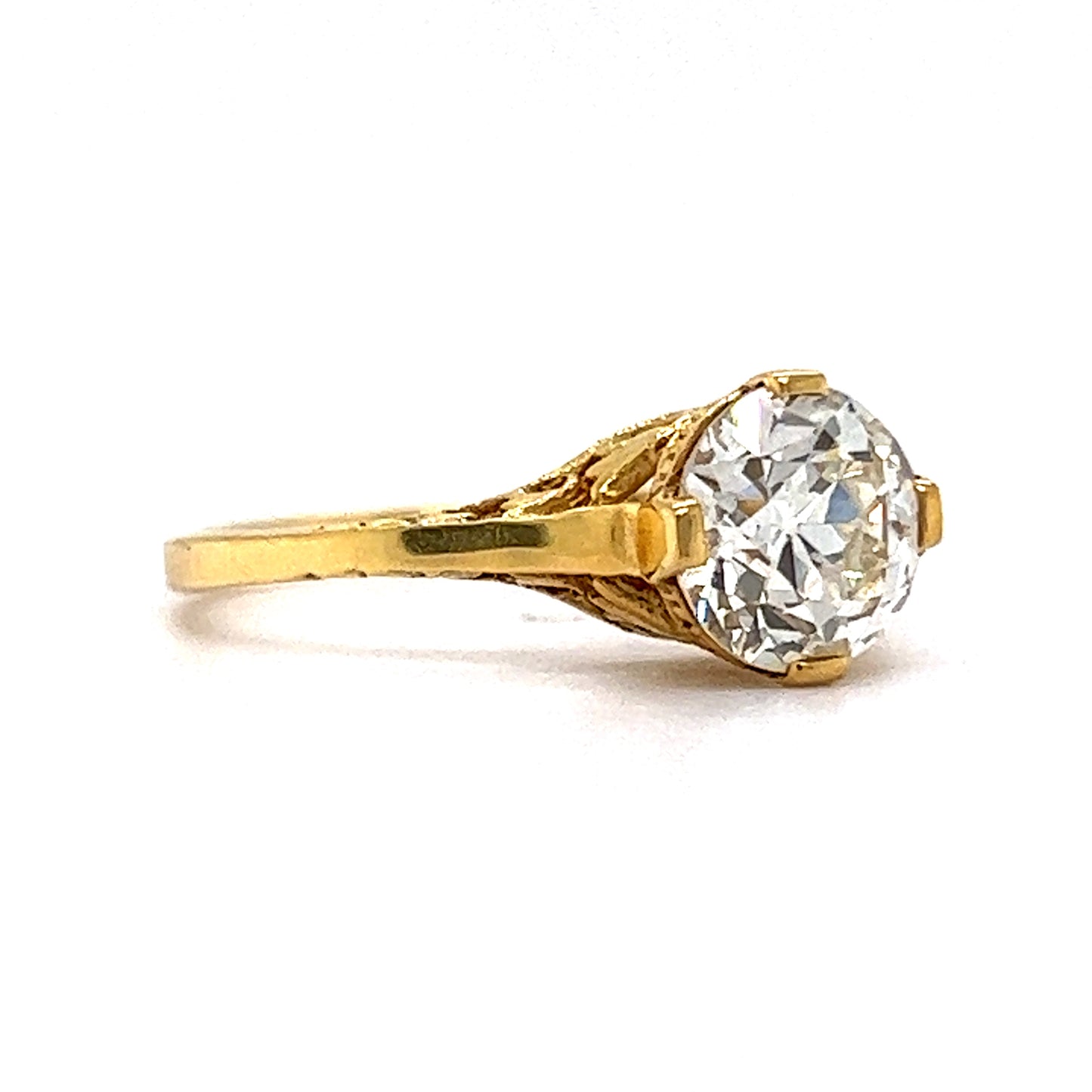 This enchanting Art Deco engagement ring features a 1.33 carat Old European cut diamond in 18 karat yellow gold. The center stone has a VS1 clarity and the K color gives it some warmth. The diamond is set in a secure four prong mounting and is surrounded by an intricate filigree design. The profile of the ring is adorned with an ornate engraving, finished on a polished 18 karat yellow gold band.