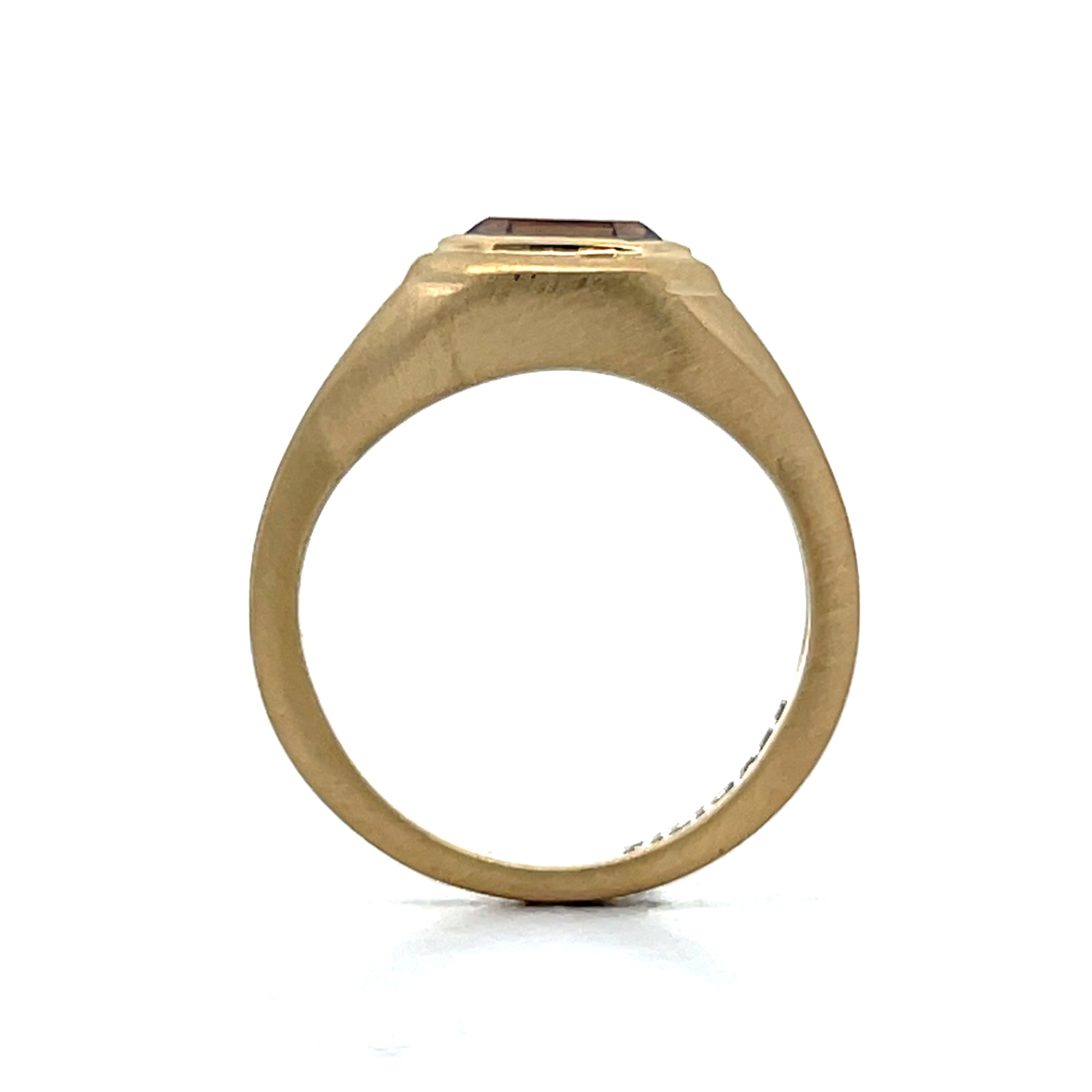 The bezel setting not only adds style to the ring but also provides extra protection for the diamond. The band has a brushed finish that creates a soft glow and contrasts nicely with the sparkle of the brown diamond.