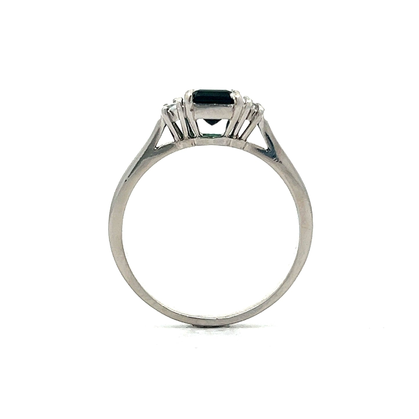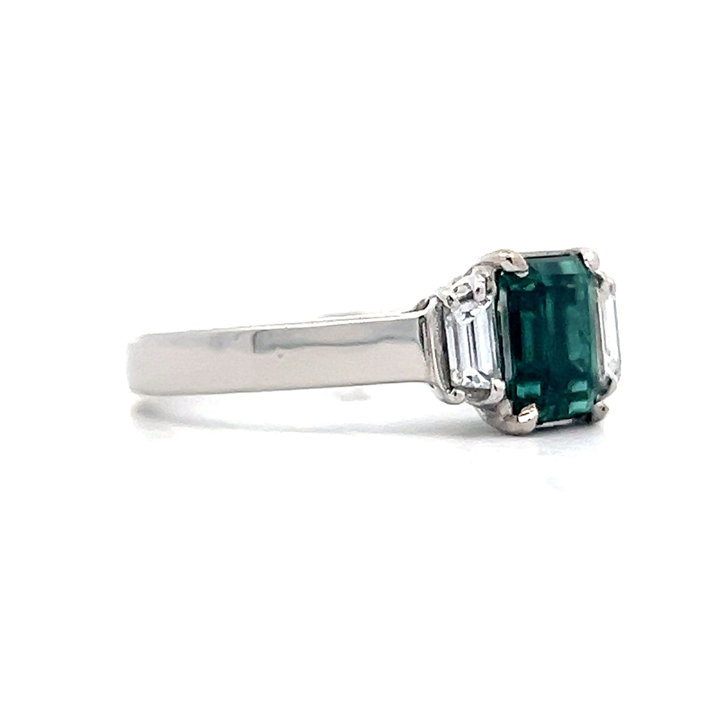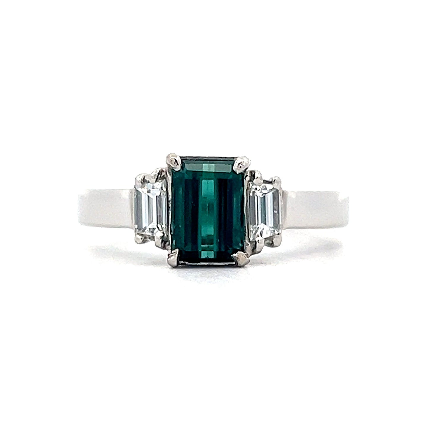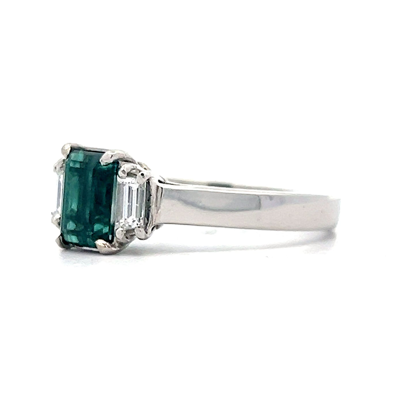 This modern engagement ring is the perfect blend of elegance and sophistication. Crafted in platinum, the sleek and polished metal provides a stunning backdrop for the centerpiece of this ring - a beautiful 1.37 carat emerald cut tourmaline. The vibrant green hue of this stone is truly breathtaking, and its elongated shape is flattering on any finger. Flanking the center stone are two trapezoid cut accent diamonds, adding a unique and modern touch to the traditional three stone design. The primary stone is held in place by four prong baskets, ensuring its security and allowing light to pass through for maximum brilliance. The high polished platinum band features a flat edge, providing a comfortable fit for everyday wear.