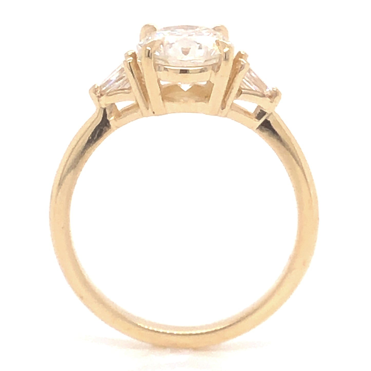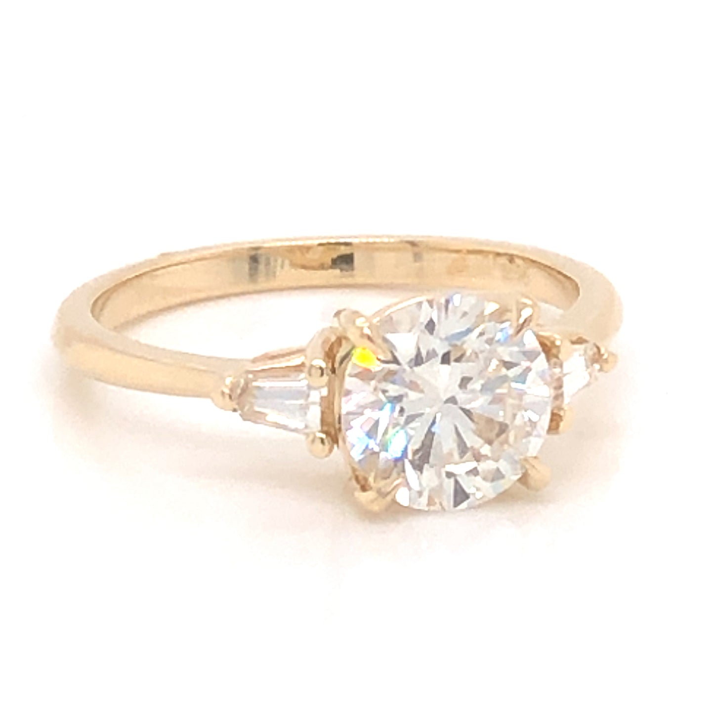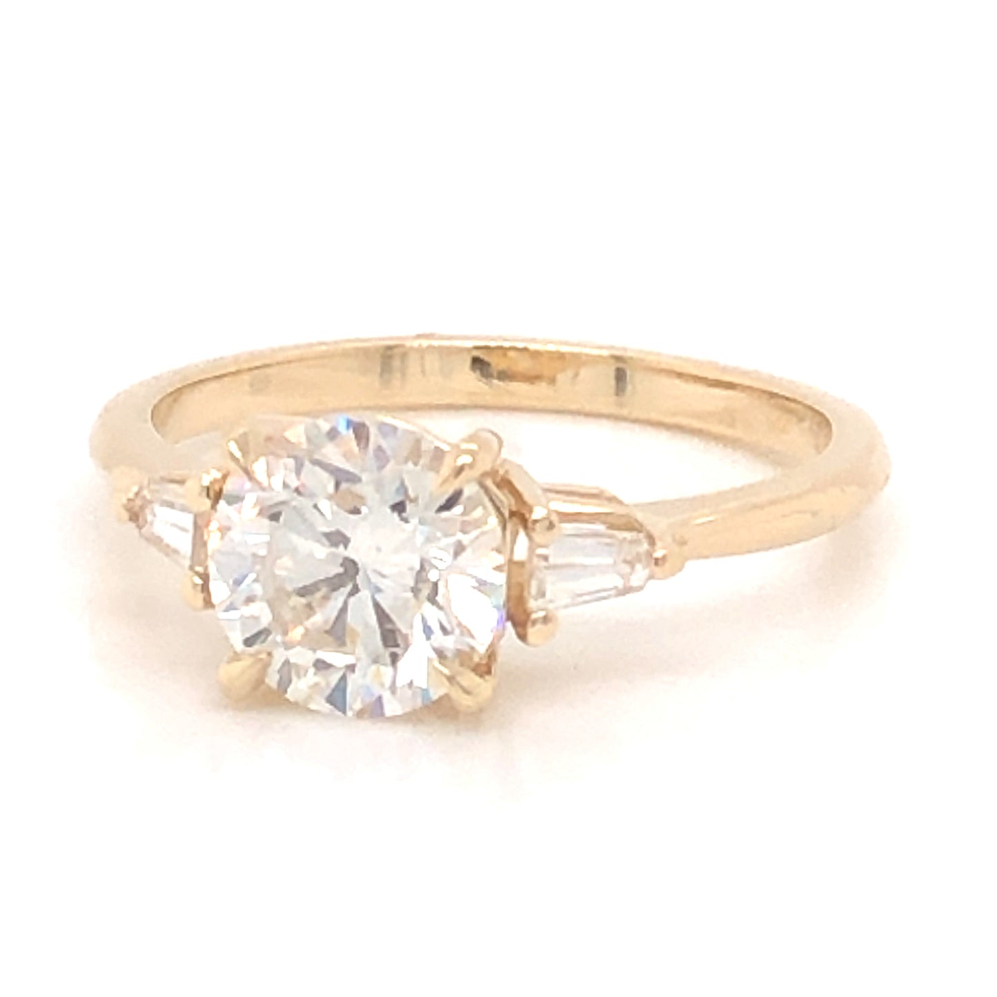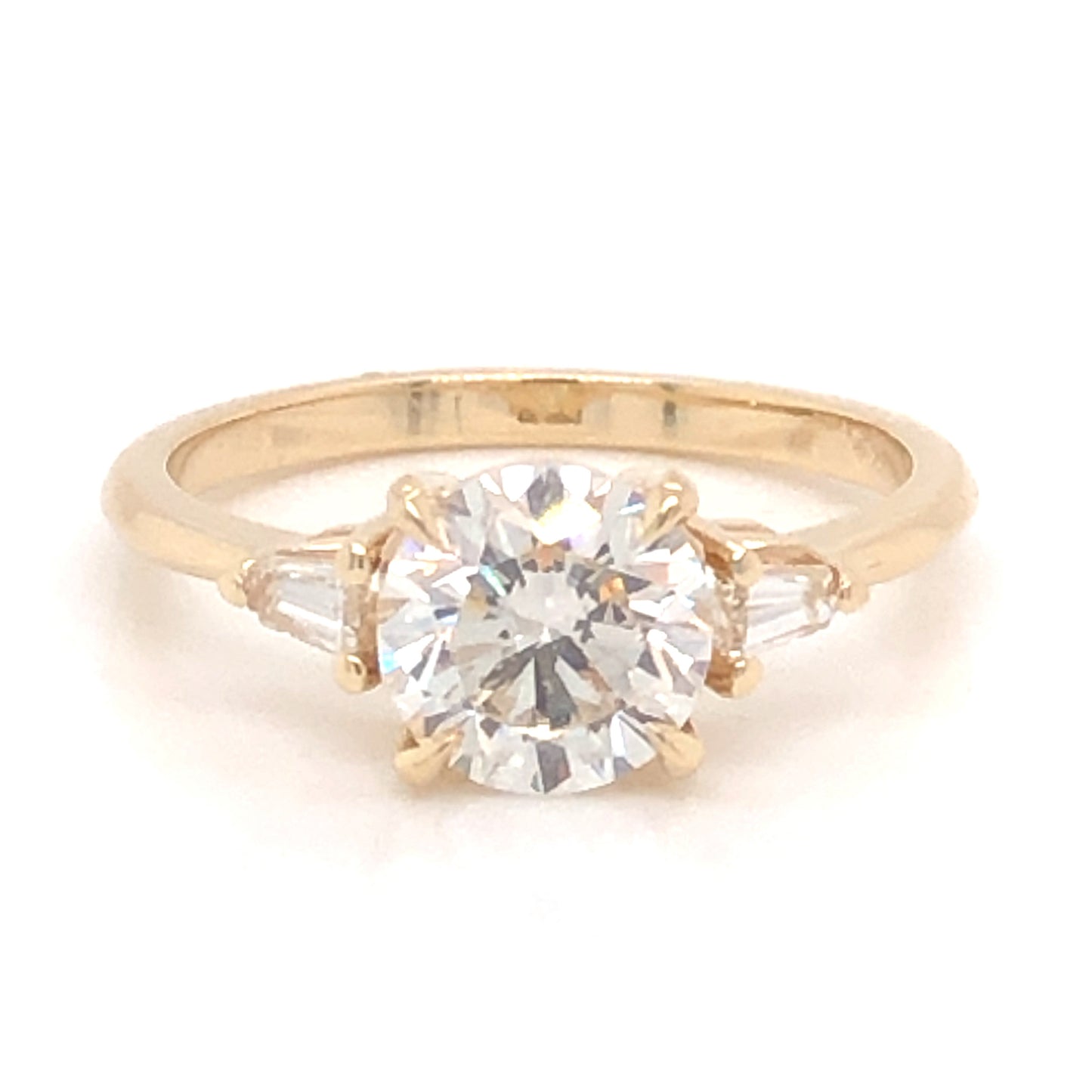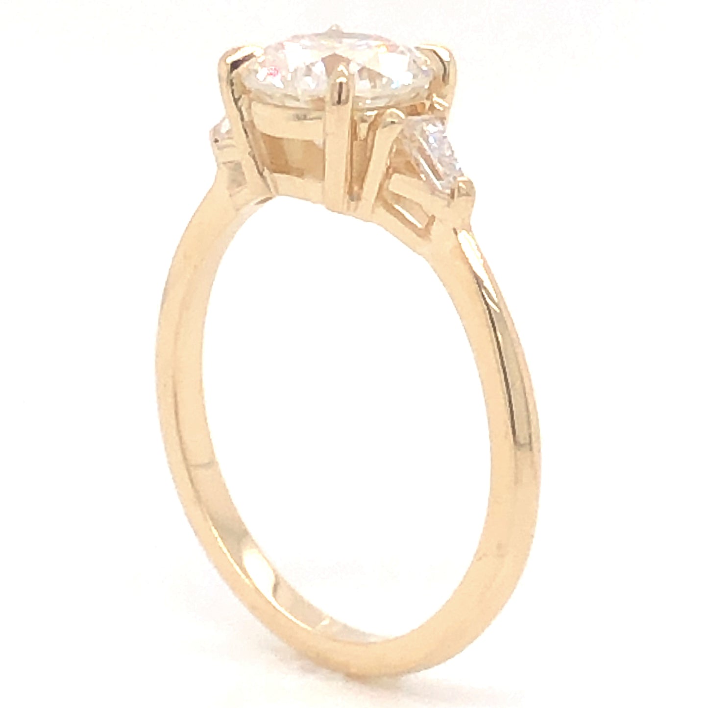 1.39 Diamond Engagement Ring in 14K Yellow Gold. Take your loved one’s breath away with this 1.39 carat diamond engagement ring in 14k yellow gold. The center stone is a 1.39 carat Round Brilliant cut diamond set in four prongs. Two (2) .08 carat bullet diamonds flank the center stone. The three diamonds are nearly colorless and have an impressive clarity rating. From the profile, a classic basket mounting supports the diamonds finished on a polished 14k yellow gold band.