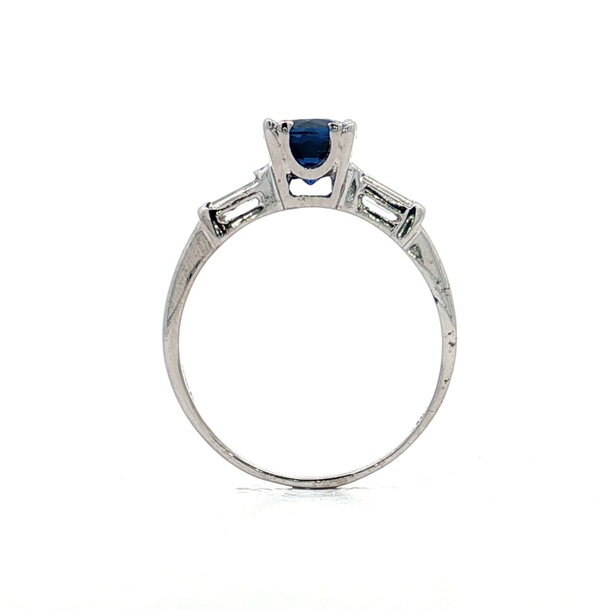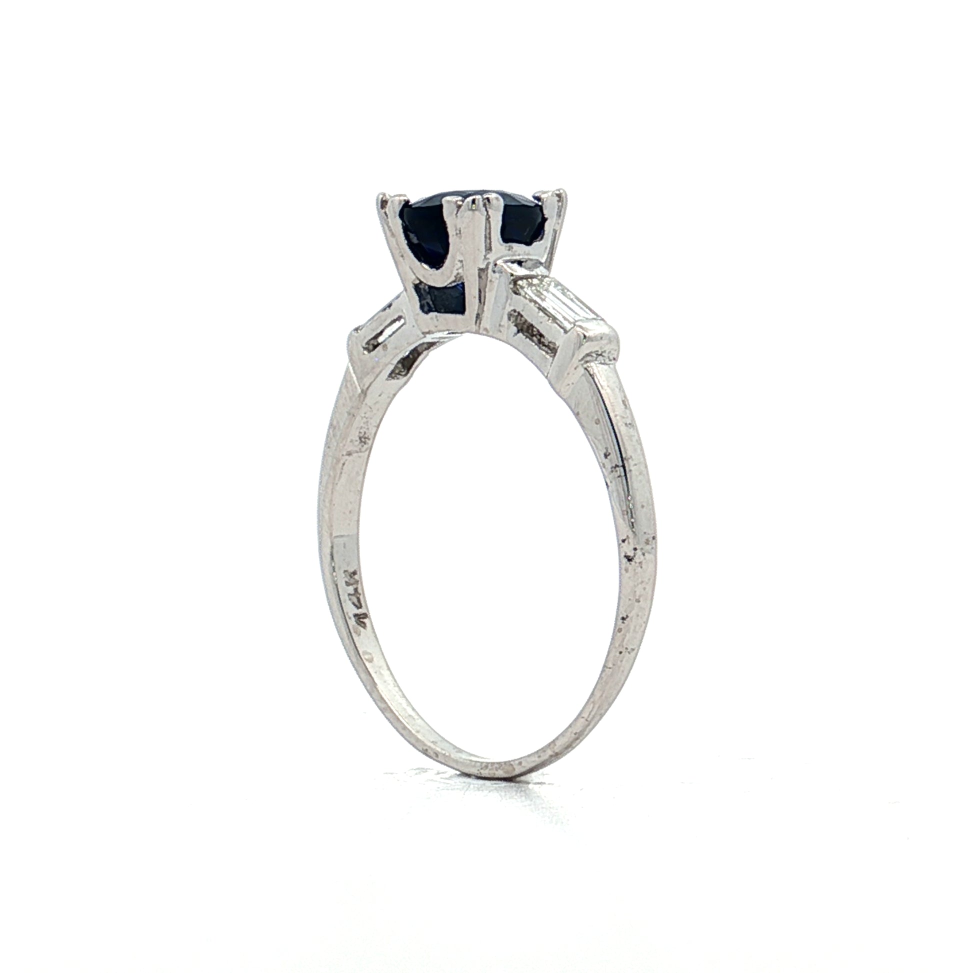 This Mid-Century three-stone engagement ring features a 1.39 carat round brilliant cut blue sapphire as its centerpiece, held by a fishtail prong setting. Two baguette cut diamonds, each weighing .11 carats and measuring 4.00 x 1.75 mm, flank the sapphire in bar settings. The 14 karat white gold setting provides durability while highlighting the deep blue hue of the sapphire and the natural brilliance of the .22 total carat weight diamonds.
