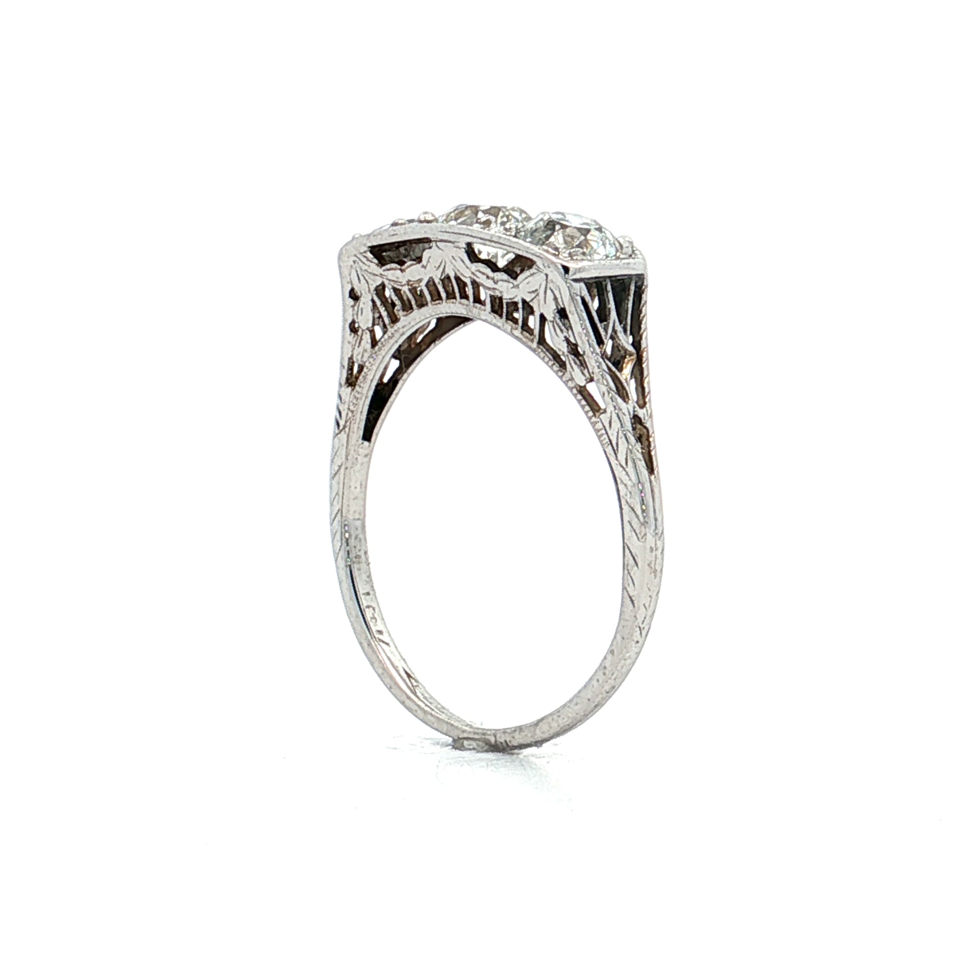 Two additional old European cut diamonds flank the center stone in a classic three-stone configuration. An ornate filigree gallery beneath the stones and hand-engraved details along the band showcase the intricate metalwork popular during the Art Deco period (1920s-1930s). The white gold setting provides a cool backdrop that was favored during this era for its modern appearance.