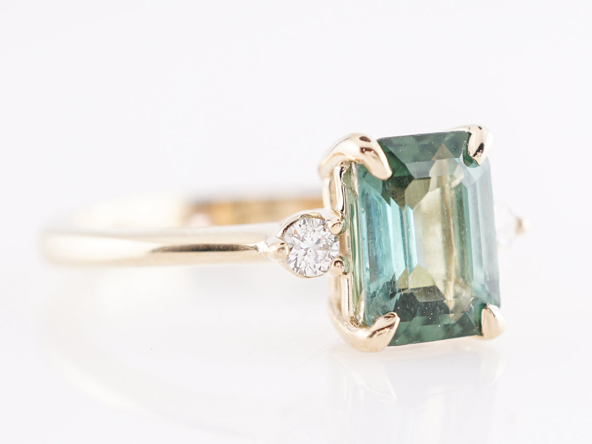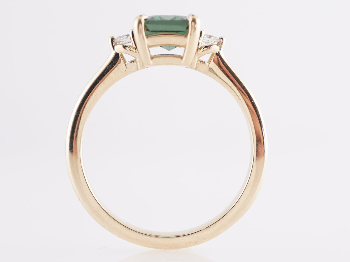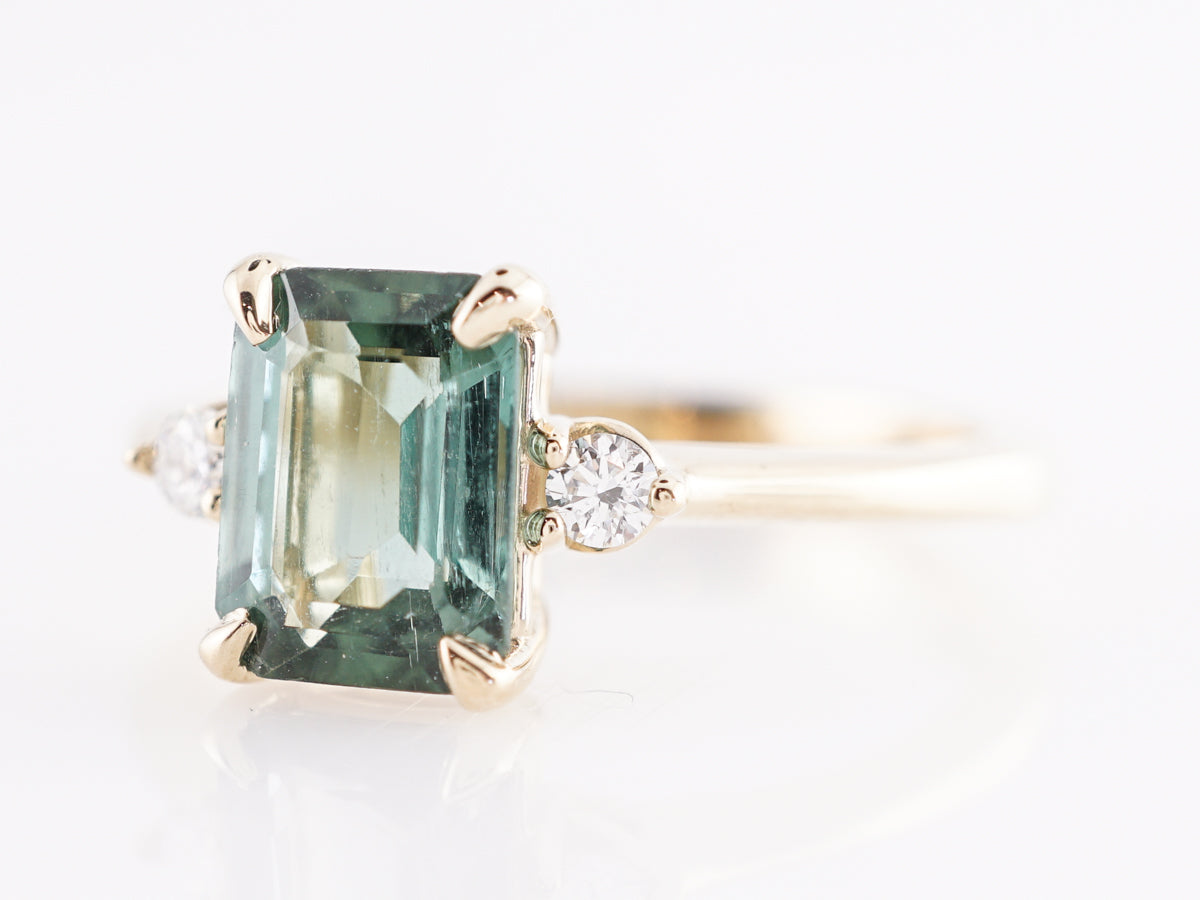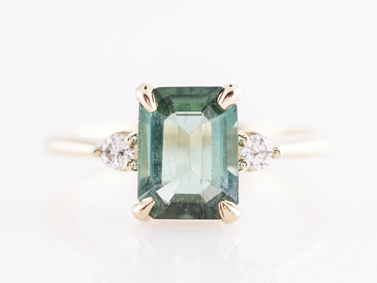 1.40 Tourmaline Engagement Ring in 14k Yellow Gold. This is a custom-made ring from Filigree Jewelers! This emerald cut tourmaline is a cool-toned, green stone nestled in four prongs. Two accent diamonds rest on either side of the tourmaline in a 14k yellow gold band. The setting of this engagement ring is a nouveau cathedral style, showcasing the primary stone from the profile. Need any assistance in resizing our one-of-a-kind engagement ring? Contact one of our jewelry experts and we’d be happy to assist you!