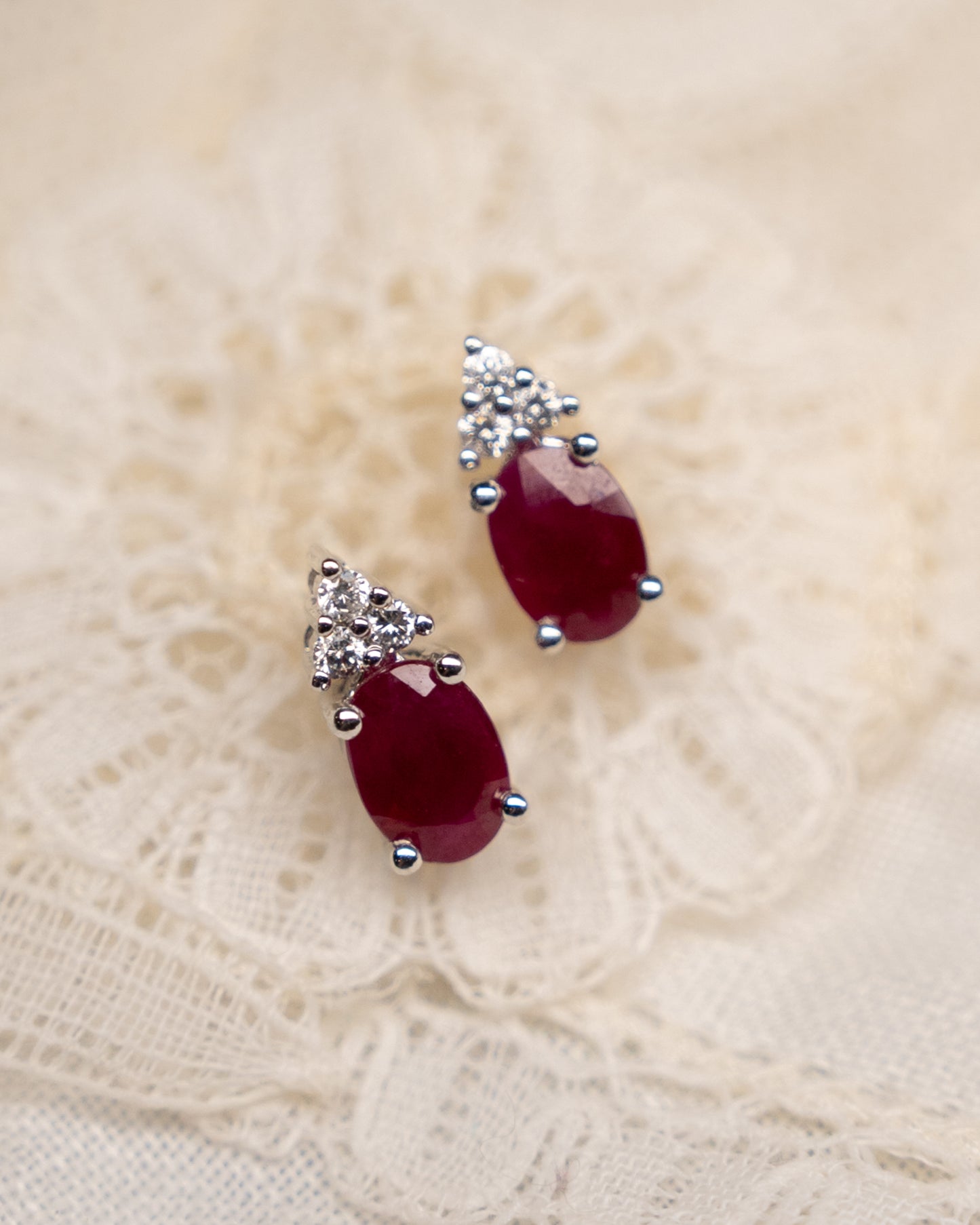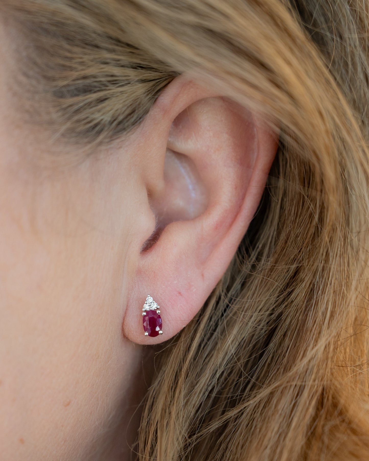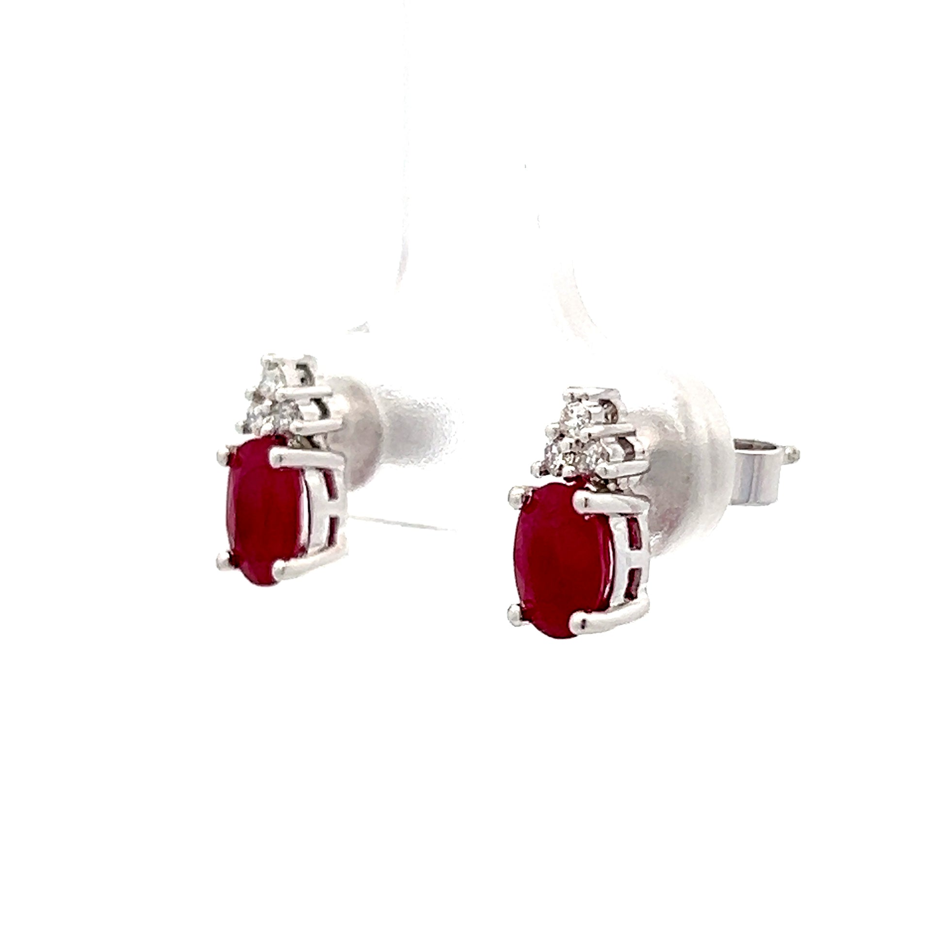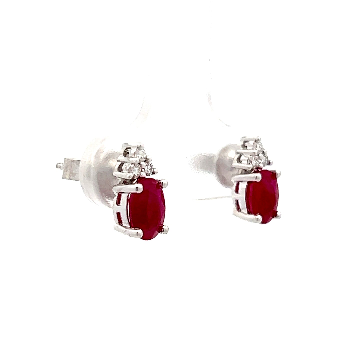 The oval ruby stud earrings feature 1.43 carats of deep red gemstones set in 14 karat white gold. Each ruby is surrounded by six round brilliant cut diamonds measuring 1.5mm and weighing .015 carats each, for a total diamond weight of .09 carats. The diamonds are prong set around the rubies, creating a cluster design that highlights the rich color of the center stones. These earrings have secure push backs for comfortable wearing. The white gold and ruby combination offers a striking color contrast that works for many different occasions.