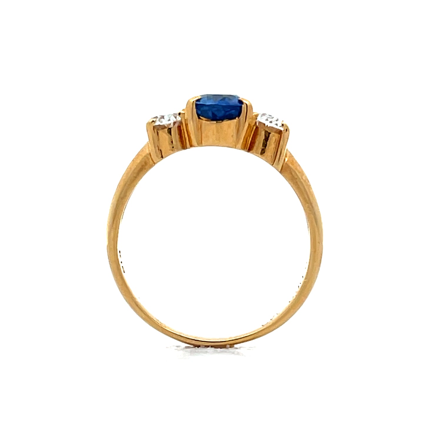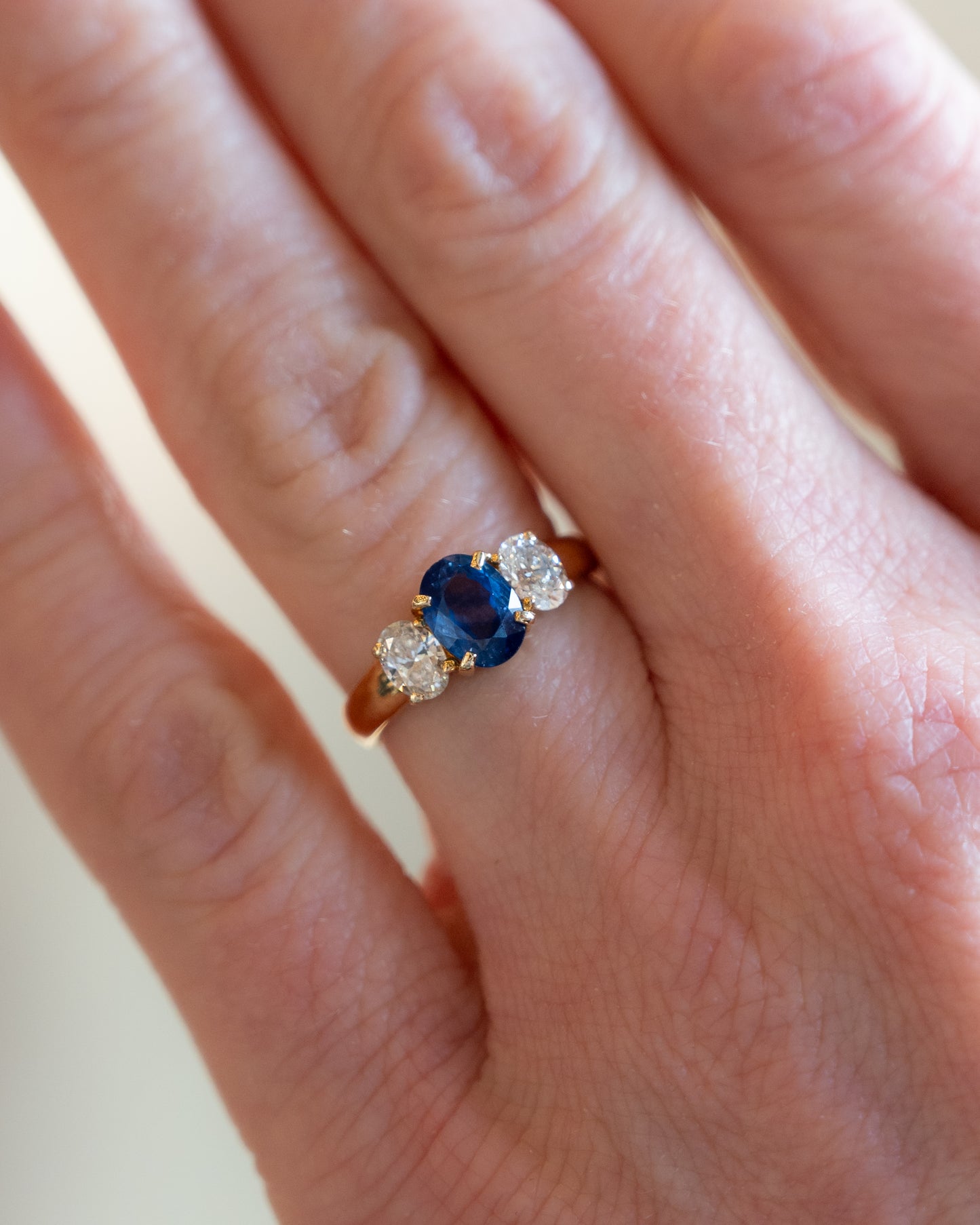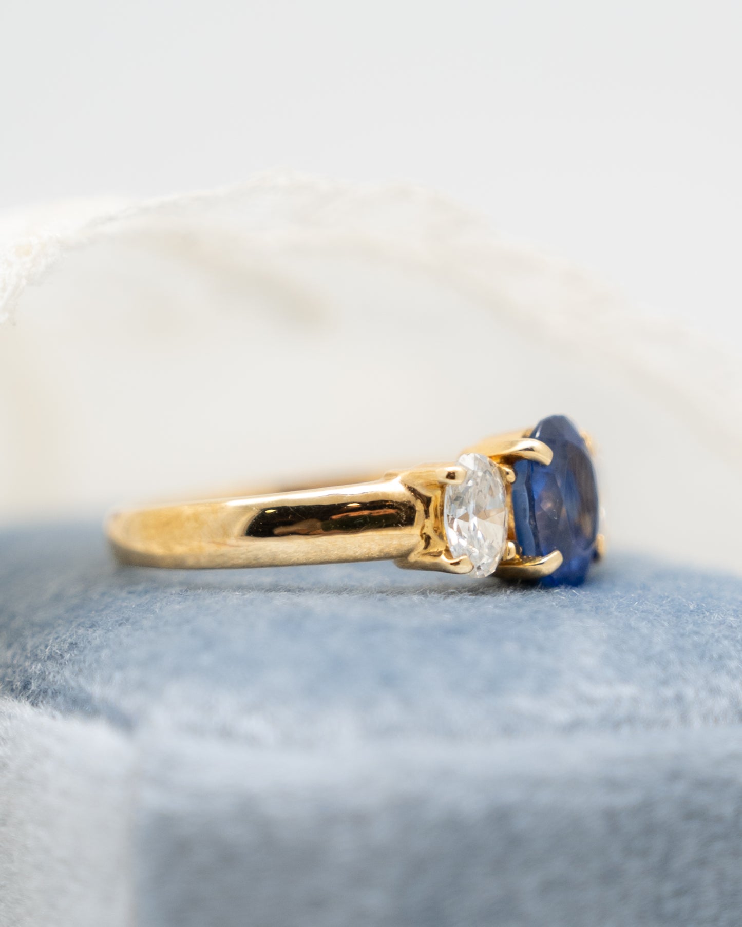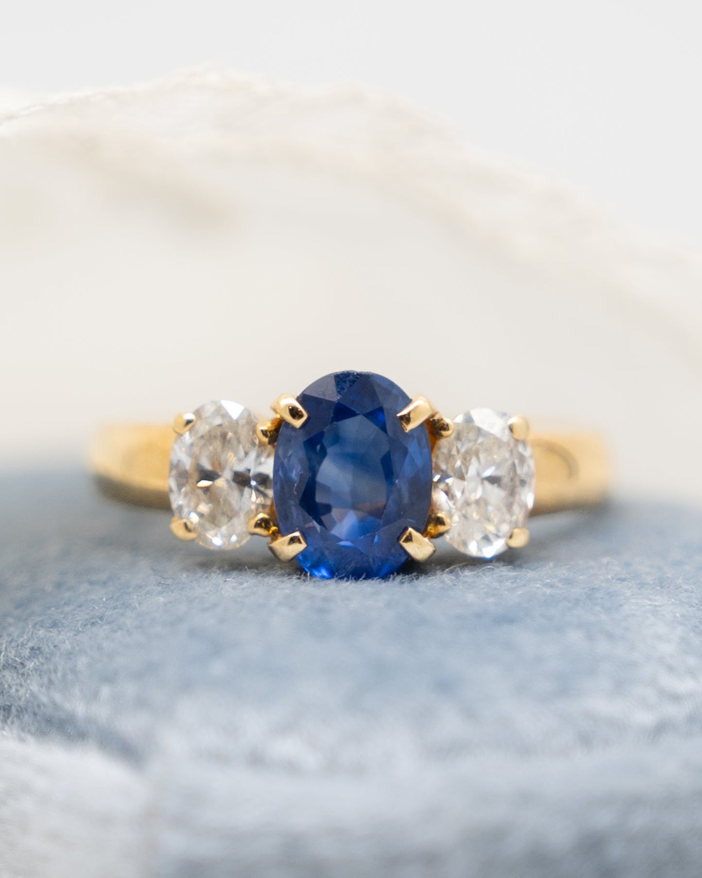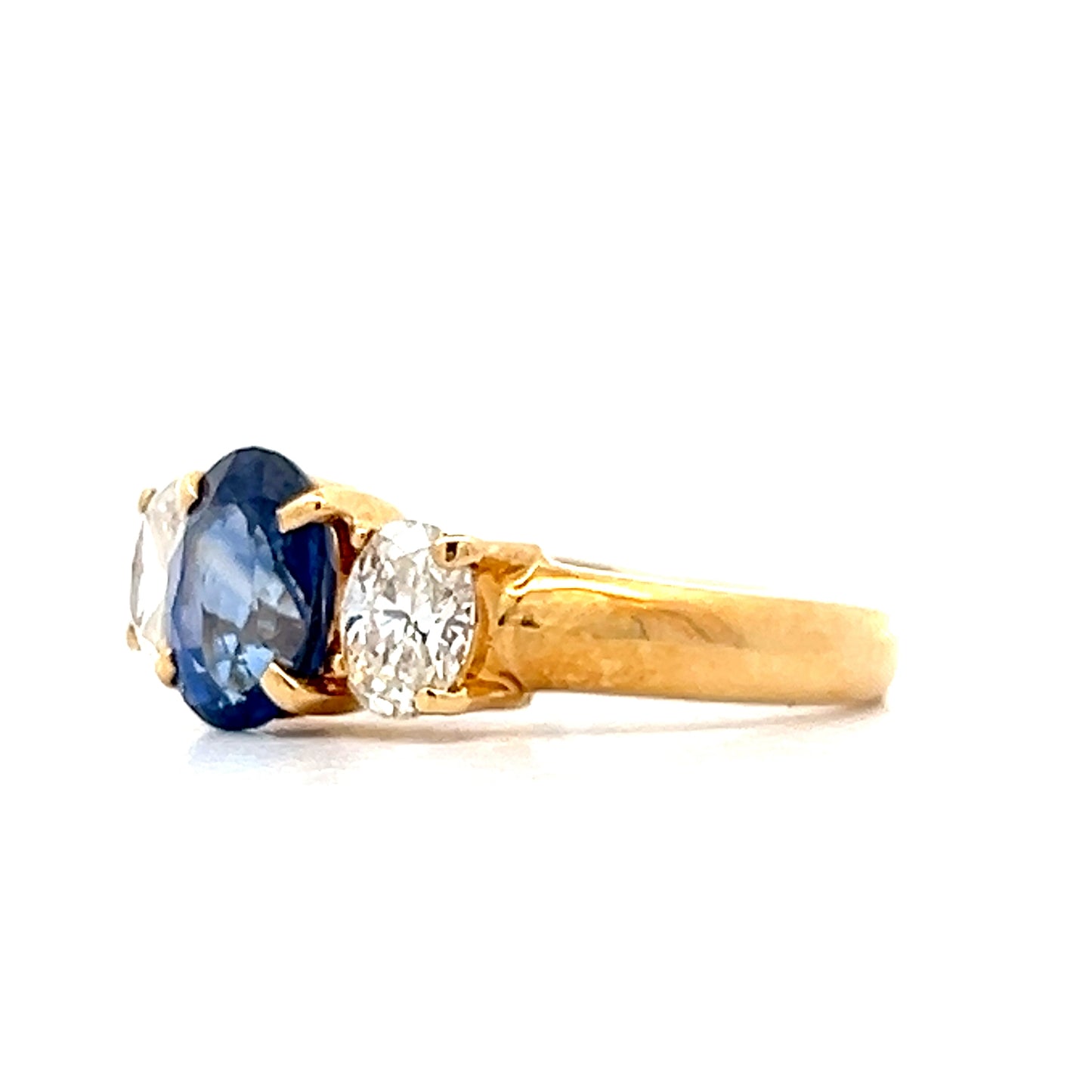 The blue sapphire displays a rich color that stands out against the sparkling diamonds and warm yellow gold band. The oval shapes of all three stones work together to create a cohesive design that combines the deep blue sapphire with clear diamonds.