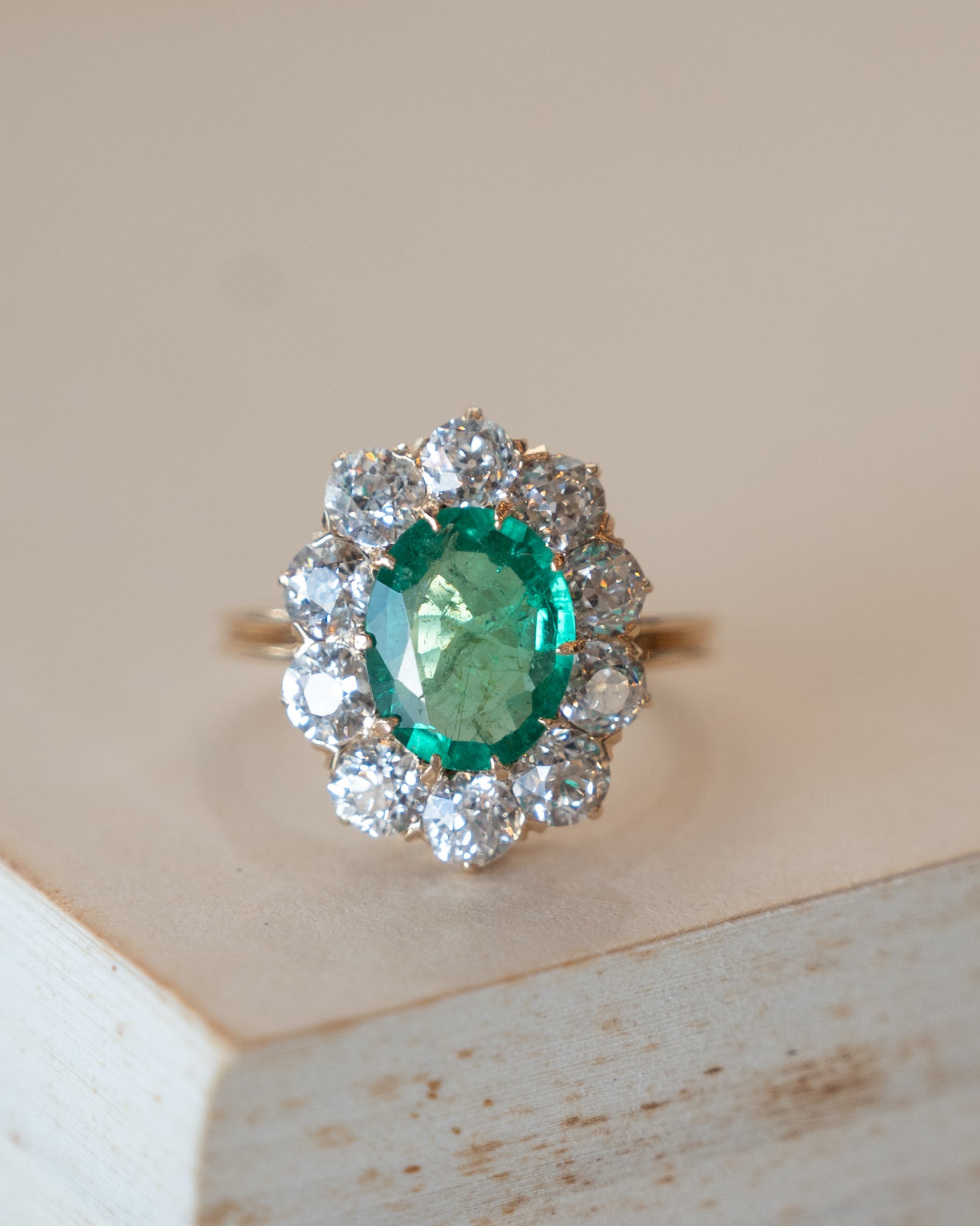 The diamonds encircle the emerald, creating a cluster effect that is just as mesmerizing as it is unique. The ring is crafted in 14 karat yellow gold, providing a radiant contrast to the emerald's rich green tone. The band showcases a distinctive ridge shank, a nod to the intricate designs of the Victorian era.